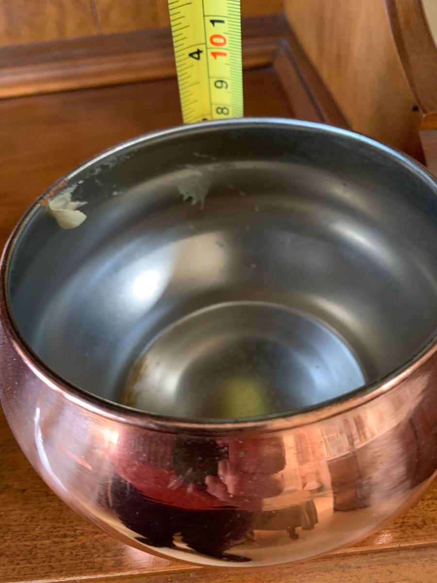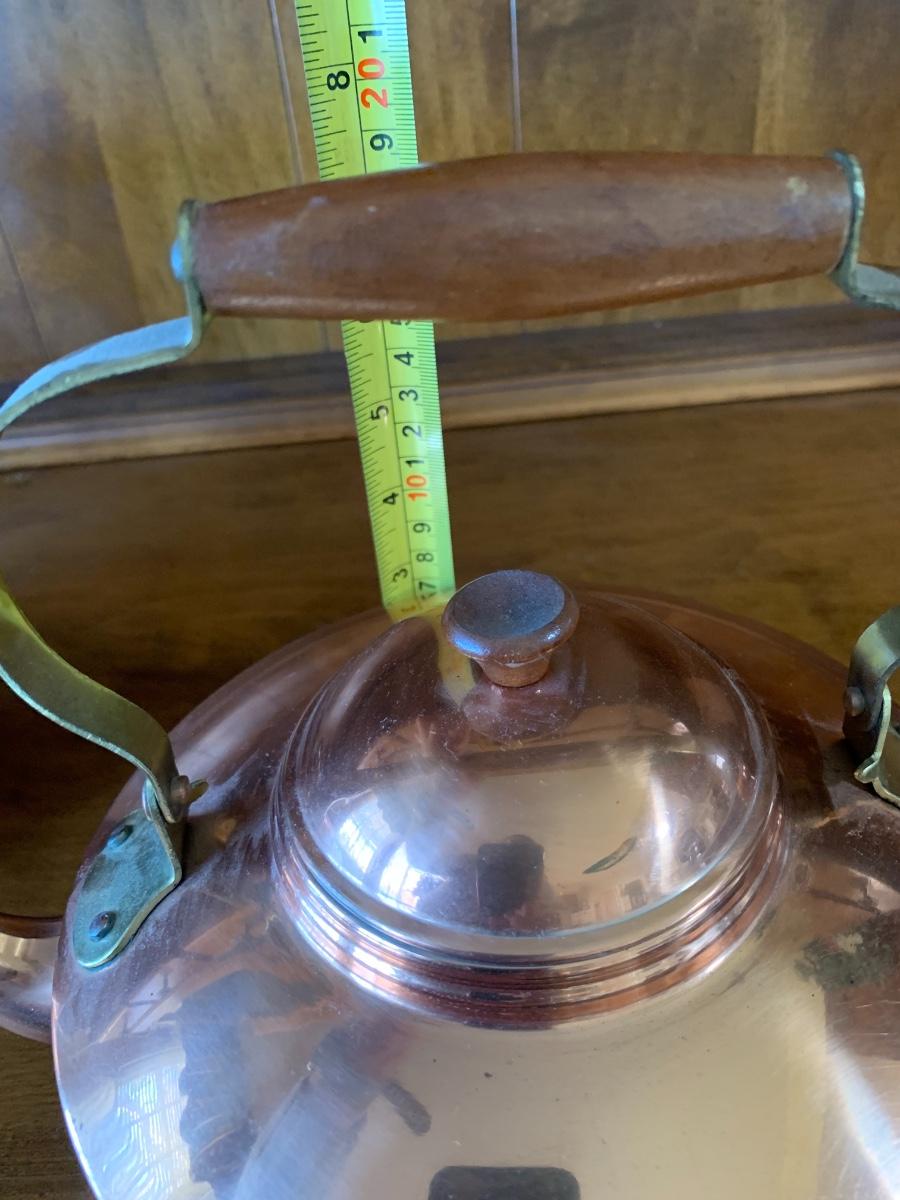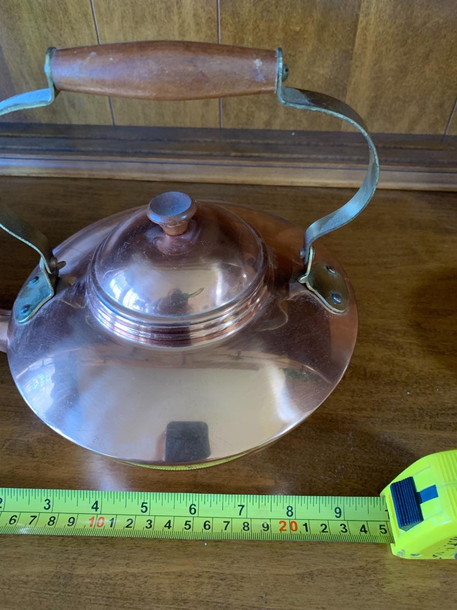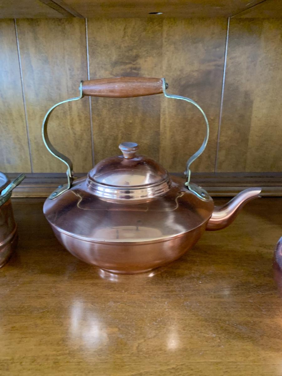 group of collectible copper. Decorative teapot made in Portugal, 2 'bowls' and oval hammered metal planter.