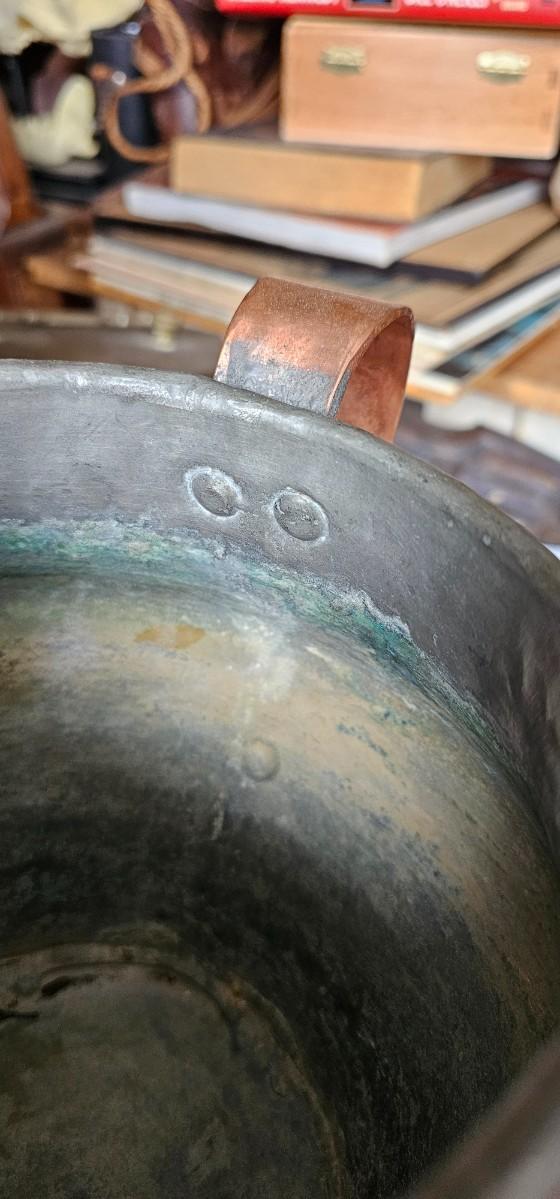 2) Pan with brass handle with Chicken Embossed on it, mold, Folk Rooster, Great Patina. 8" without the handle
