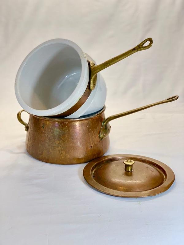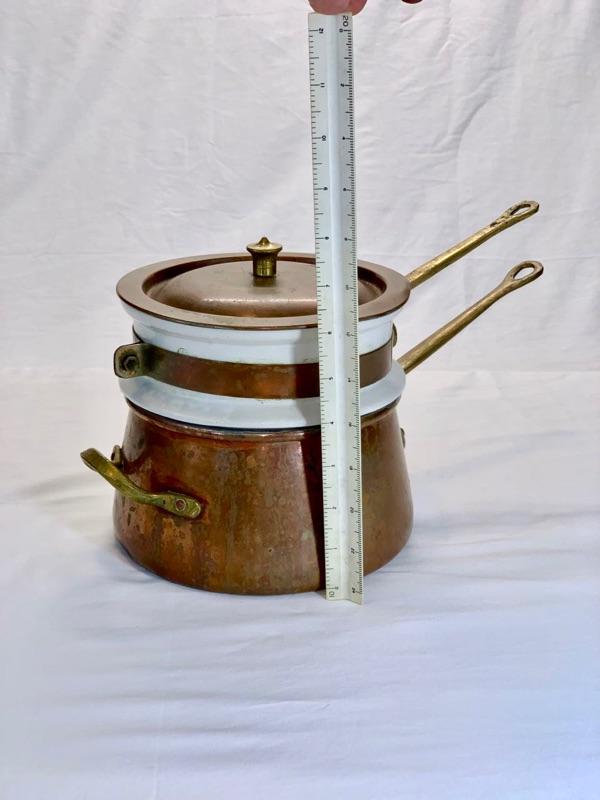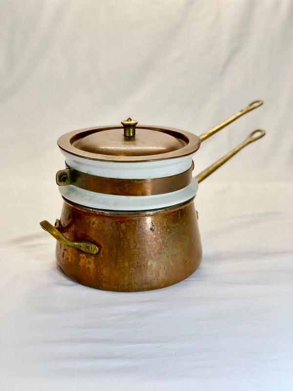 Vintage Copper Ceramic Double Boiler with brass handles, good condition needs to be cleaned. Local pickup only.