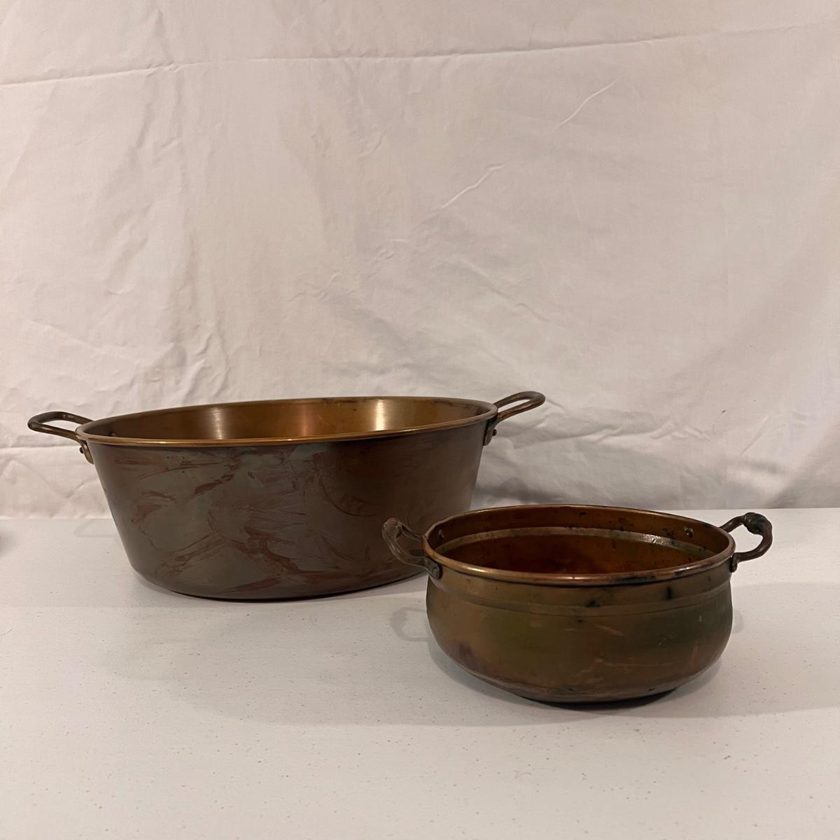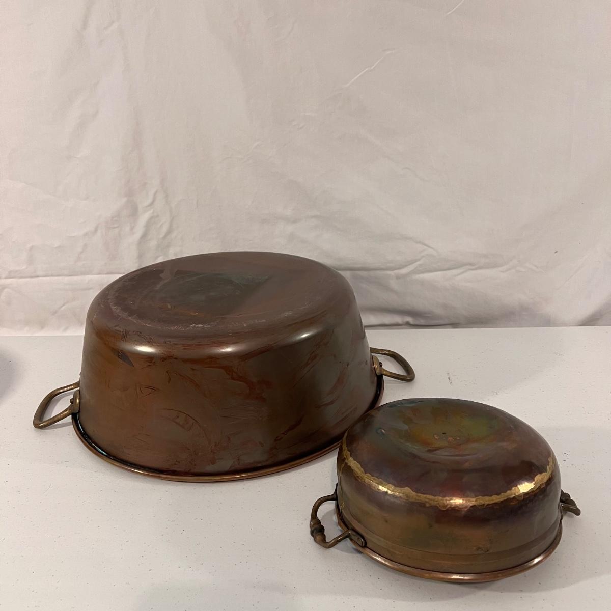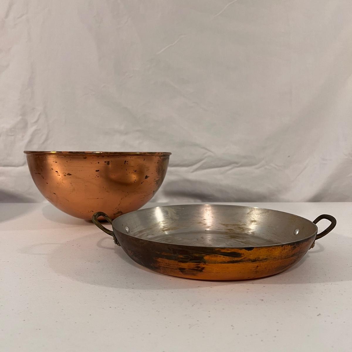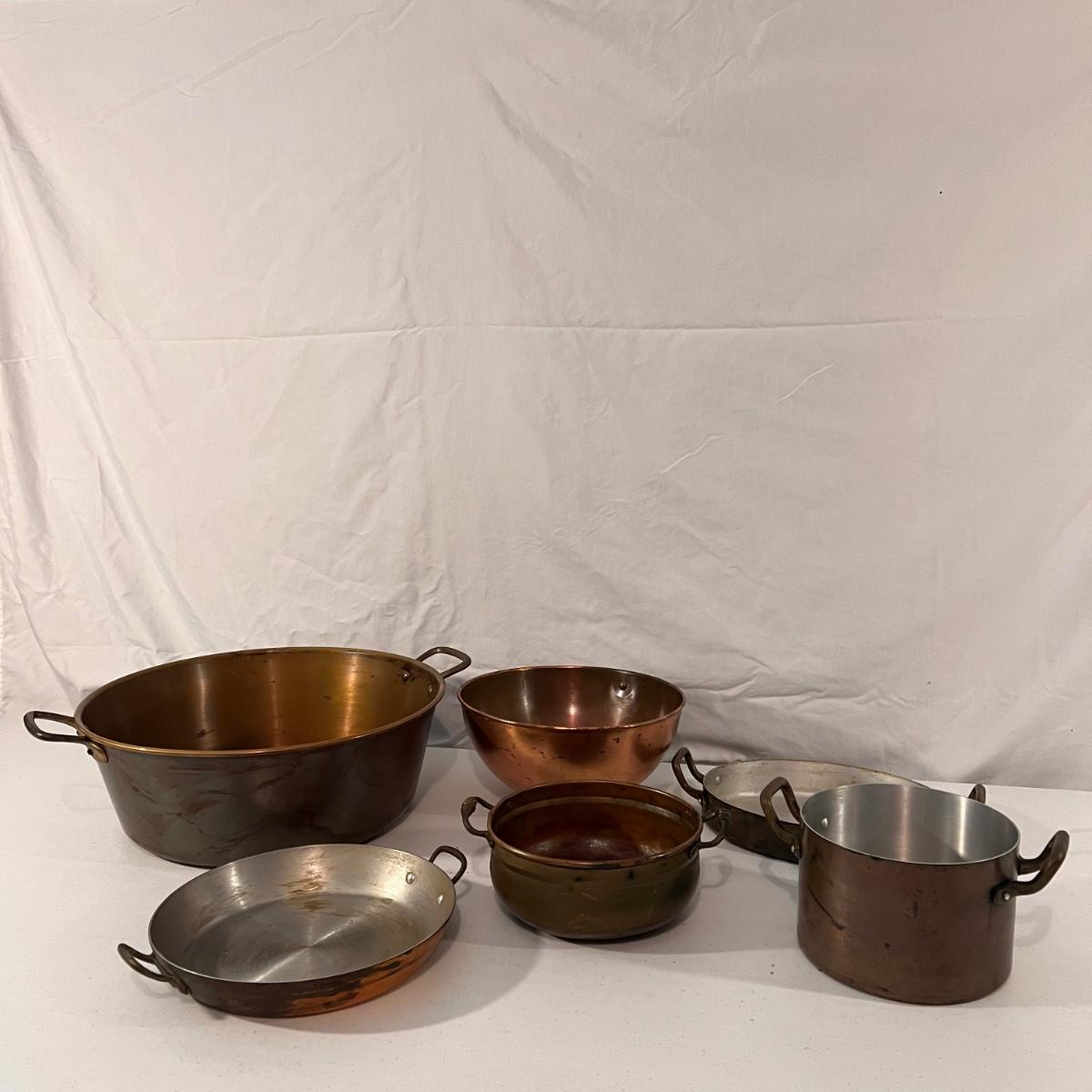 Lot includes six pieces of copper kitchenware. There are five pots of various sizes and one mixing bowl. The largest pot measures 15”D x 5”H. All items are tarnished due to age. Two of the items appear to be made in France. Shipping available.