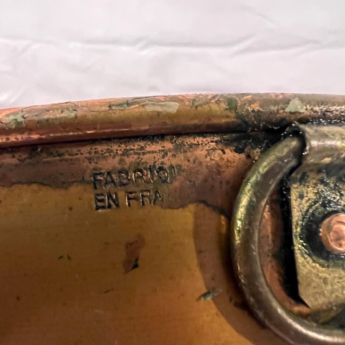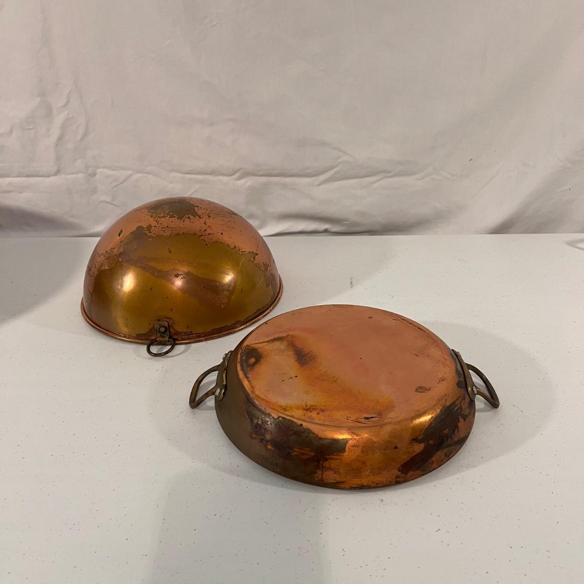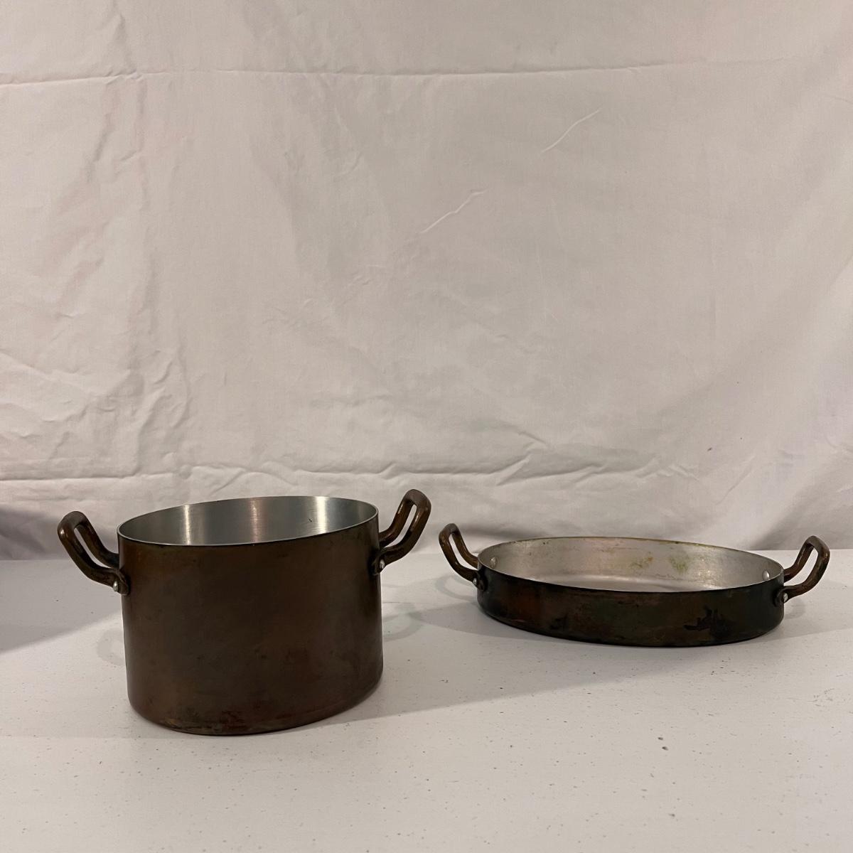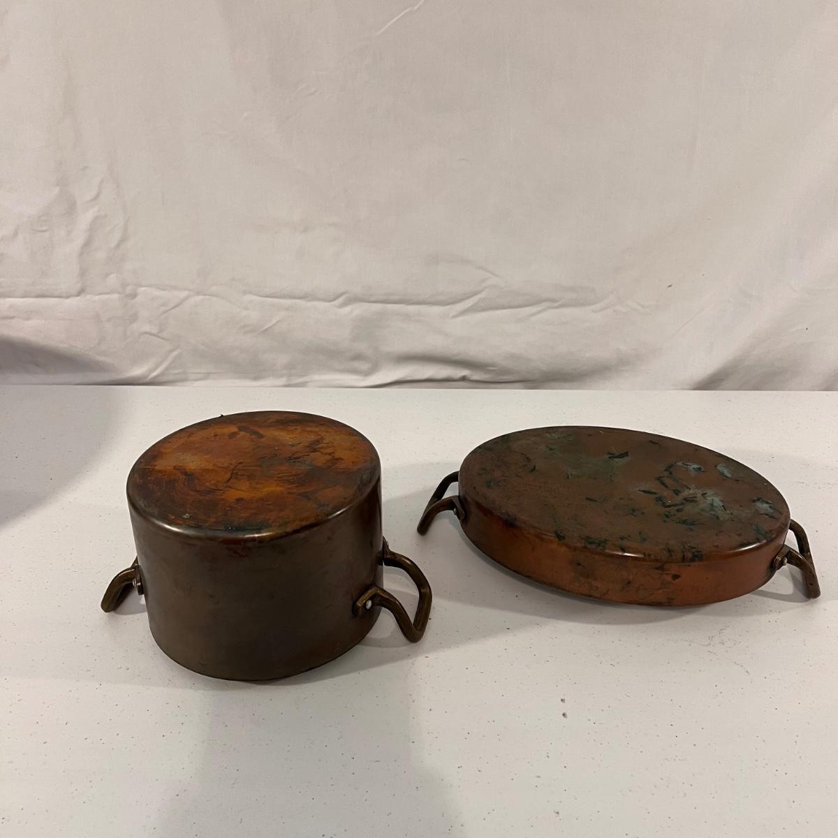 Lot includes six pieces of copper kitchenware. There are five pots of various sizes and one mixing bowl. The largest pot measures 15”D x 5”H. All items are tarnished due to age. Two of the items appear to be made in France. Shipping available.