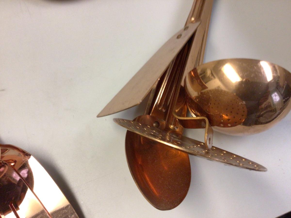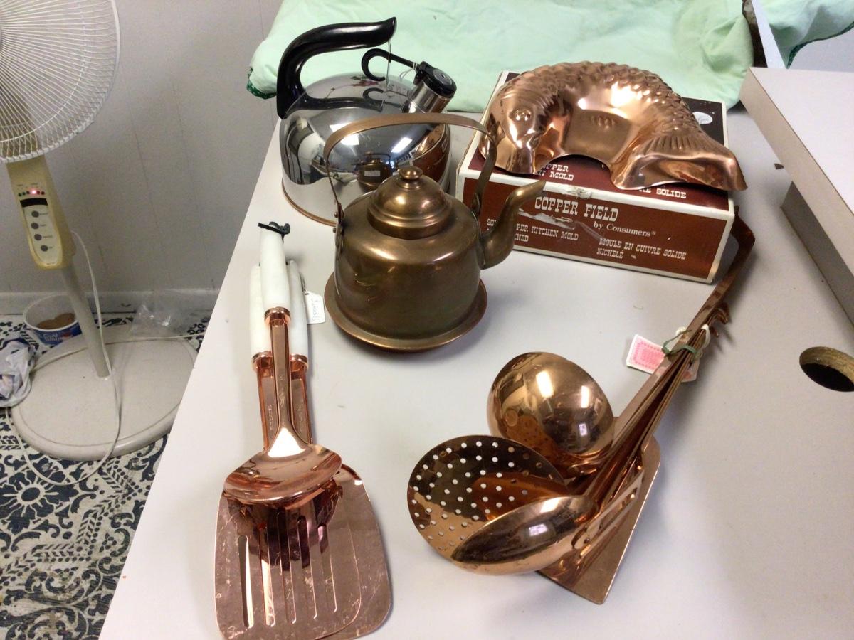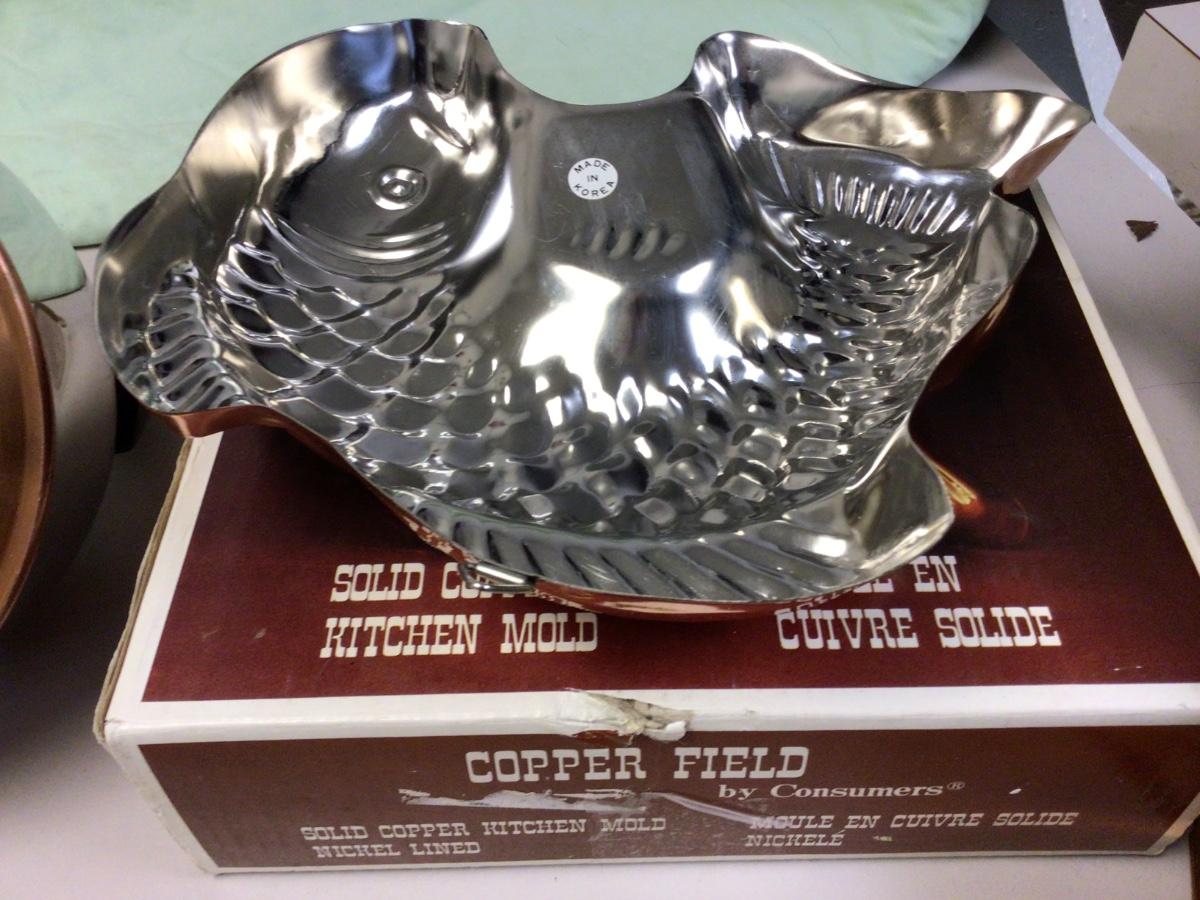 You get copper bottom tea pot, copper tea pot, copper fish mold in original box, two sets of copper intensiles. Very nice.
