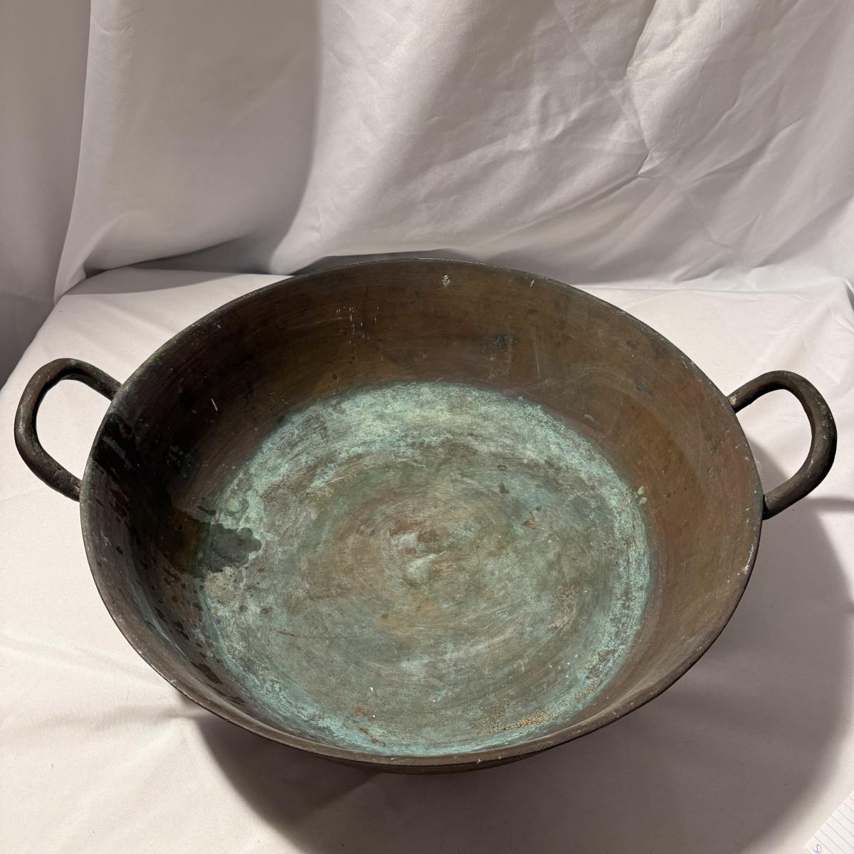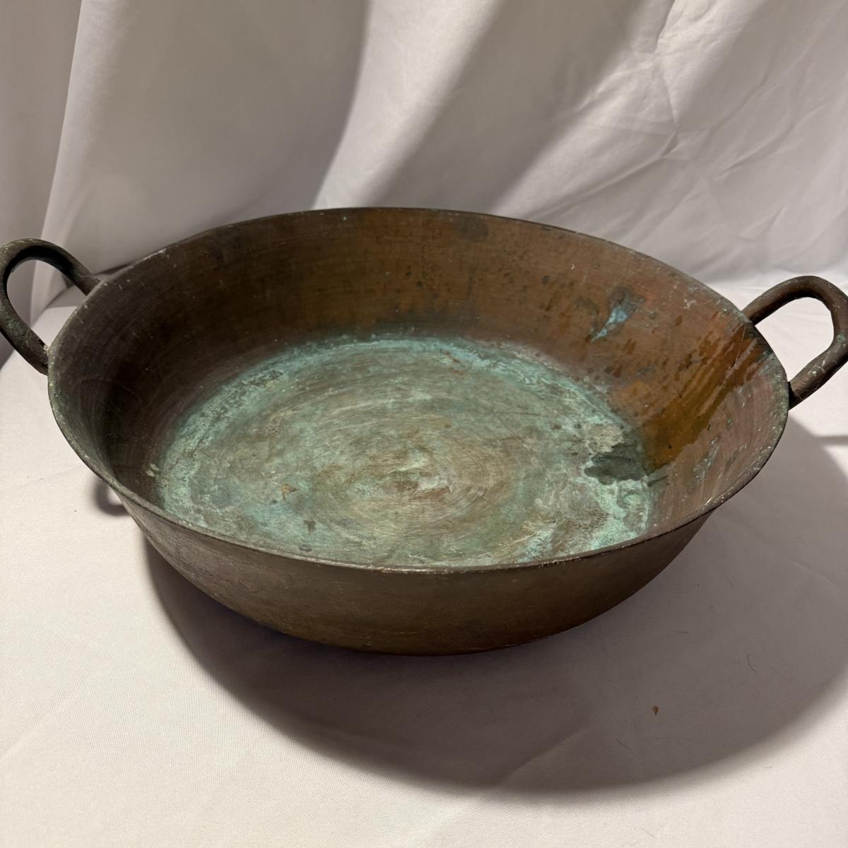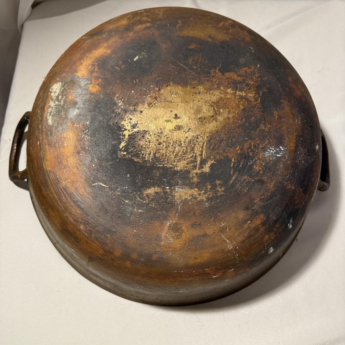 This lot contains a large what appears to be copper paella pot. This gorgeous piece measures 21”D x 5”H and is heavy! There is a bit of discoloration in the base. Local pick up only.