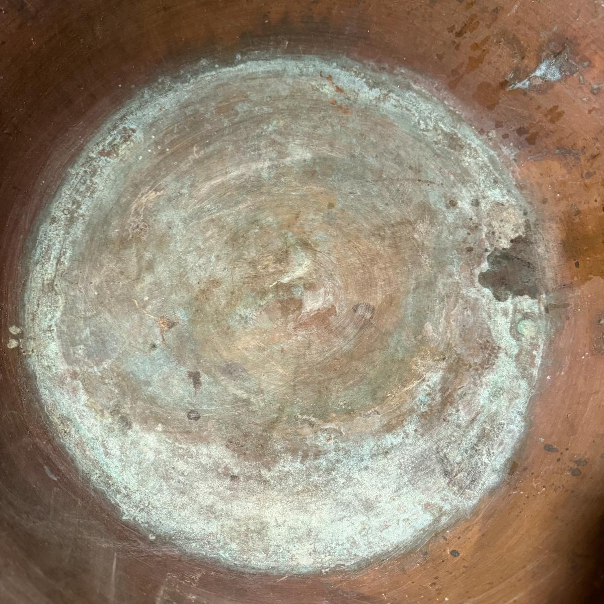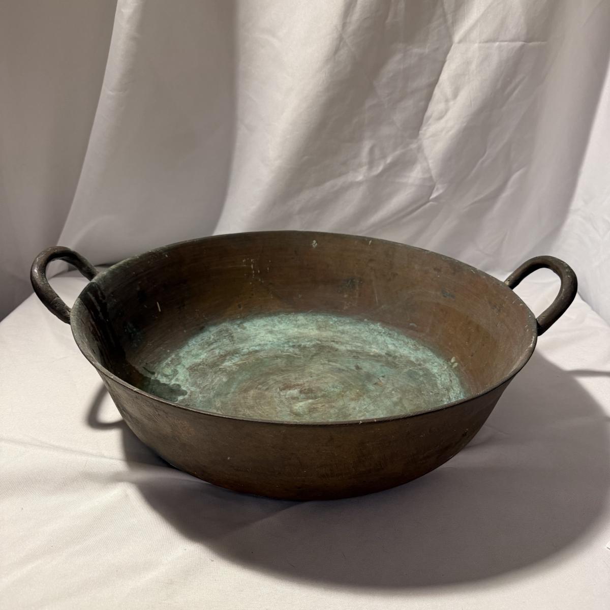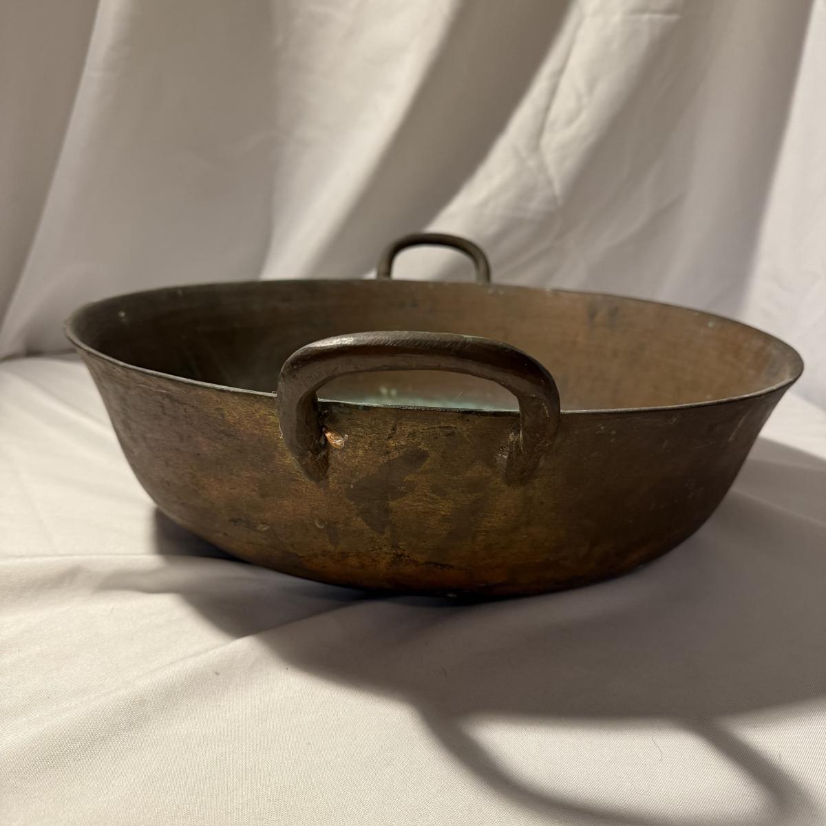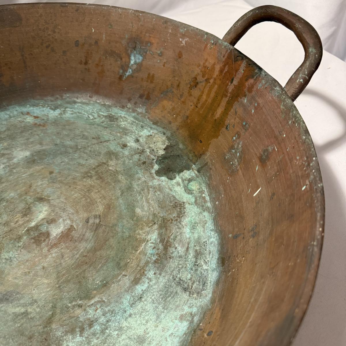 This lot contains a large what appears to be copper paella pot. This gorgeous piece measures 21”D x 5”H and is heavy! There is a bit of discoloration in the base. Local pick up only.