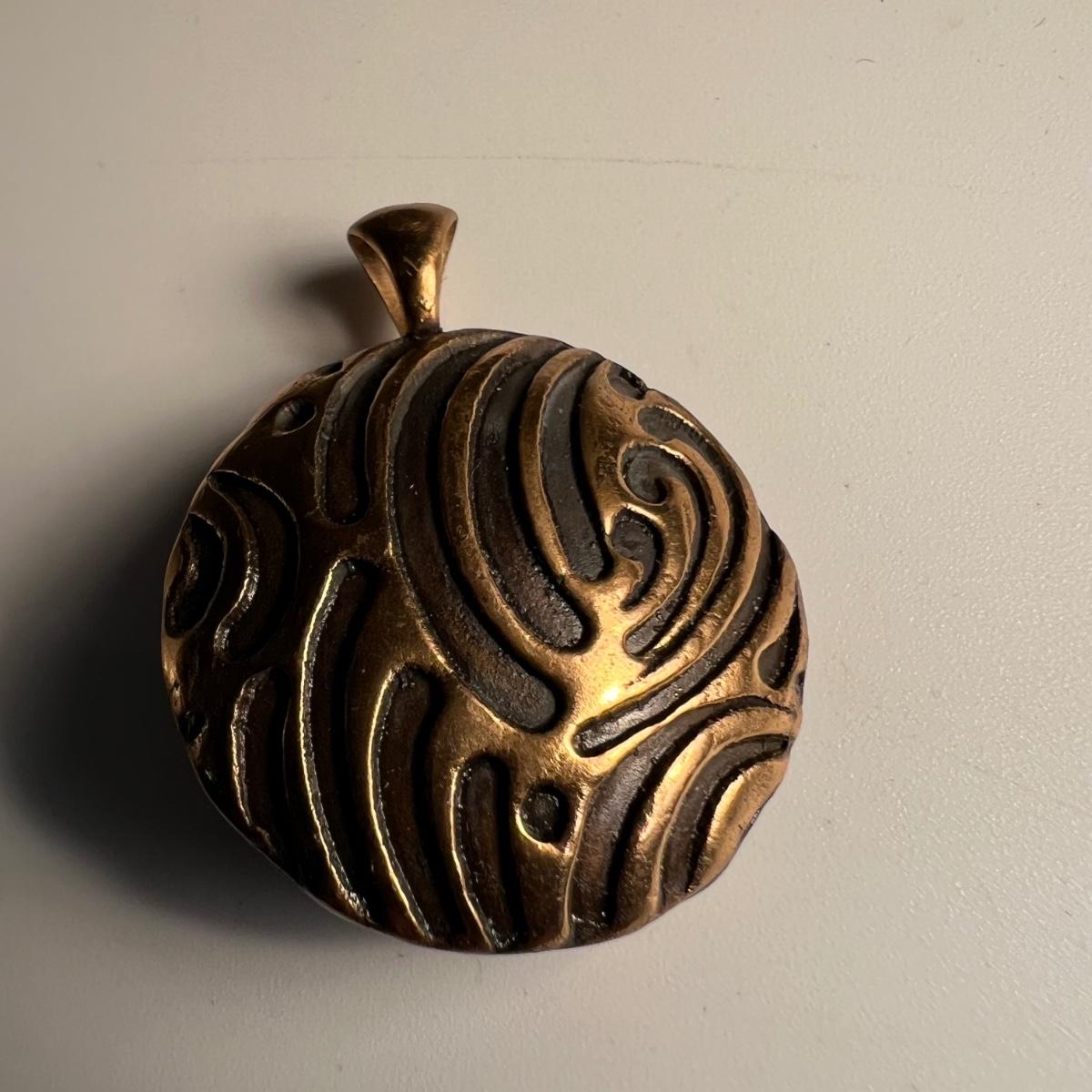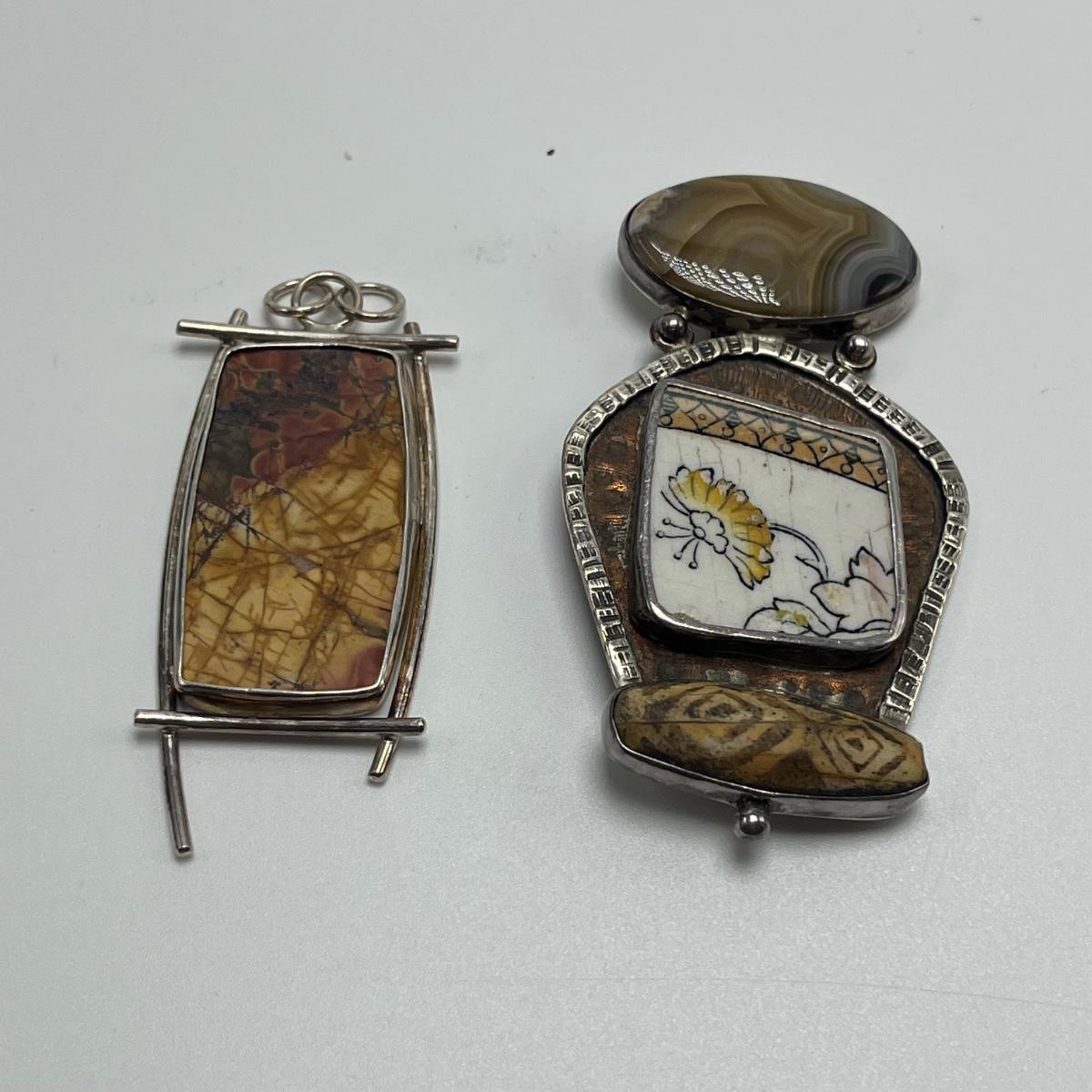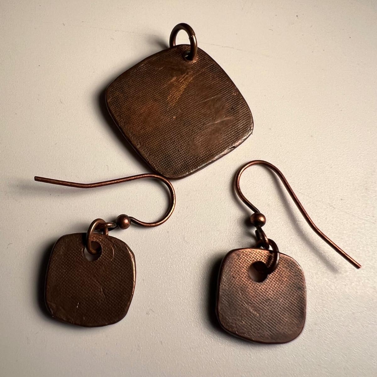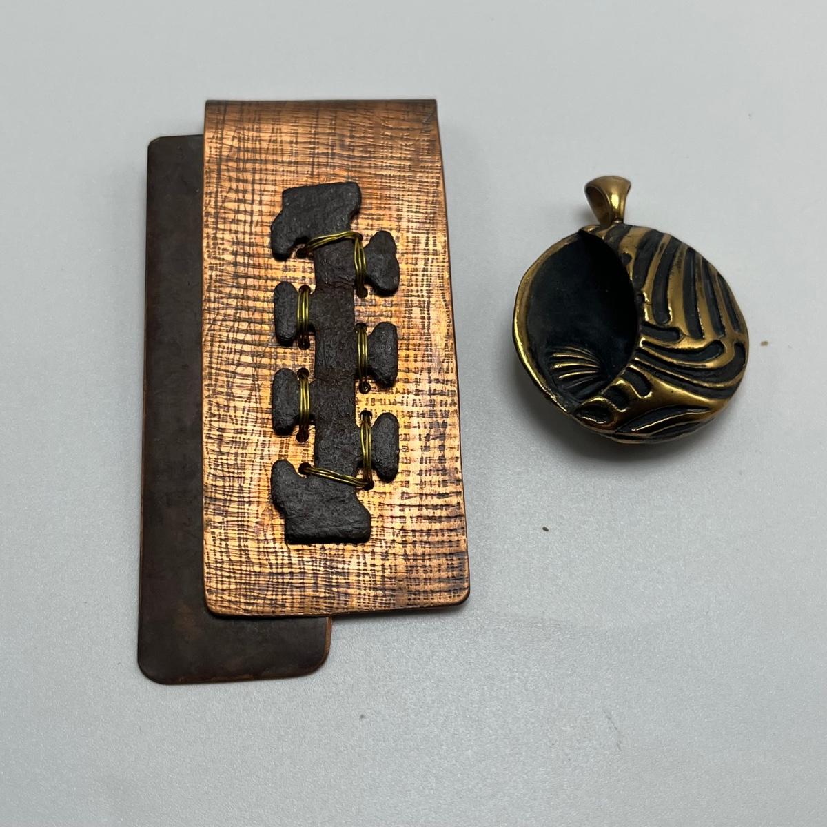 Lot includes a copper colored pendant with matching earrings, a unique rectangular copper pendant, two hand shaped pendants, a copper and stone pin with floral motif, a brass colored round pendant, and a rectangular pendant with a stone that is hand engraved 925 and 'Bauman' on the back. All sales are final. No returns or refunds. Please bid accordingly.