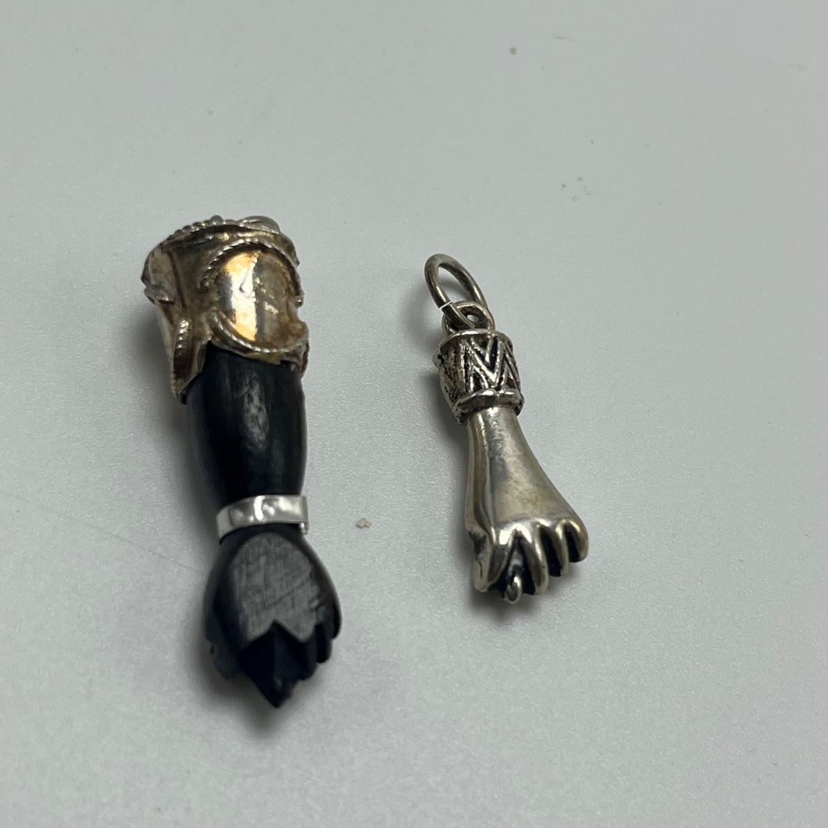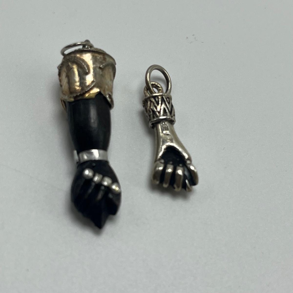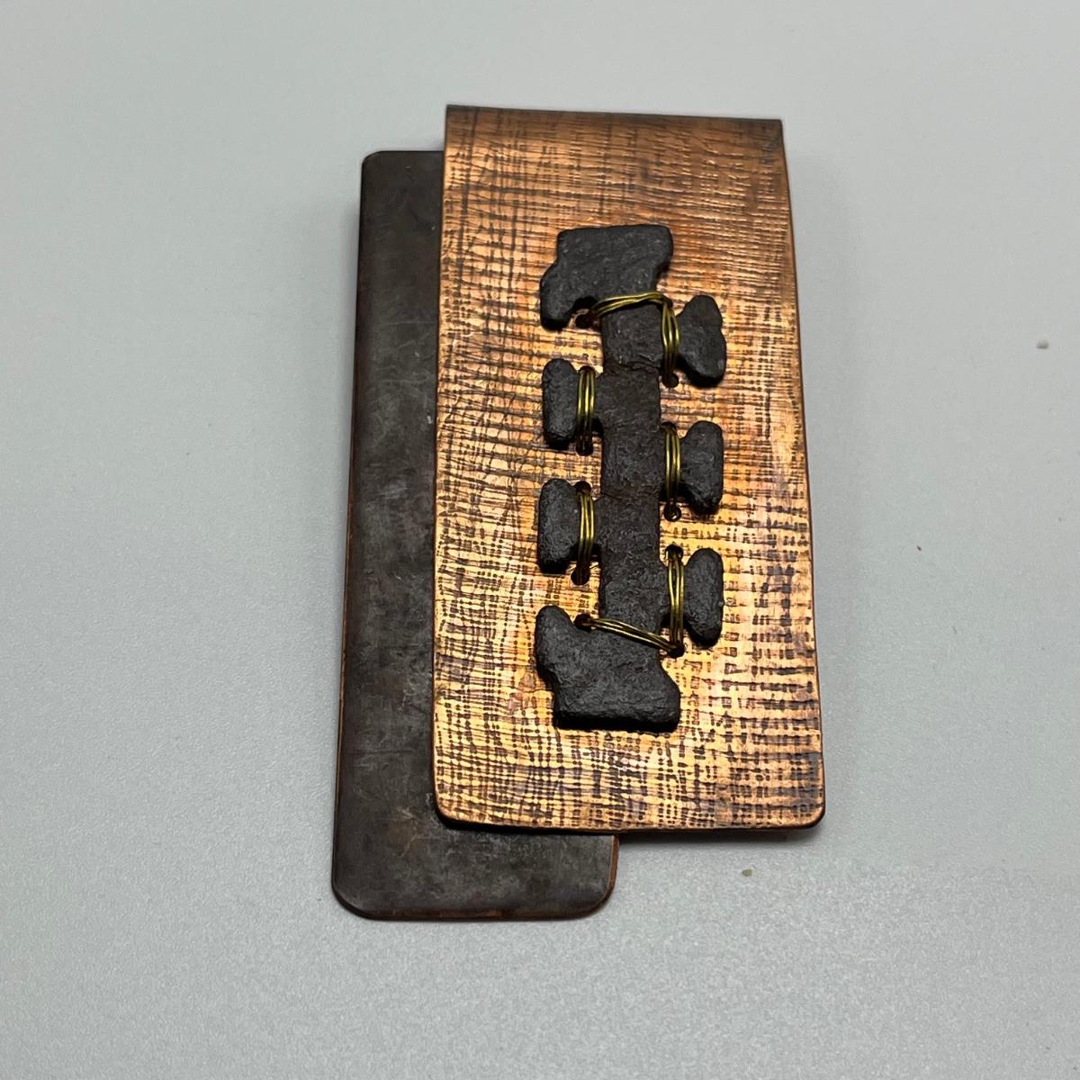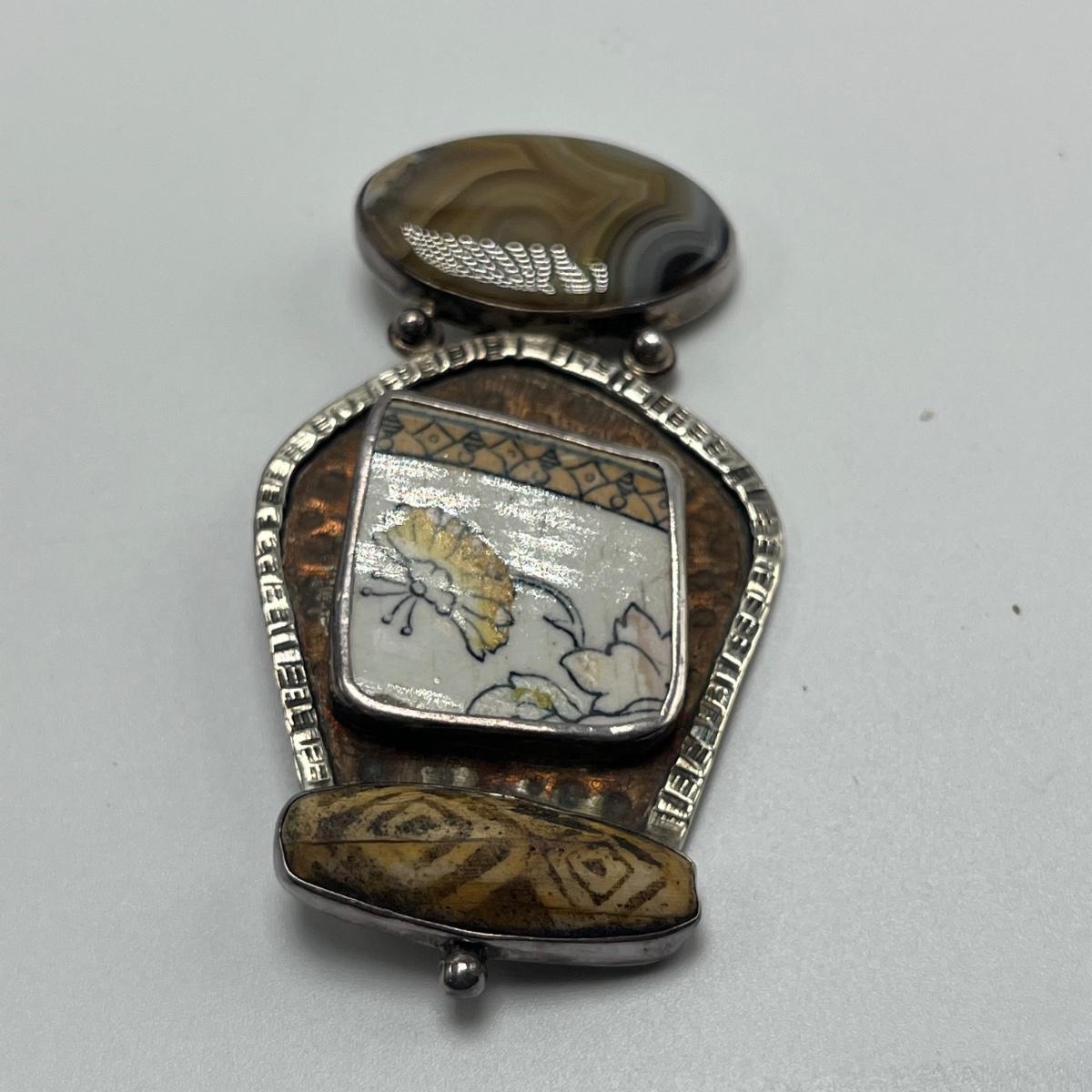 Lot includes a copper colored pendant with matching earrings, a unique rectangular copper pendant, two hand shaped pendants, a copper and stone pin with floral motif, a brass colored round pendant, and a rectangular pendant with a stone that is hand engraved 925 and 'Bauman' on the back. All sales are final. No returns or refunds. Please bid accordingly.