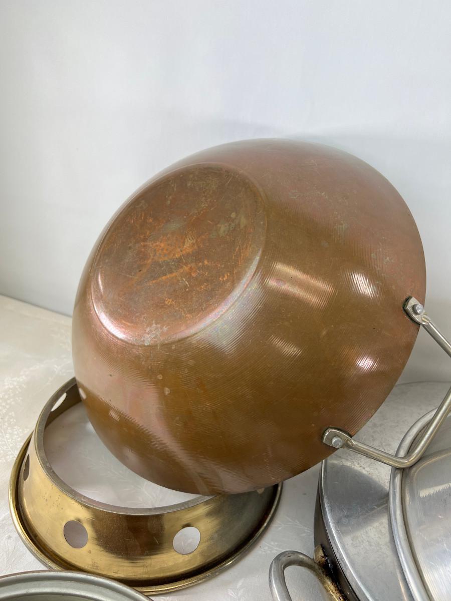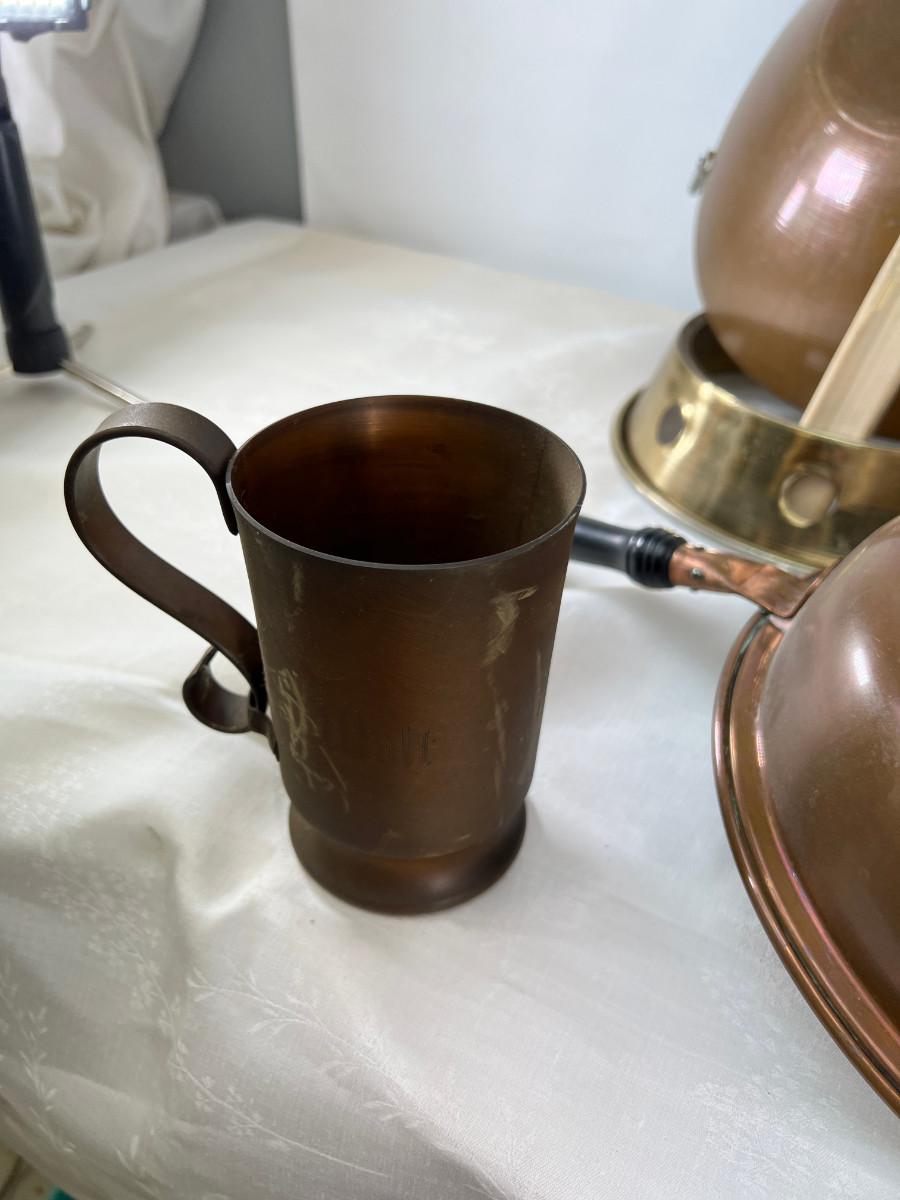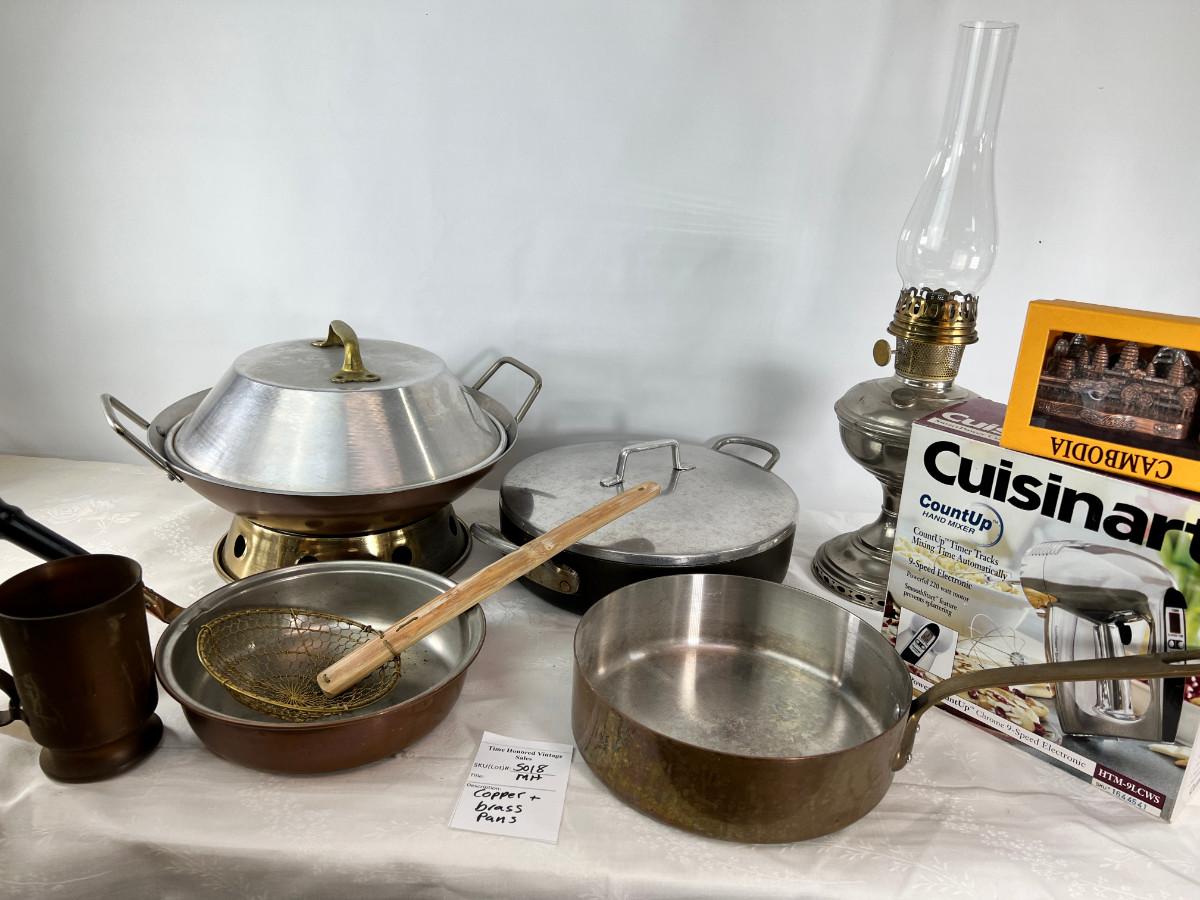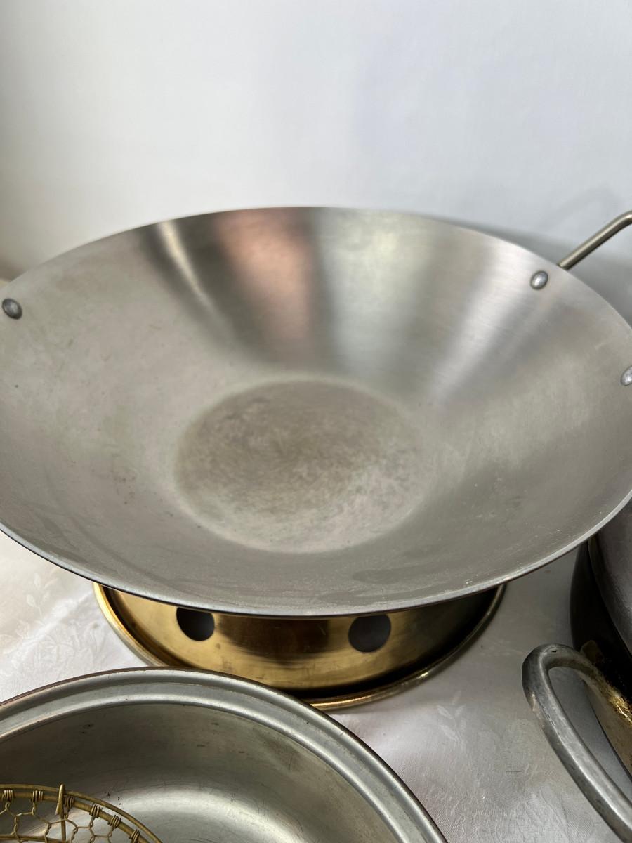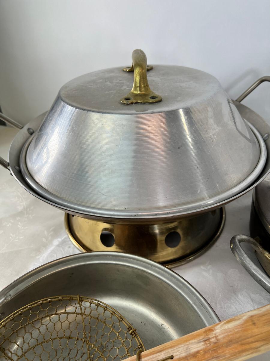 Wok with brass handle, high temp cooking brass strainer, oil lamp, copper cup with mongram