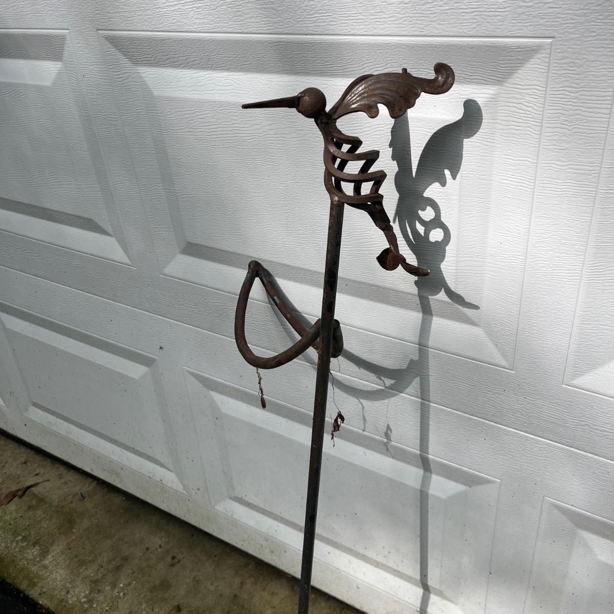 Lot includes copper rain chain, three metal poles with hummingbirds, copper snail, two dragonflies, flower with horseshoe leaves and more. Tallest piece measures 11” x 6” x 72”H and rain chain is 72” long.