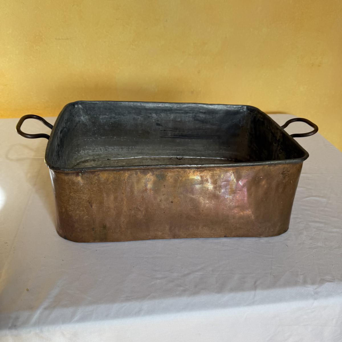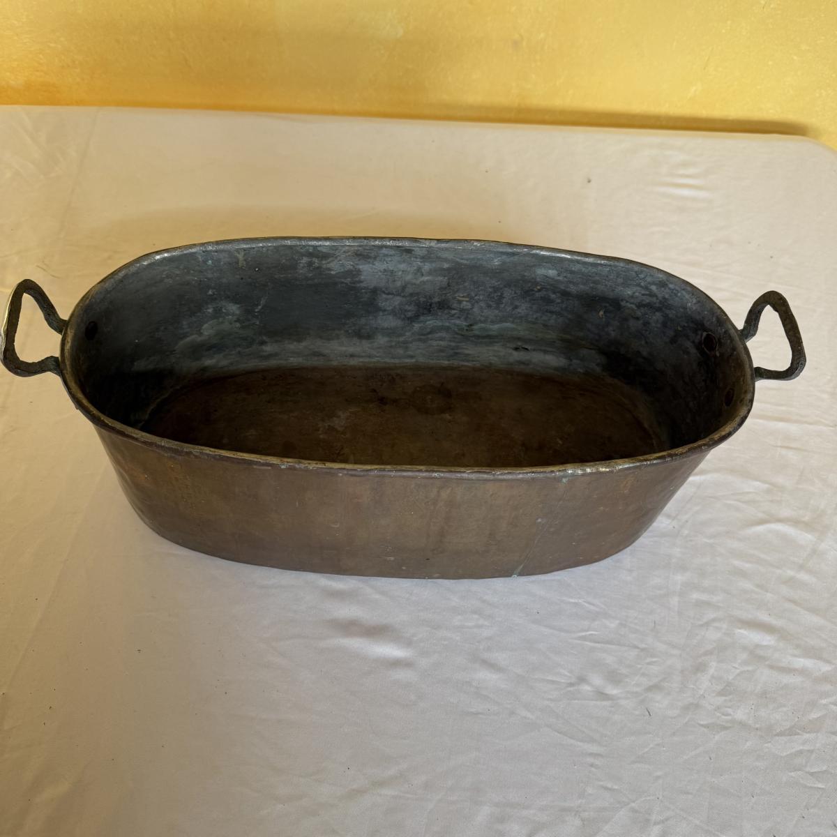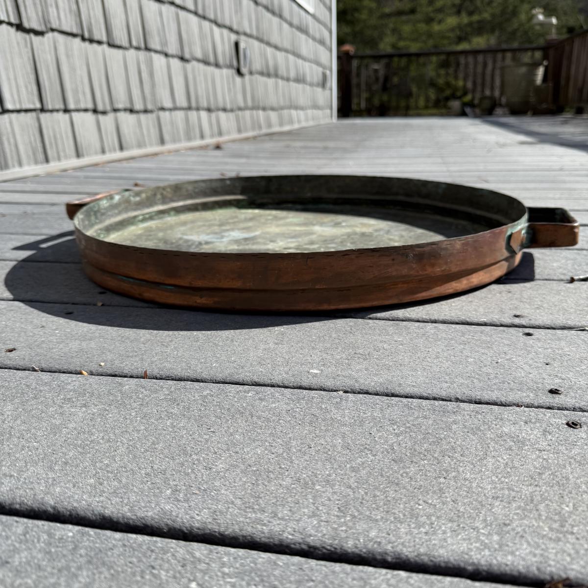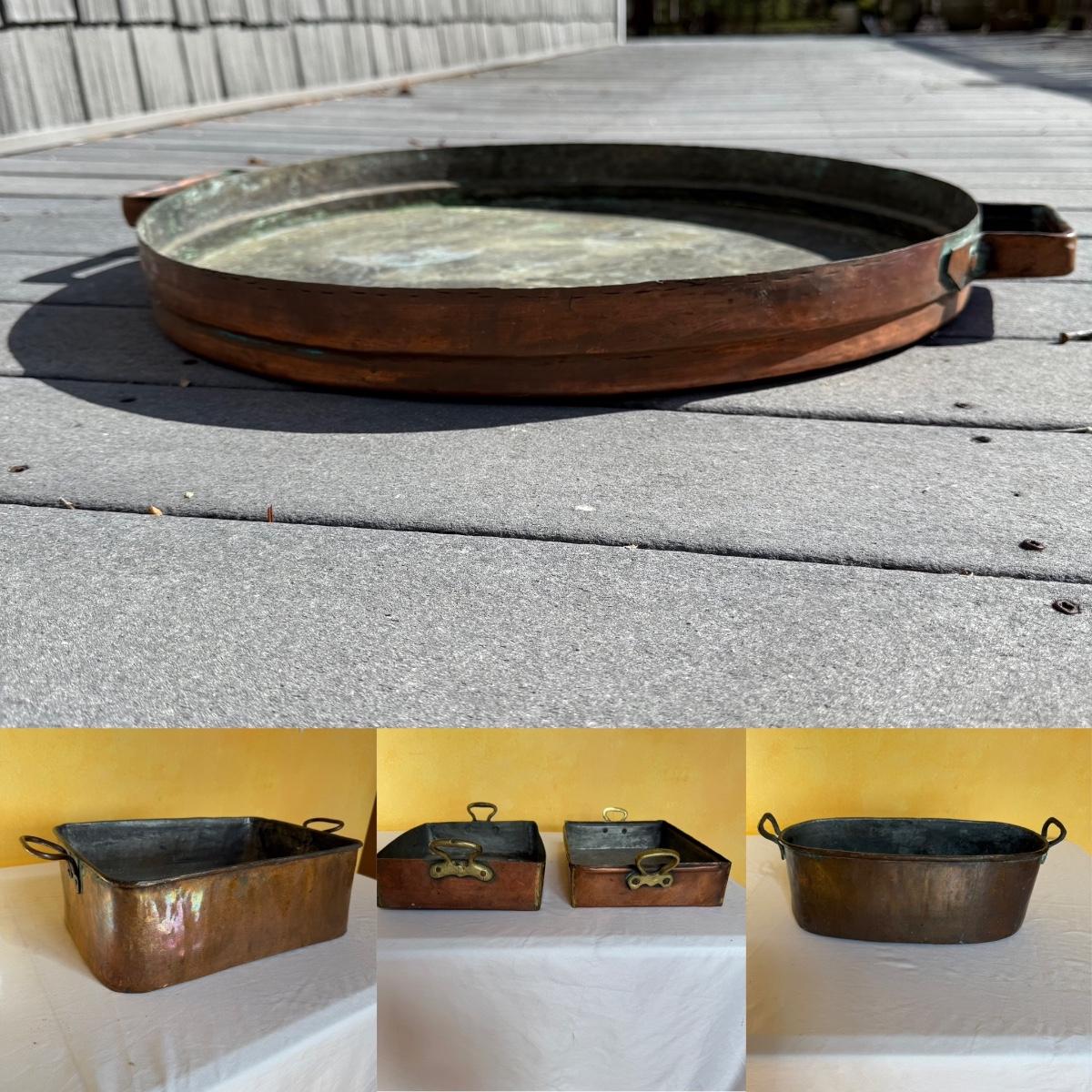 This lot contains a total of five what appears to be copper pans of varying shapes and sizes. Starting with the largest item, which is a large round serving platter or center plate with a handle on each side. This piece measures 21.25”D with a 2.5”H. Next is a fairly large roasting pan, it appears to be copper lined with tin. This roasting pan has a handle on each side. It measures 16” x 10.75” x 5.5”H. Next are two incredibly similar roasting pans they both are what appears to be copper with tin lined with brass handles. The slightly larger one measures 14.5 x 10” x 3”H and the slightly smaller one measures 13” x 10” x 3”H. The last item an oval what appears to be copper lined with tin pan with two handles. It measures 15.5” x 7” x 6”H. None of these items are stamped. Local pick up only.