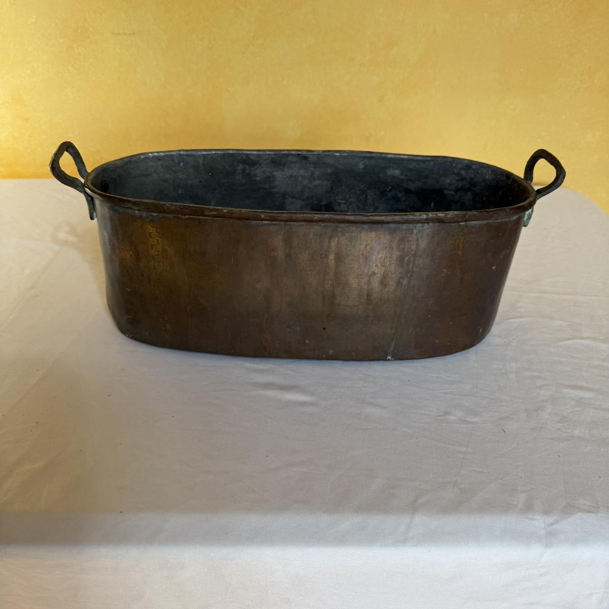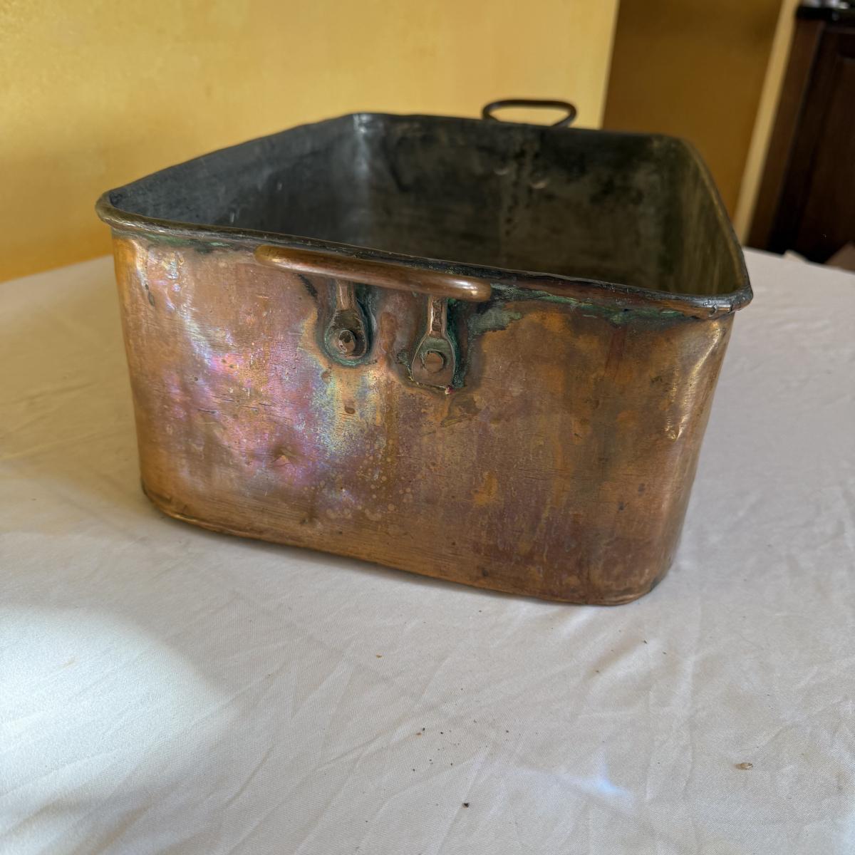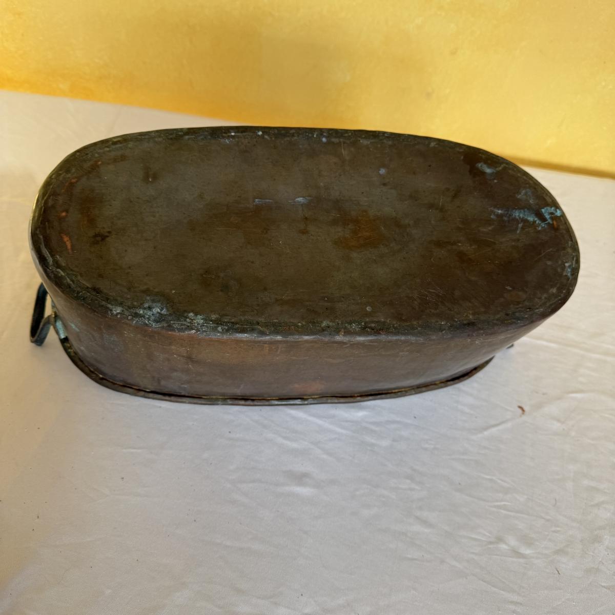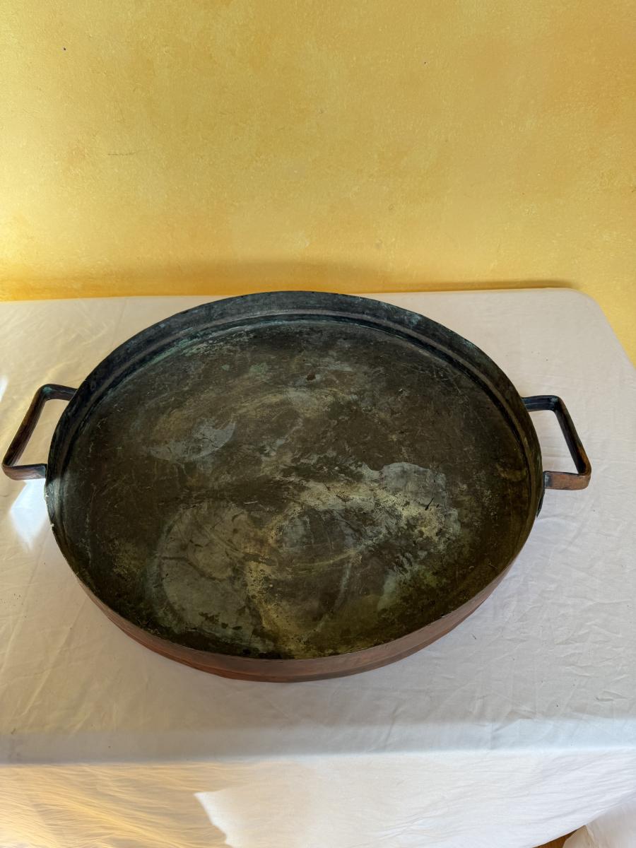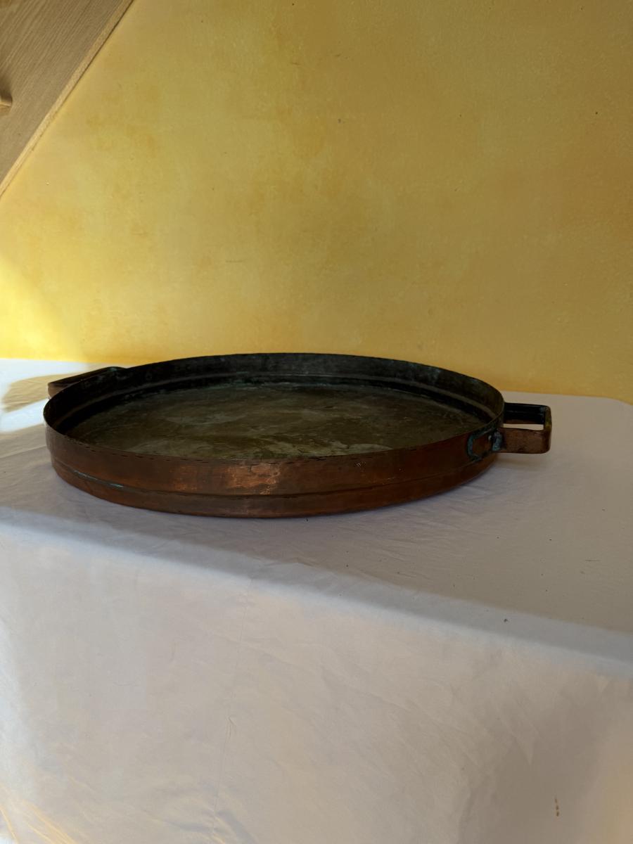 This lot contains a total of five what appears to be copper pans of varying shapes and sizes. Starting with the largest item, which is a large round serving platter or center plate with a handle on each side. This piece measures 21.25”D with a 2.5”H. Next is a fairly large roasting pan, it appears to be copper lined with tin. This roasting pan has a handle on each side. It measures 16” x 10.75” x 5.5”H. Next are two incredibly similar roasting pans they both are what appears to be copper with tin lined with brass handles. The slightly larger one measures 14.5 x 10” x 3”H and the slightly smaller one measures 13” x 10” x 3”H. The last item an oval what appears to be copper lined with tin pan with two handles. It measures 15.5” x 7” x 6”H. None of these items are stamped. Local pick up only.