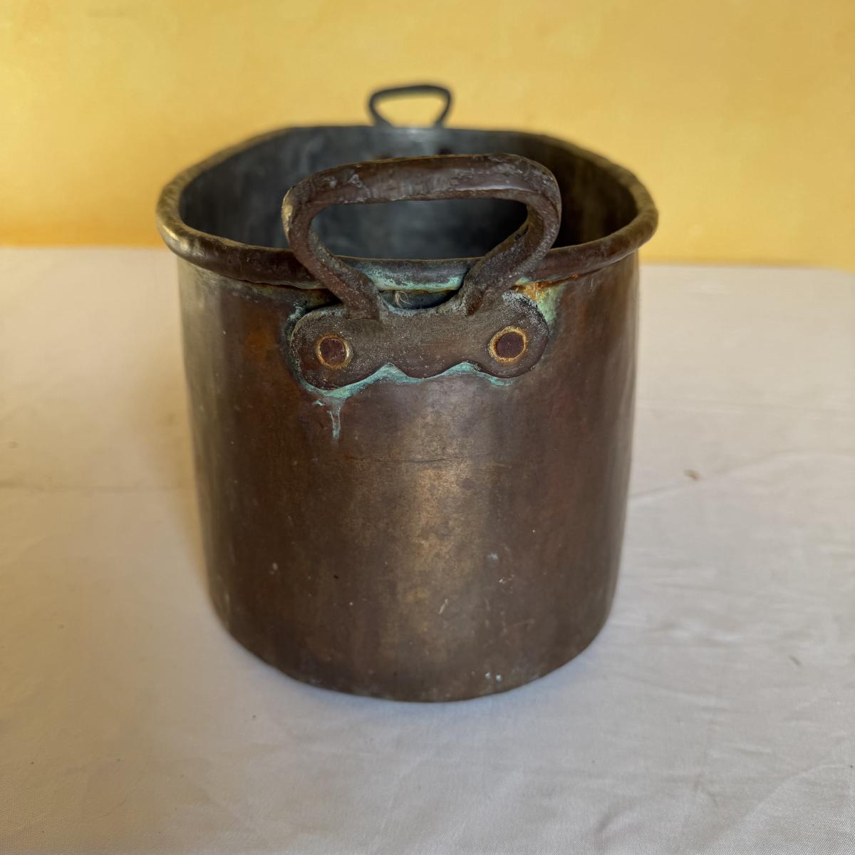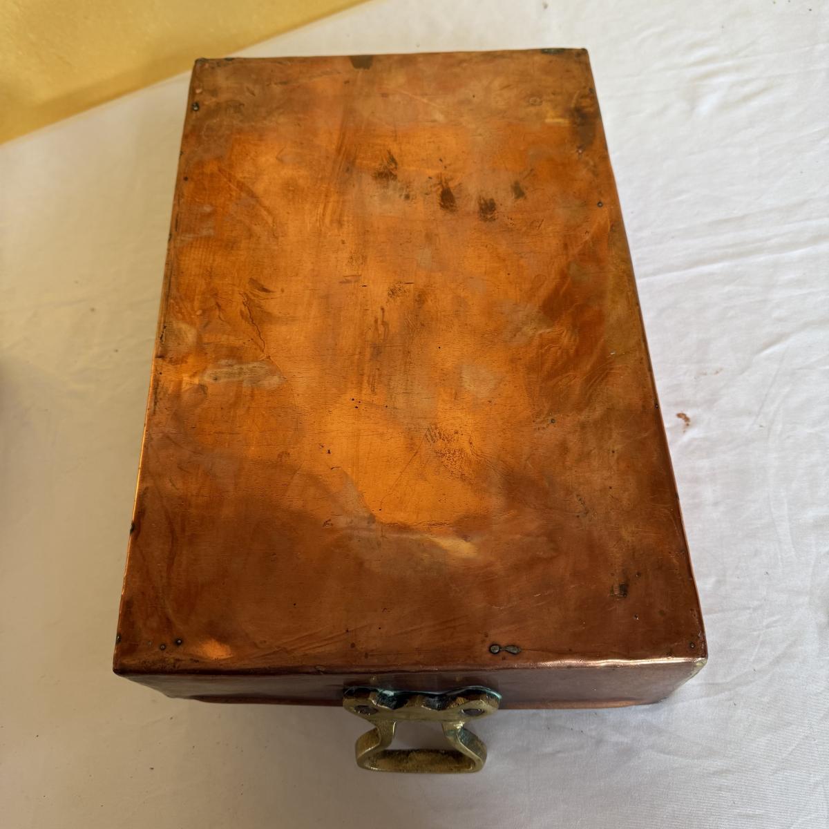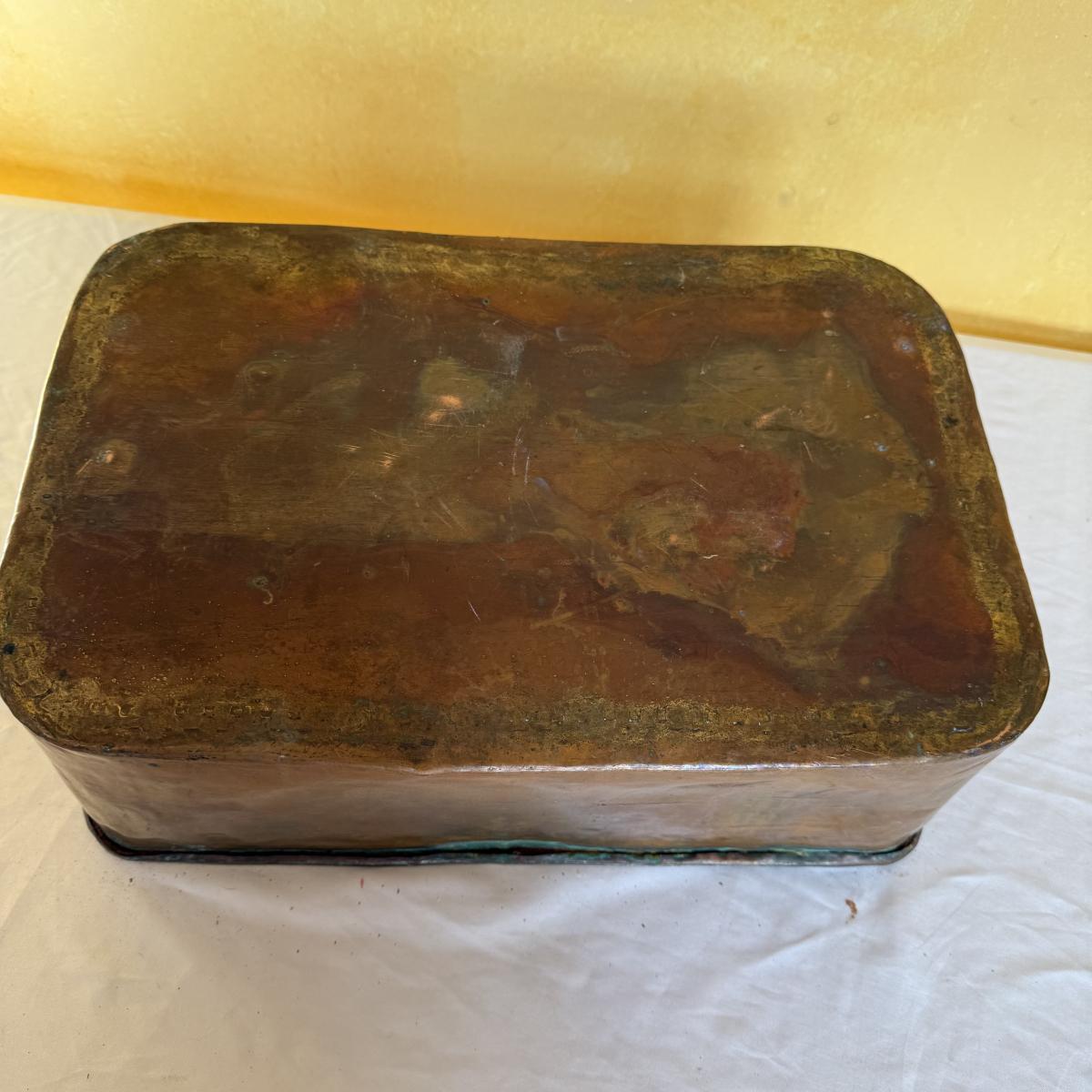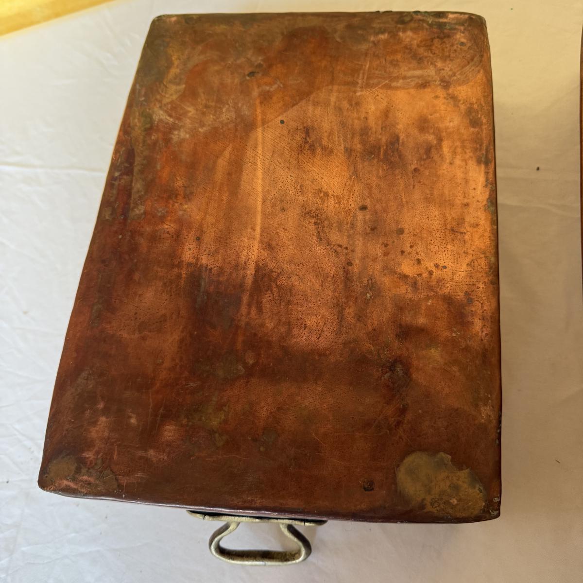 This lot contains a total of five what appears to be copper pans of varying shapes and sizes. Starting with the largest item, which is a large round serving platter or center plate with a handle on each side. This piece measures 21.25”D with a 2.5”H. Next is a fairly large roasting pan, it appears to be copper lined with tin. This roasting pan has a handle on each side. It measures 16” x 10.75” x 5.5”H. Next are two incredibly similar roasting pans they both are what appears to be copper with tin lined with brass handles. The slightly larger one measures 14.5 x 10” x 3”H and the slightly smaller one measures 13” x 10” x 3”H. The last item an oval what appears to be copper lined with tin pan with two handles. It measures 15.5” x 7” x 6”H. None of these items are stamped. Local pick up only.