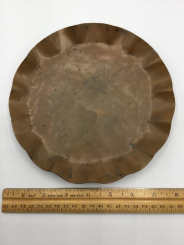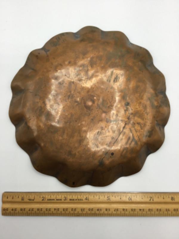Unmarked decorative copper plate with raised scalloped edges. Plate measures 7 5/8“ in-diameter.