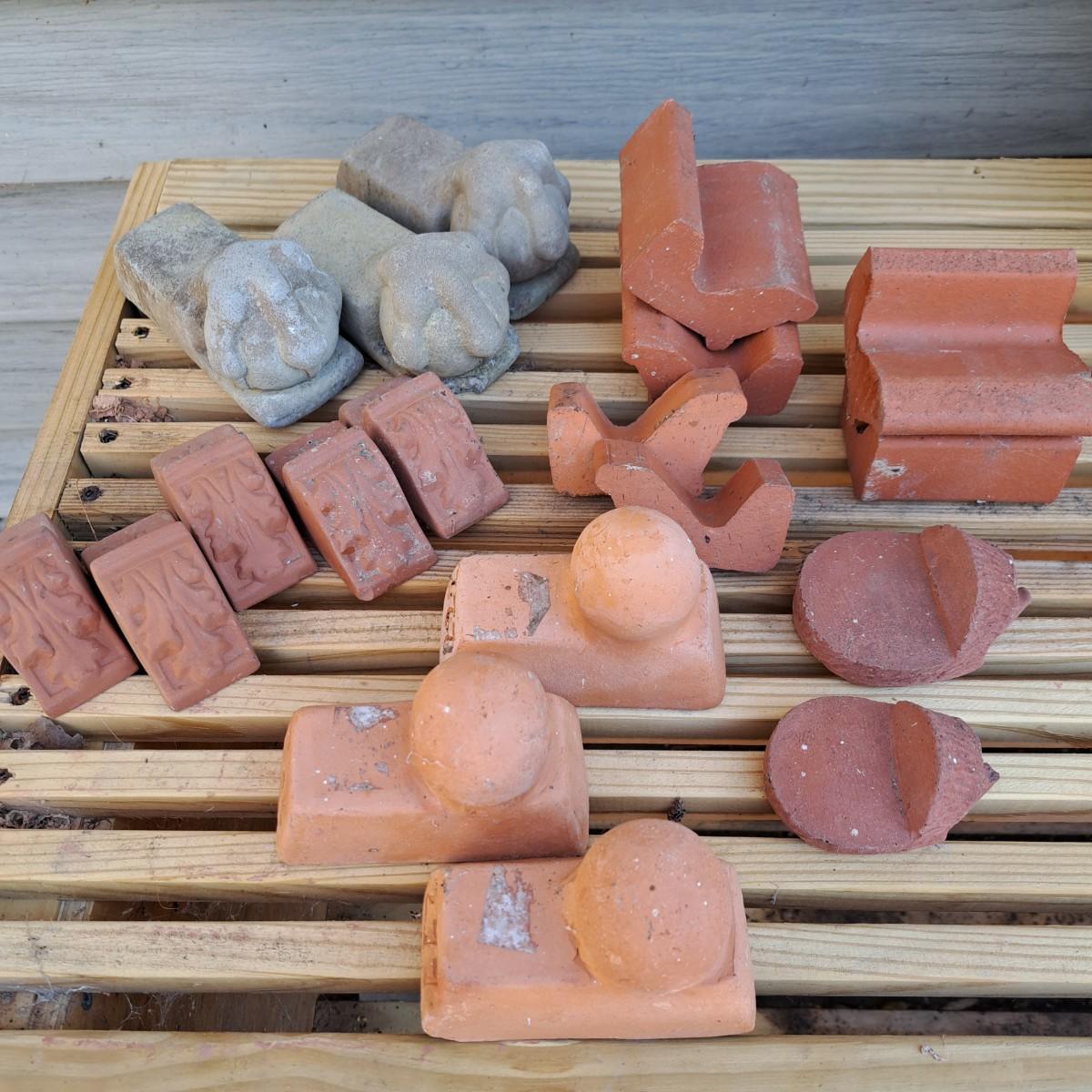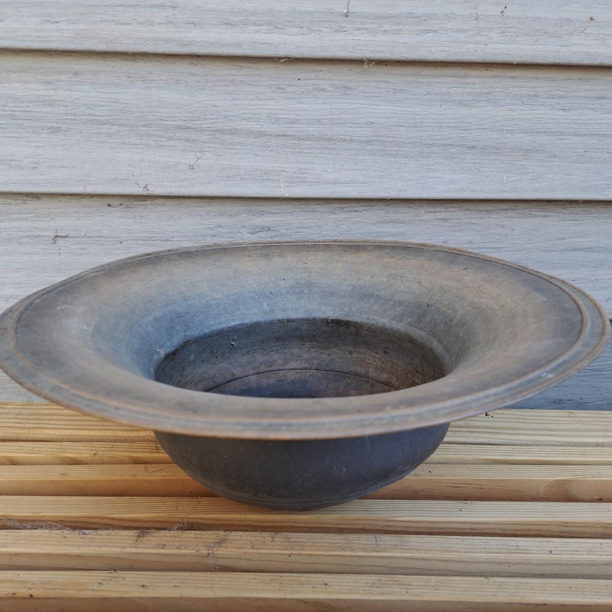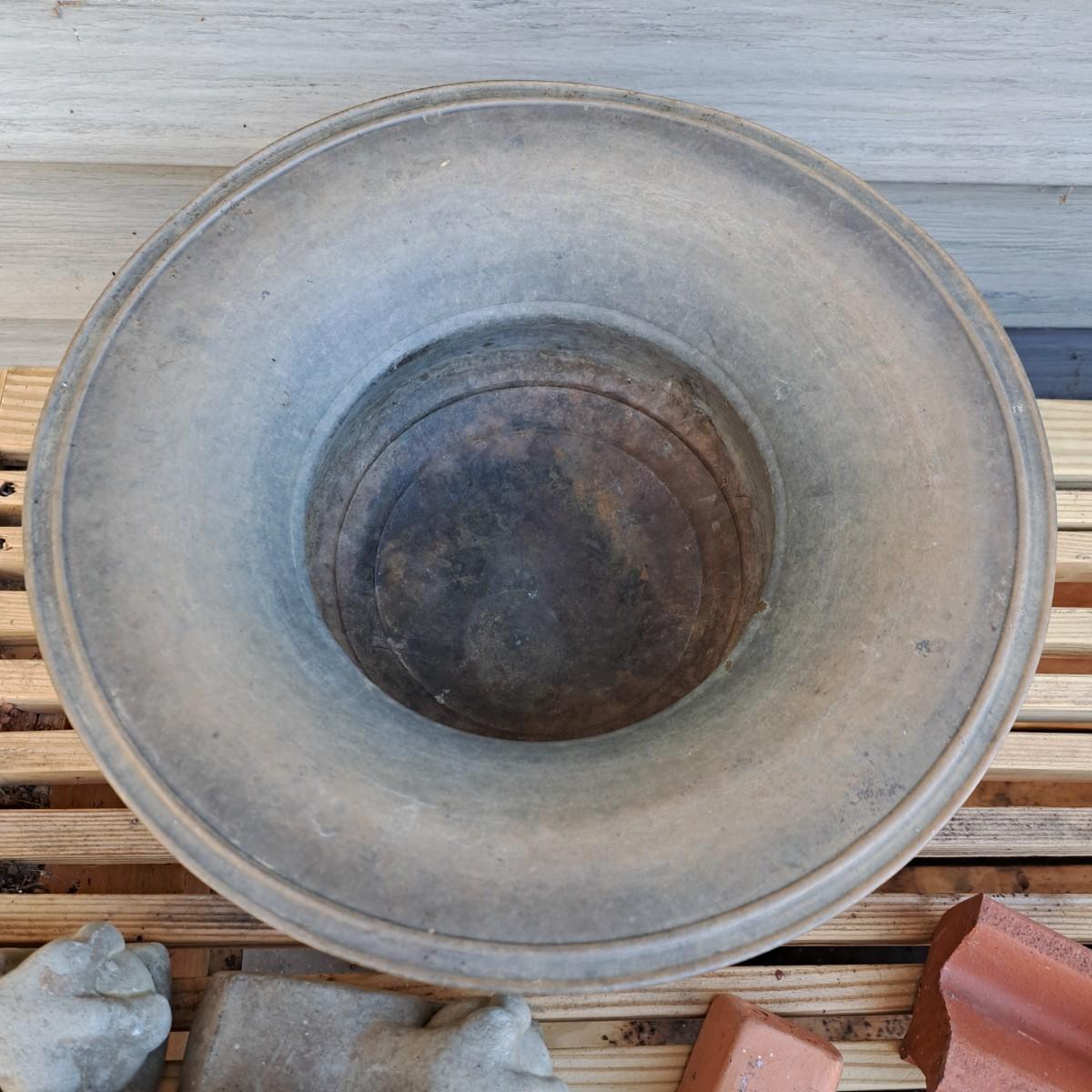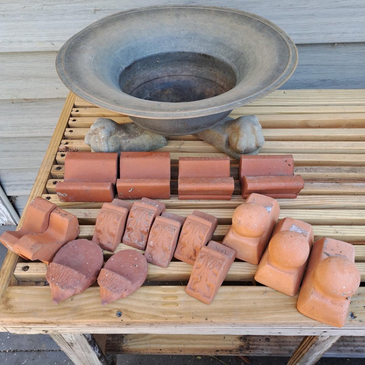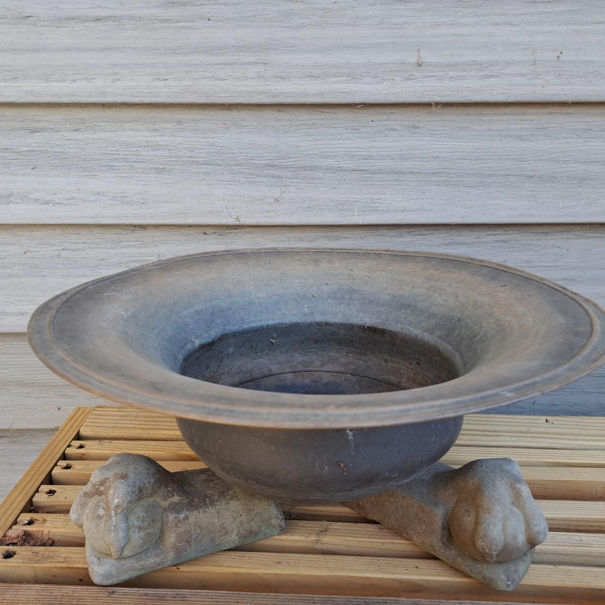 Weathered copper "spittoon" shaped planter is 15"D x 6"H and rests on three cast cement eagle claw feet, 5.5"in length. Also included with this lot are 16 clay/terra cotta planter risers that range in size from 3" to 6" in length. Local pickup only.