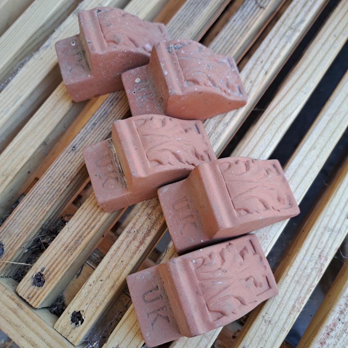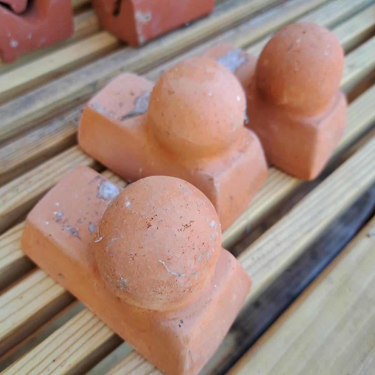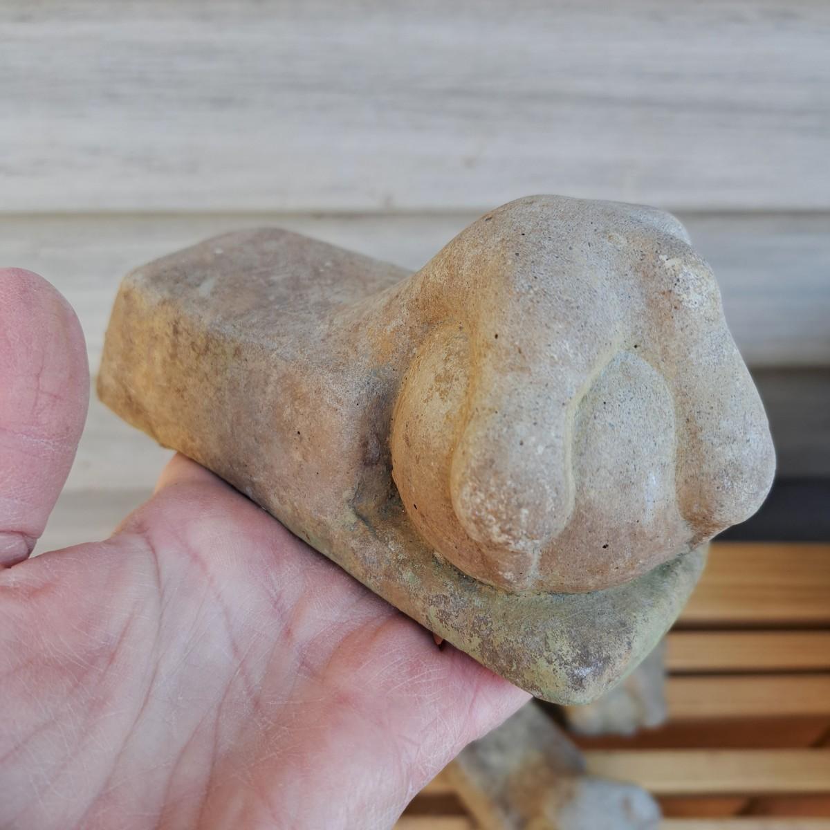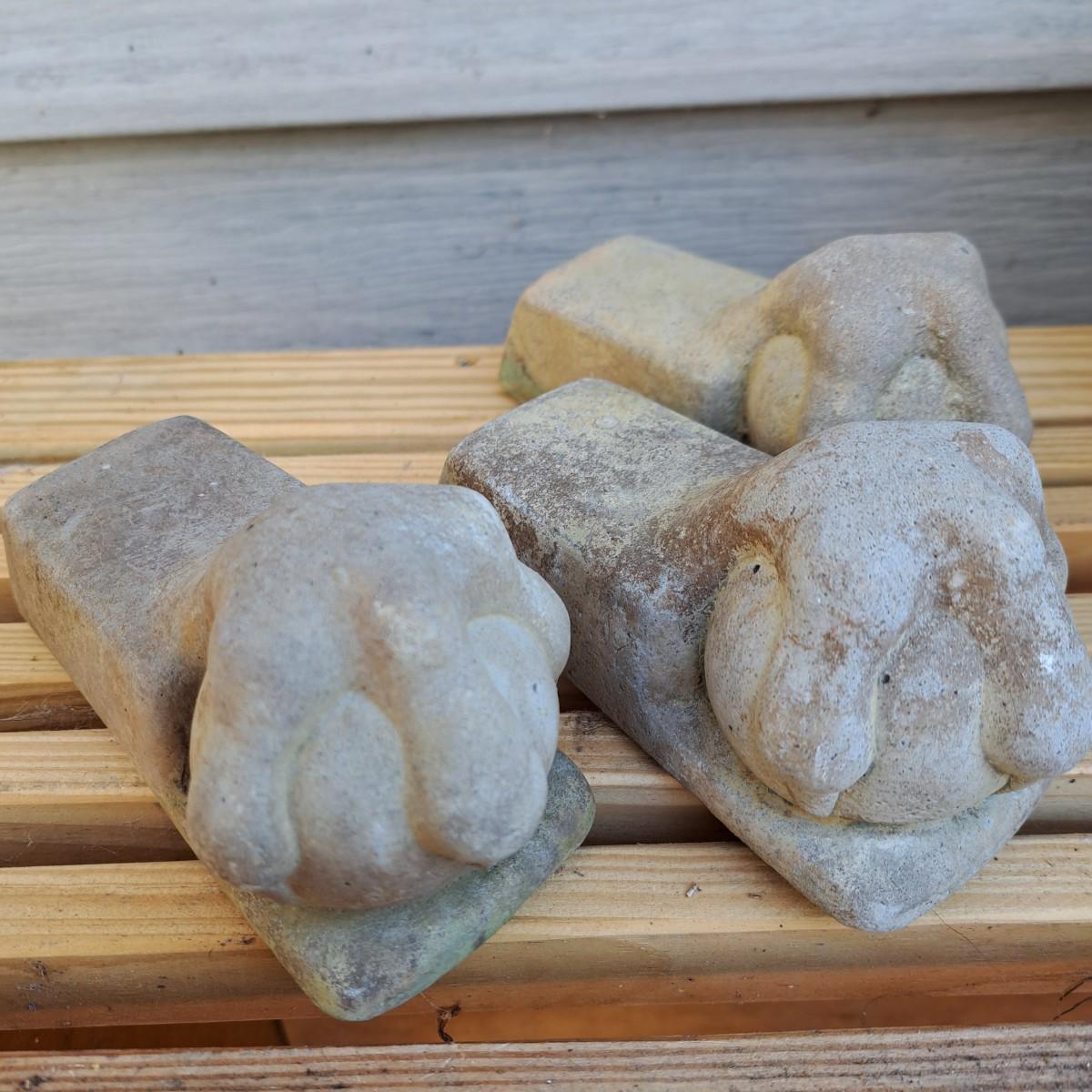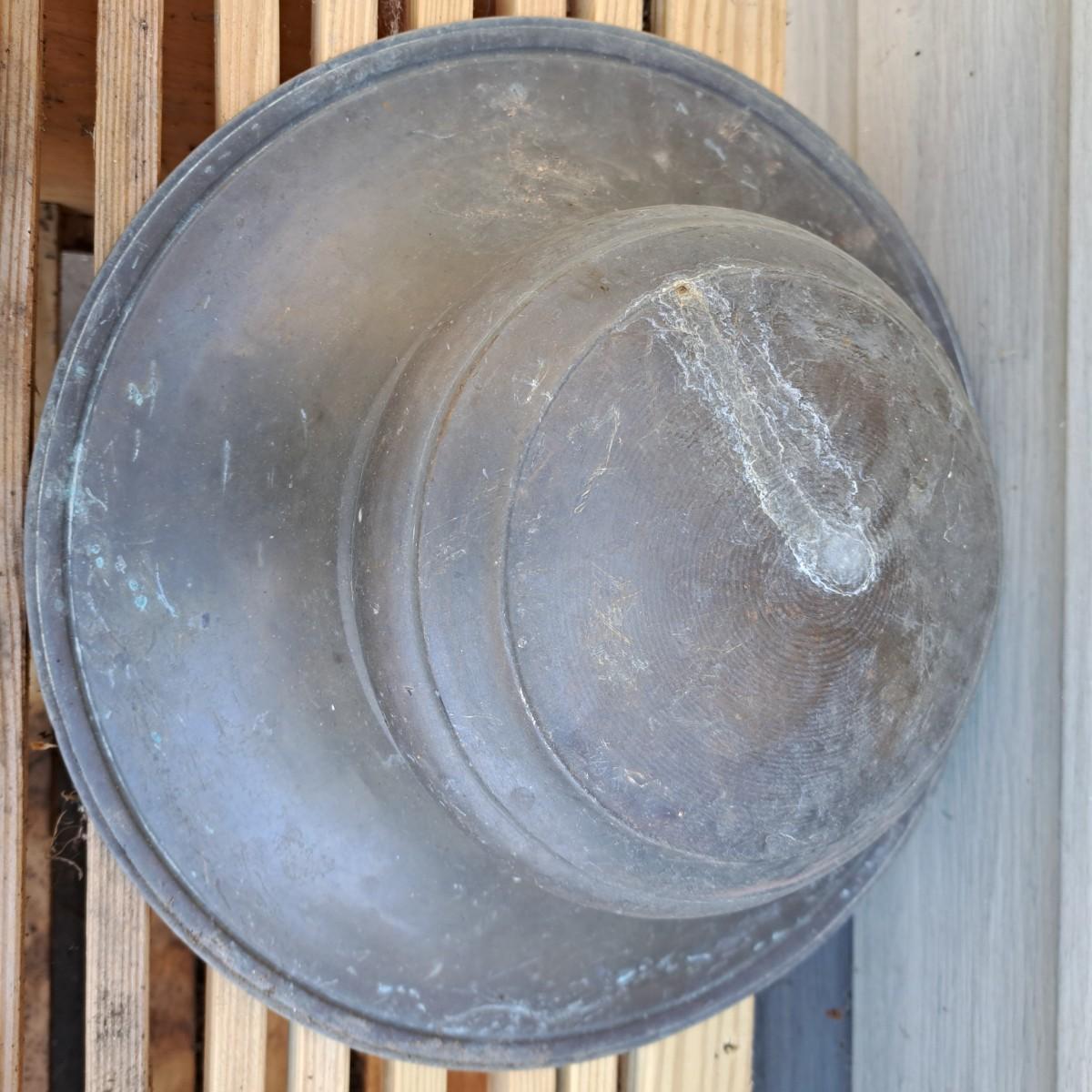 Weathered copper "spittoon" shaped planter is 15"D x 6"H and rests on three cast cement eagle claw feet, 5.5"in length. Also included with this lot are 16 clay/terra cotta planter risers that range in size from 3" to 6" in length. Local pickup only.