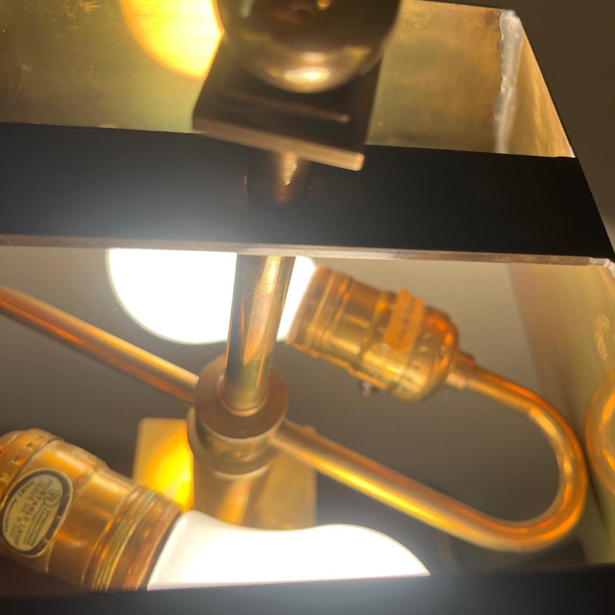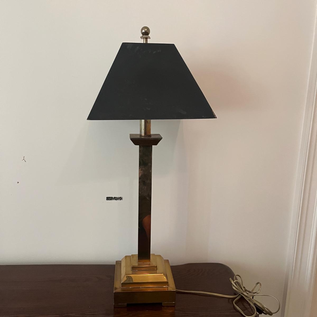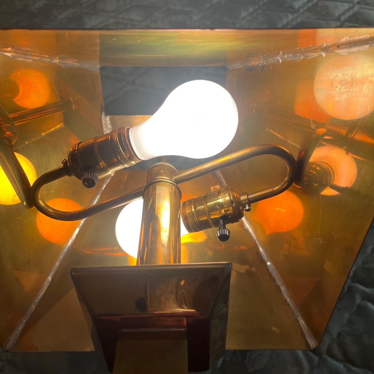 Lot includes a copper table lamp with a copper shade that is painted black on the outside. Lamp has two lights that both powered on when plugged in.