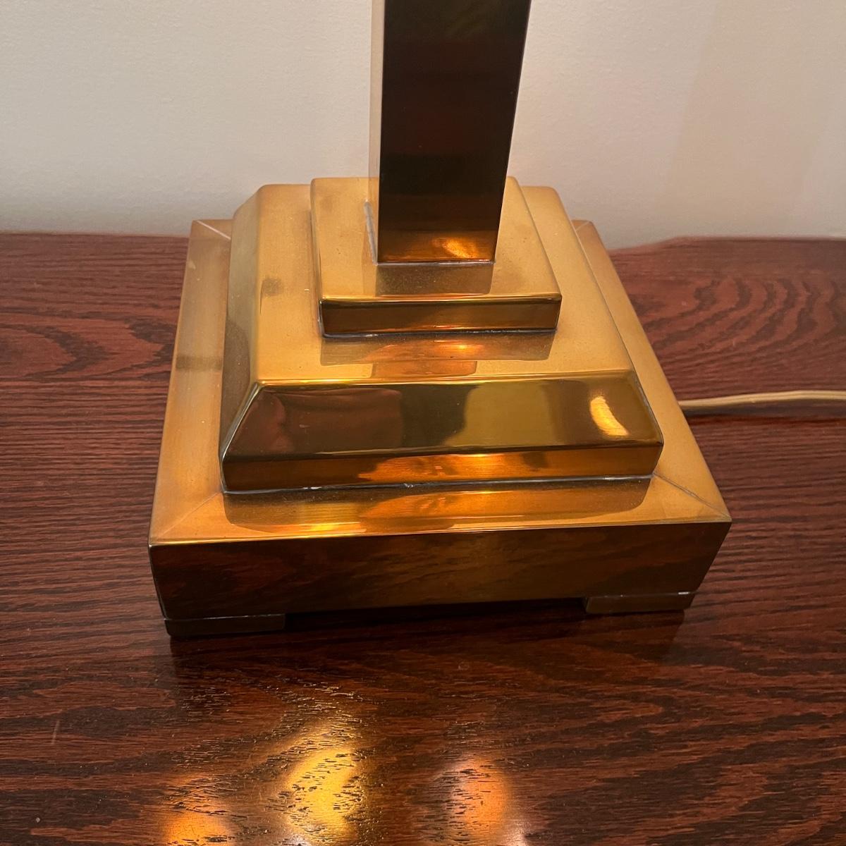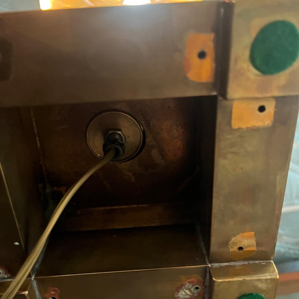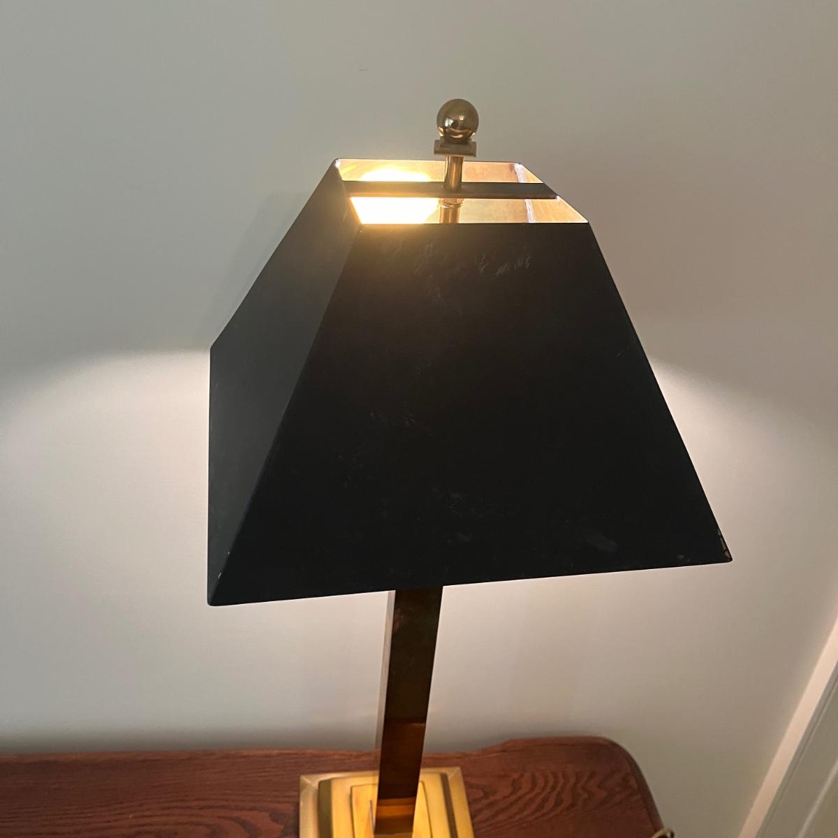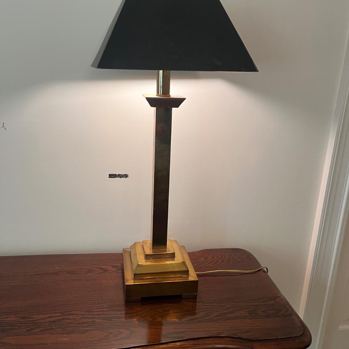 Lot includes a copper table lamp with a copper shade that is painted black on the outside. Lamp has two lights that both powered on when plugged in.