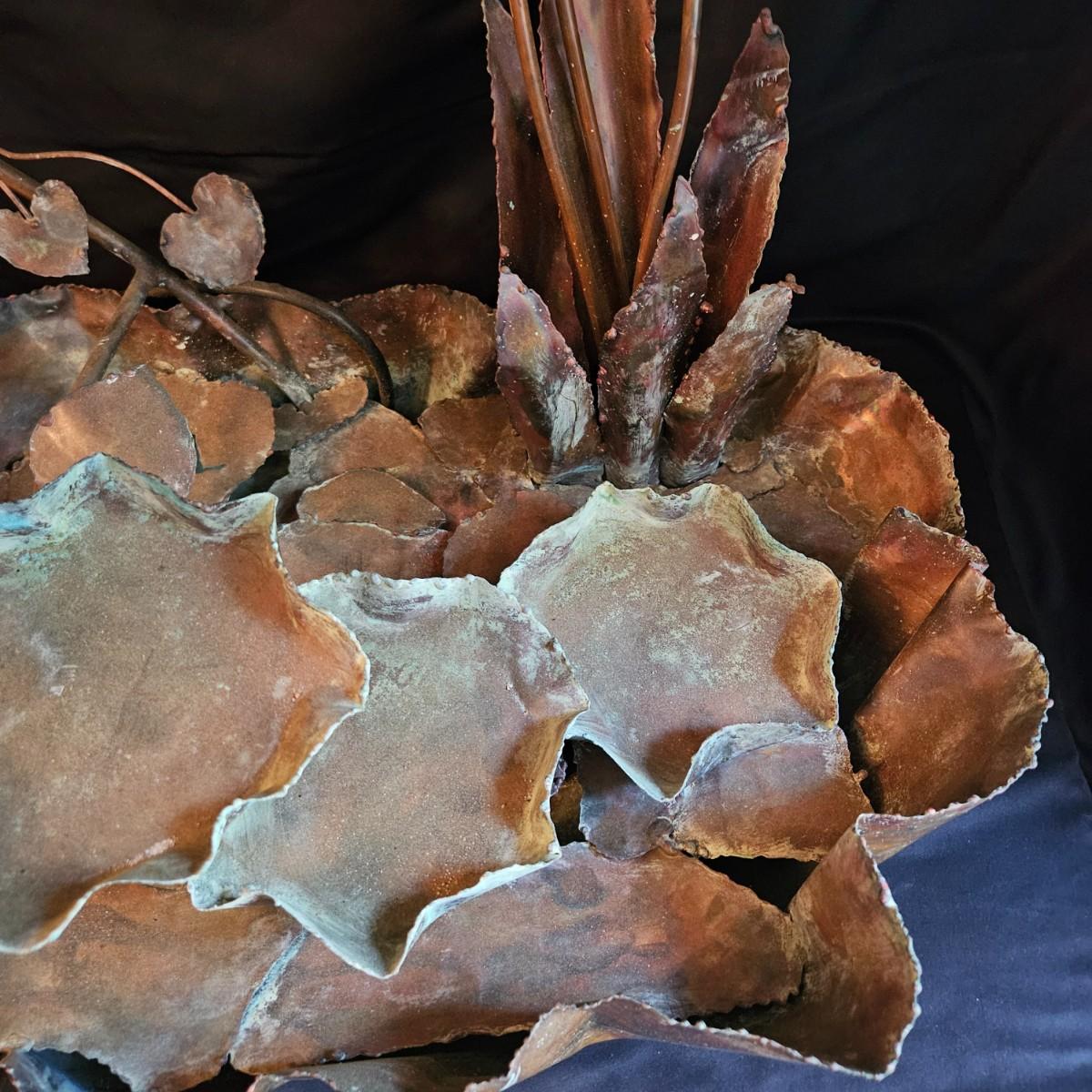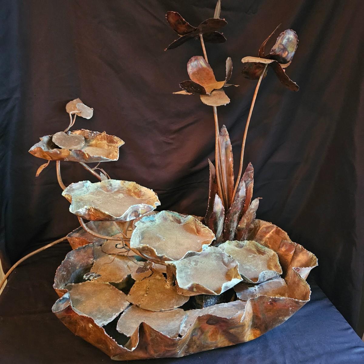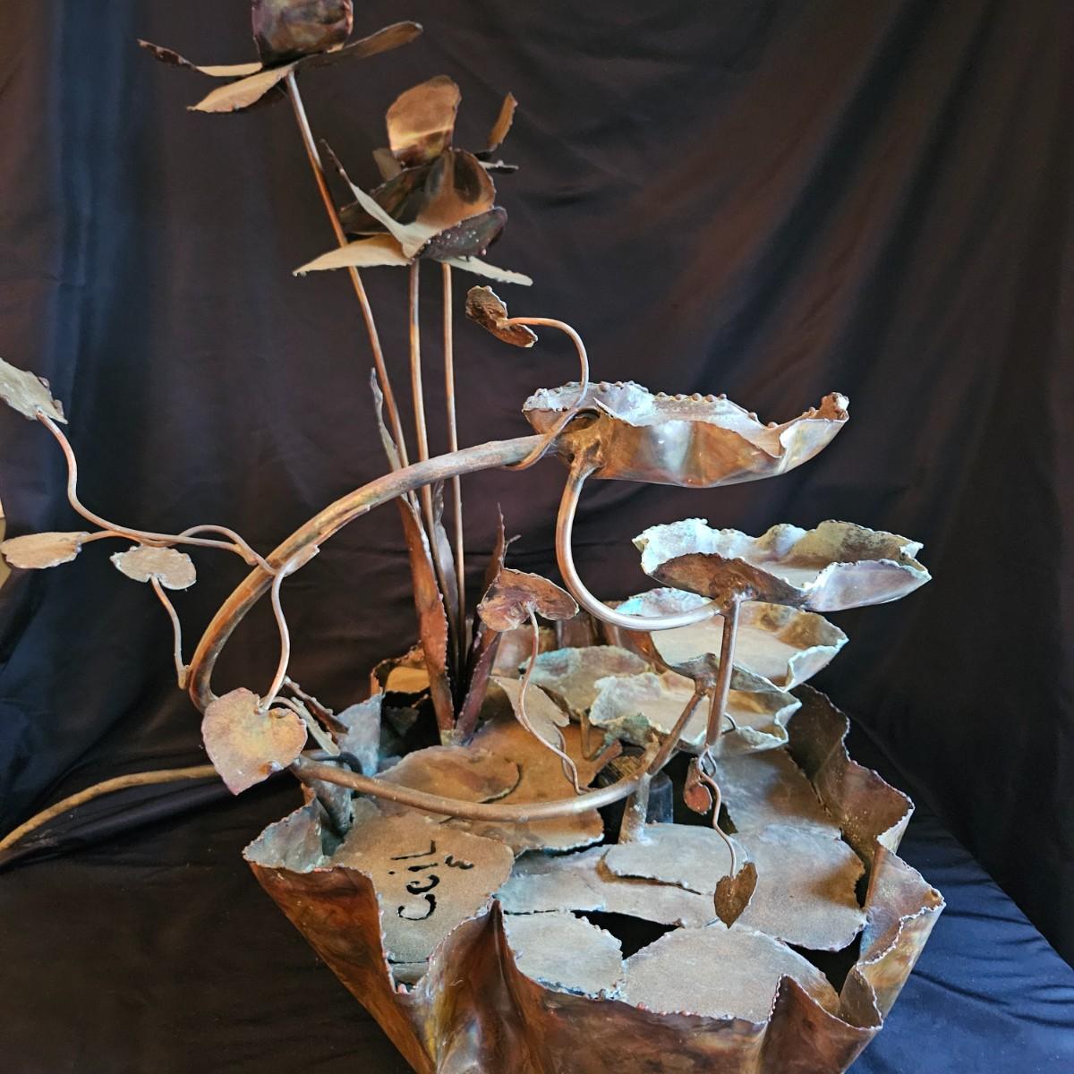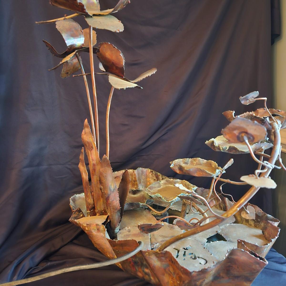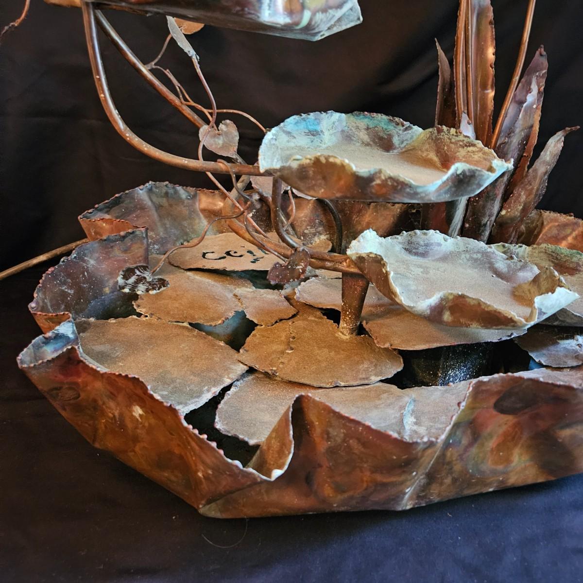 A copper water fountain that appears to be hand made with 'Ceil' cut into it. We were told the fountain appears to be made by Ceil Whitebrook, a former member of the Southern Highlands Craft Guild. It measures approximately 23" x 17" x 26"H. The pump powered on when plugged in. Shipping available.