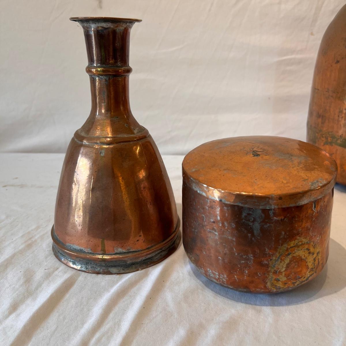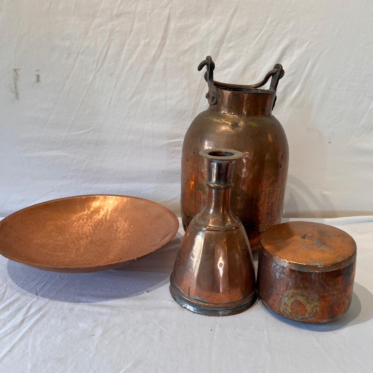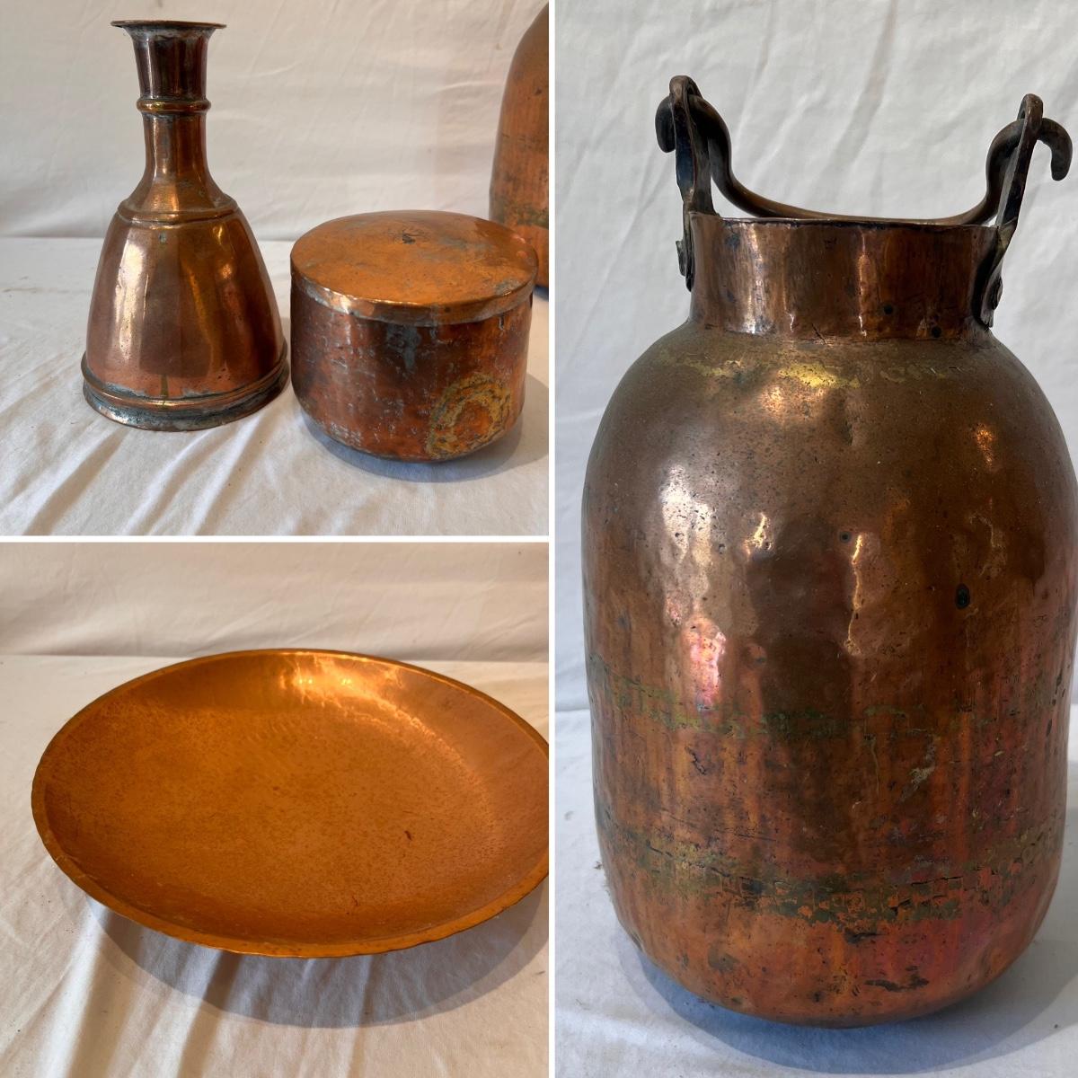 Four copper items including a large handled jug and a smaller water jug plus a shallow bowl and a lidded container.