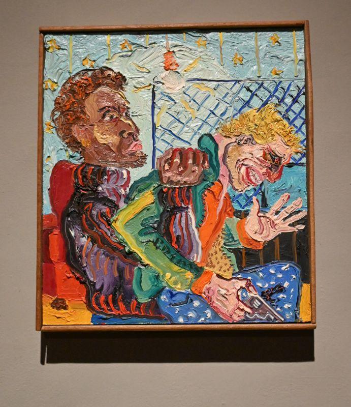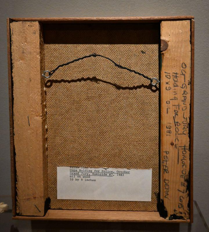 "Cops Holding for Police, October Grand Jury, Homicide #7" (1982) by artist Peter Dean. Oil on wood. Approx. 9" x 10" Please note, listed dimensions includes frame.