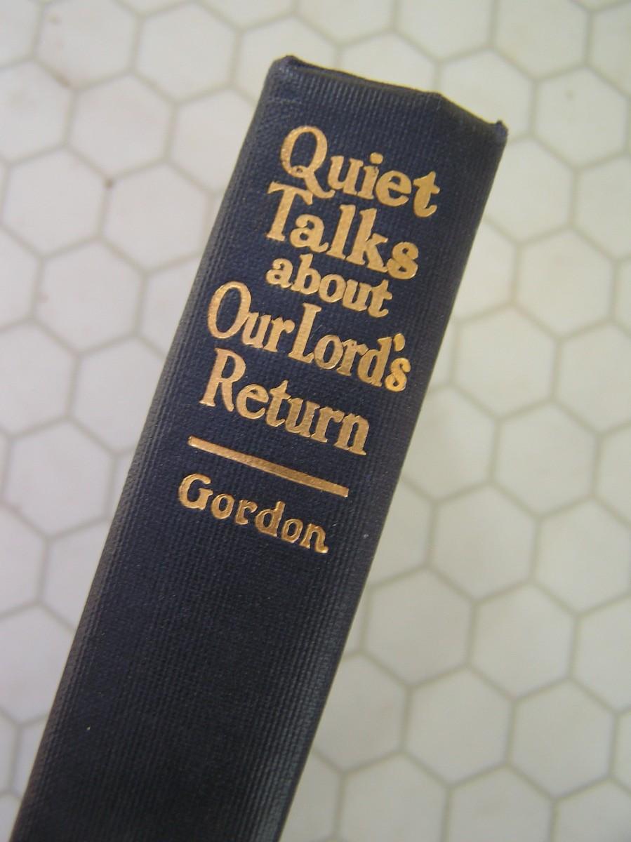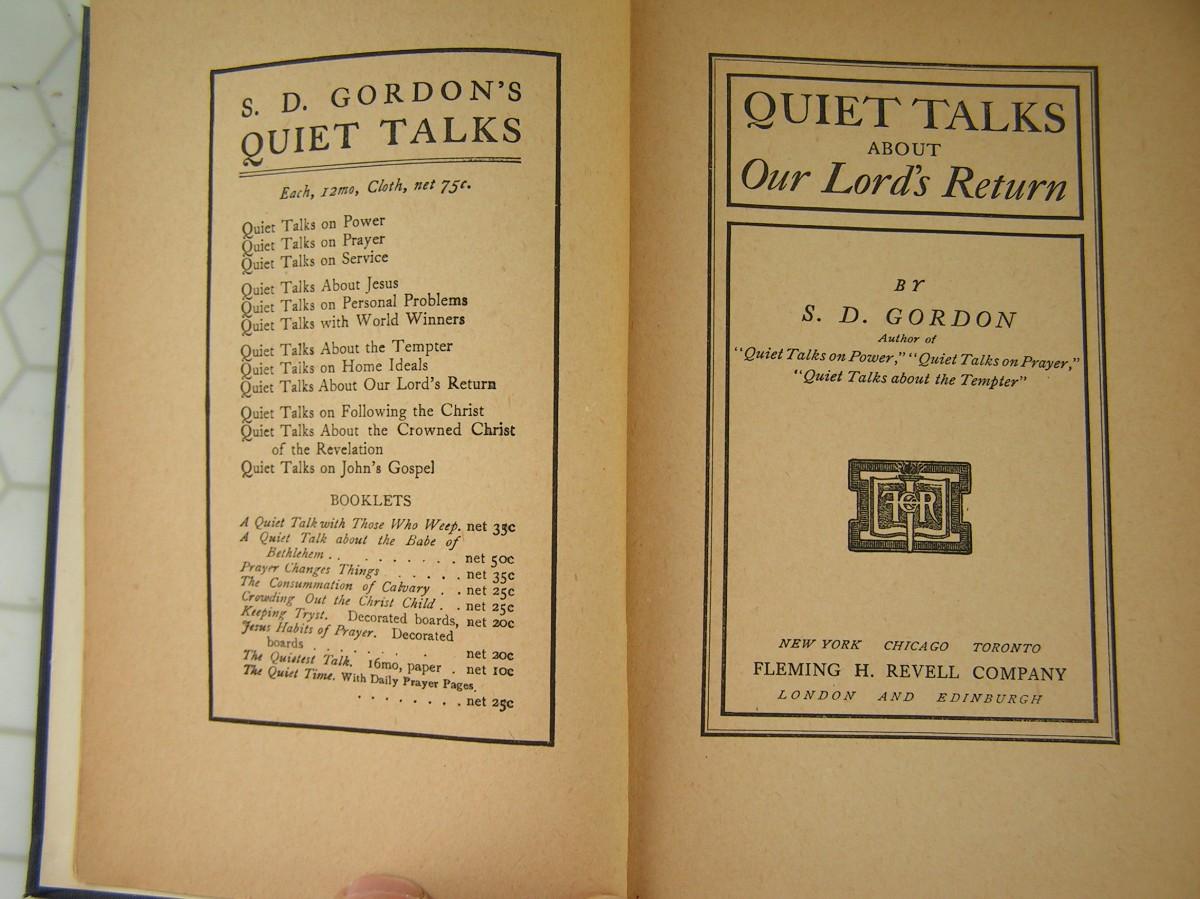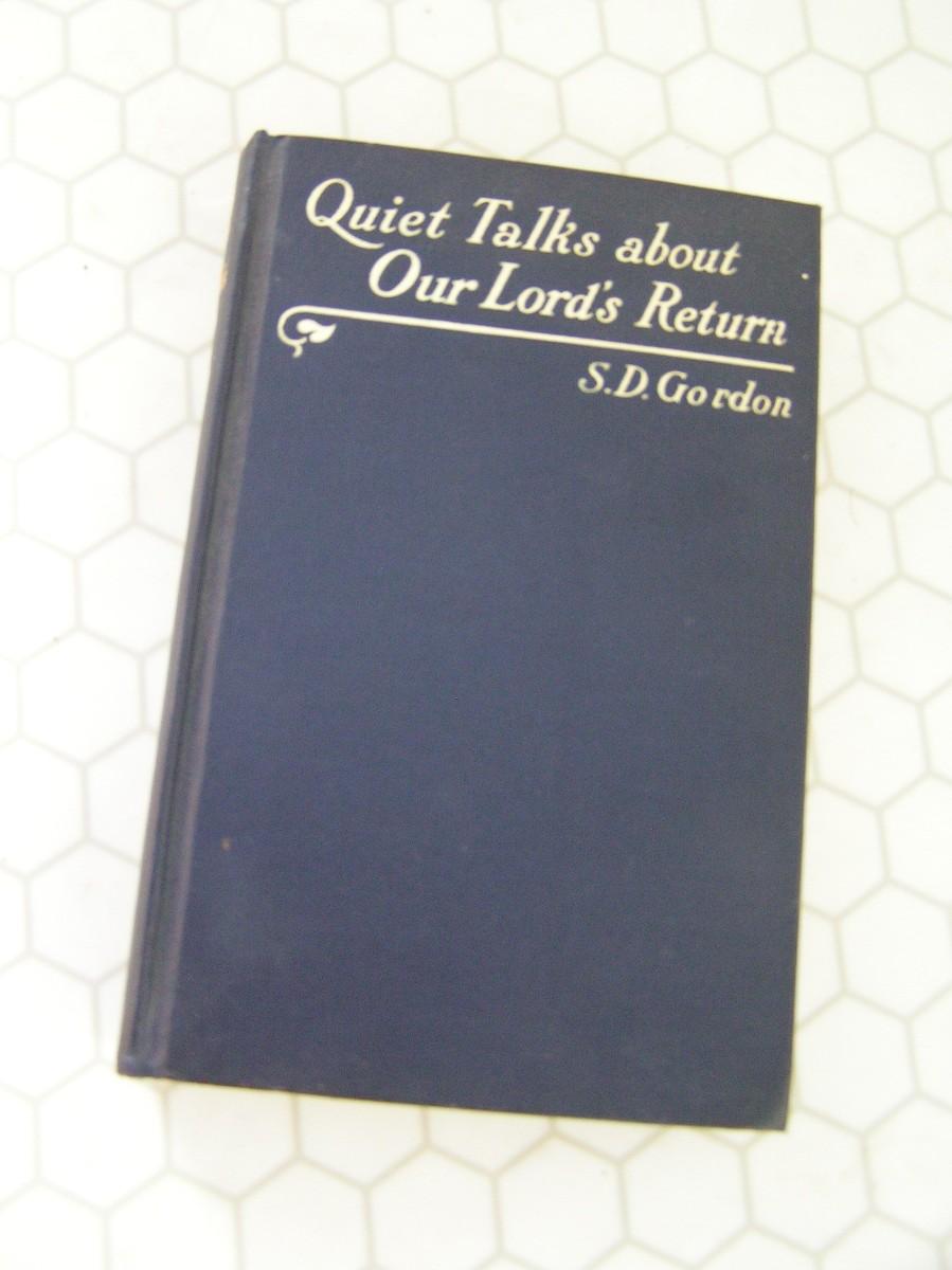 Copyright 1912: “Quiet Talks about Our Lord’s Return” by S.D.Gordon. 266 pages. Hard cover, about 7-1/2"x5". Exceptional condition for age.