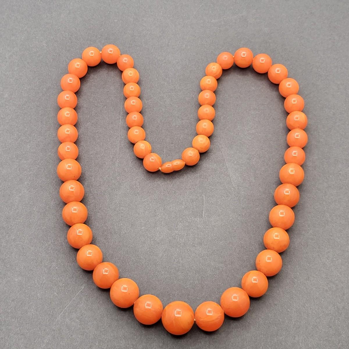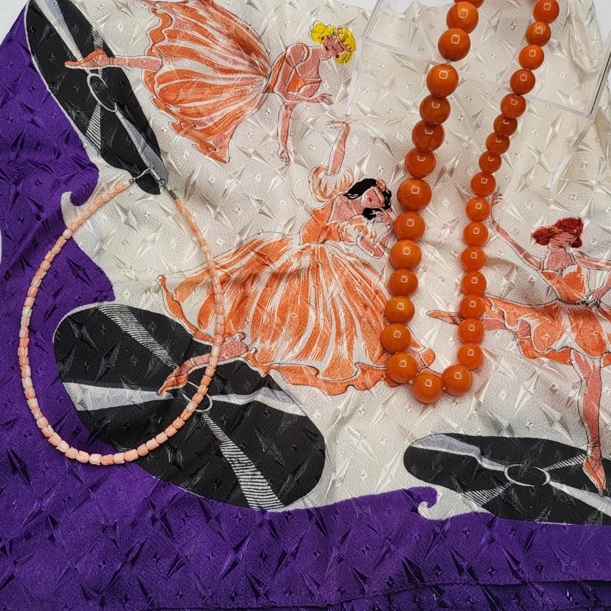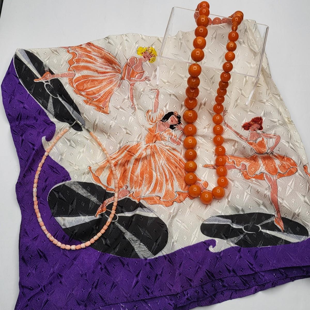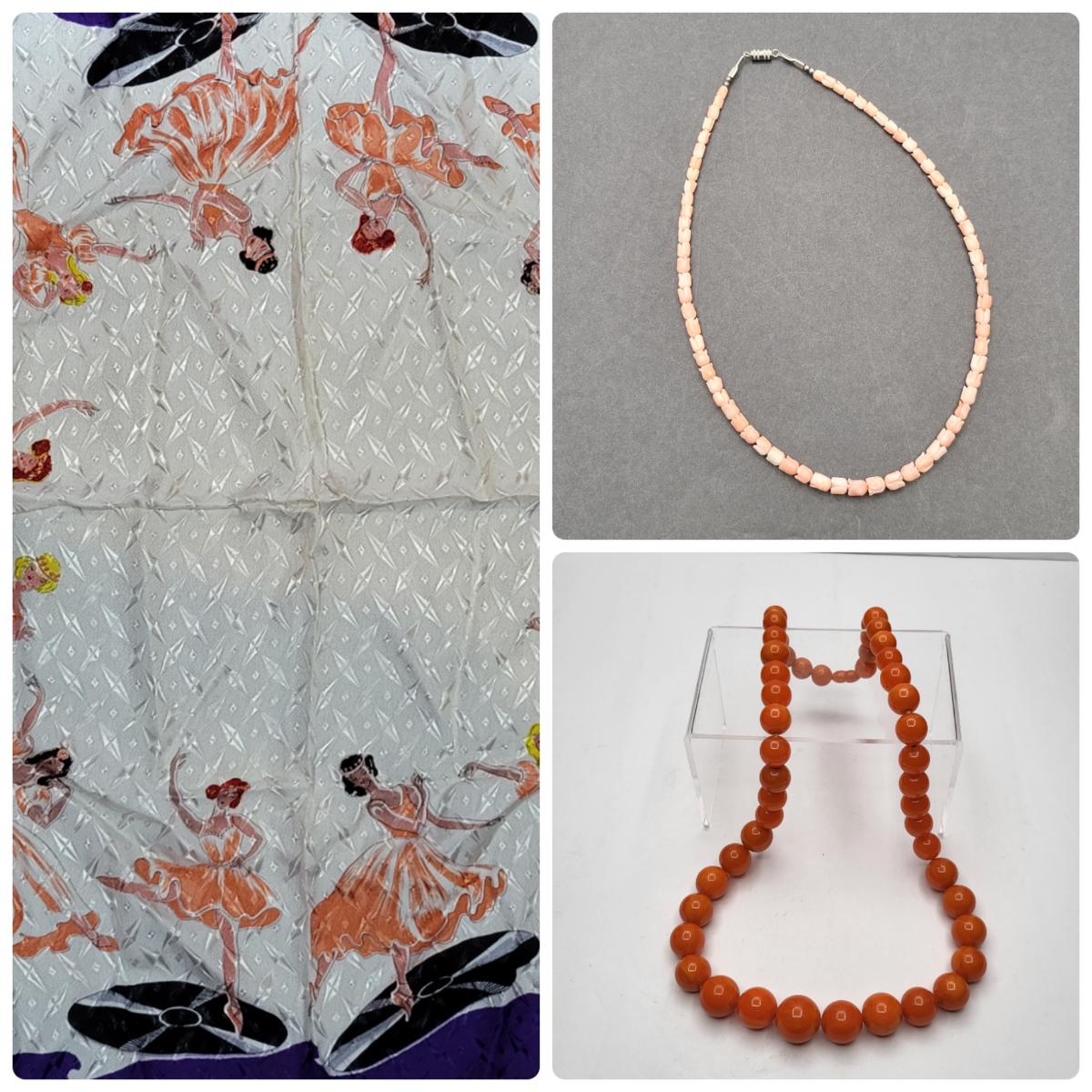 Coral colored bakelite? Graduated beaded necklace with twist clasp, 30". Dainty, real angel skin coral tulip choker style necklace with barrel twist clasp, 16". Vintage silk ballerina scarf, 31", made in Japan.
