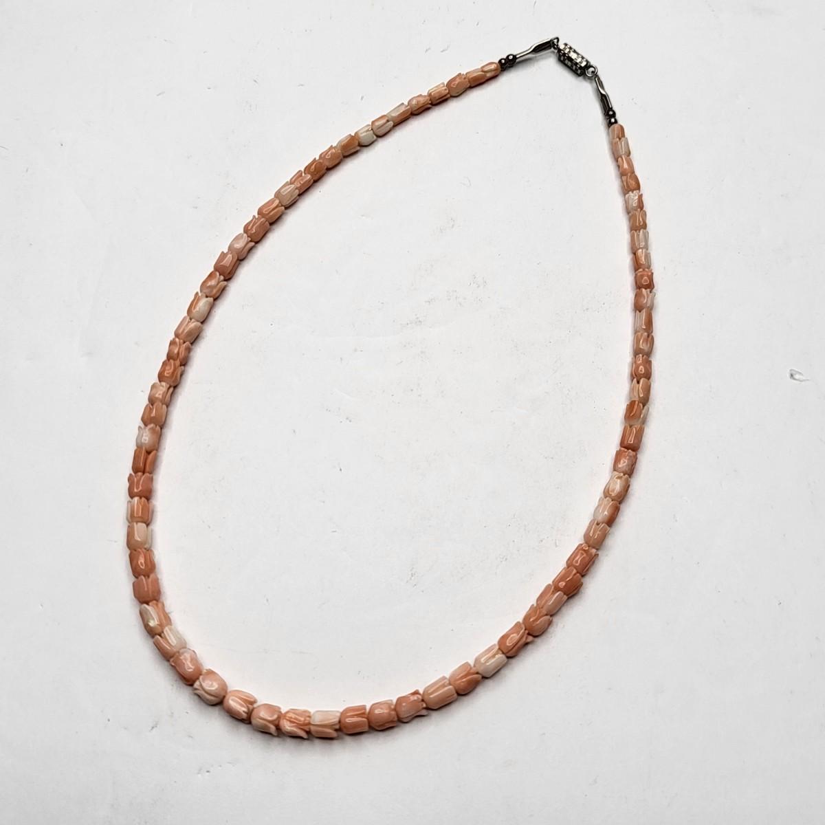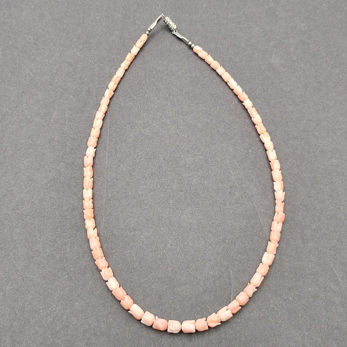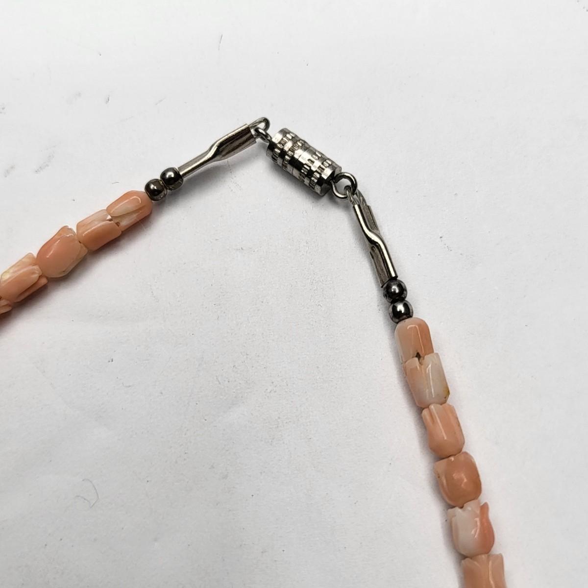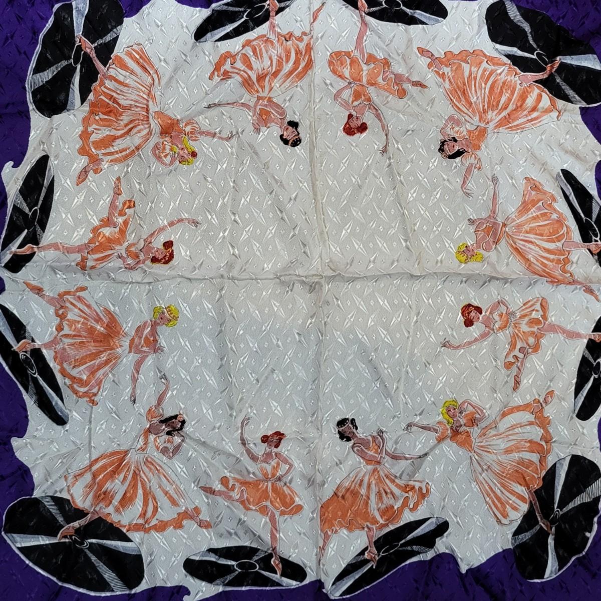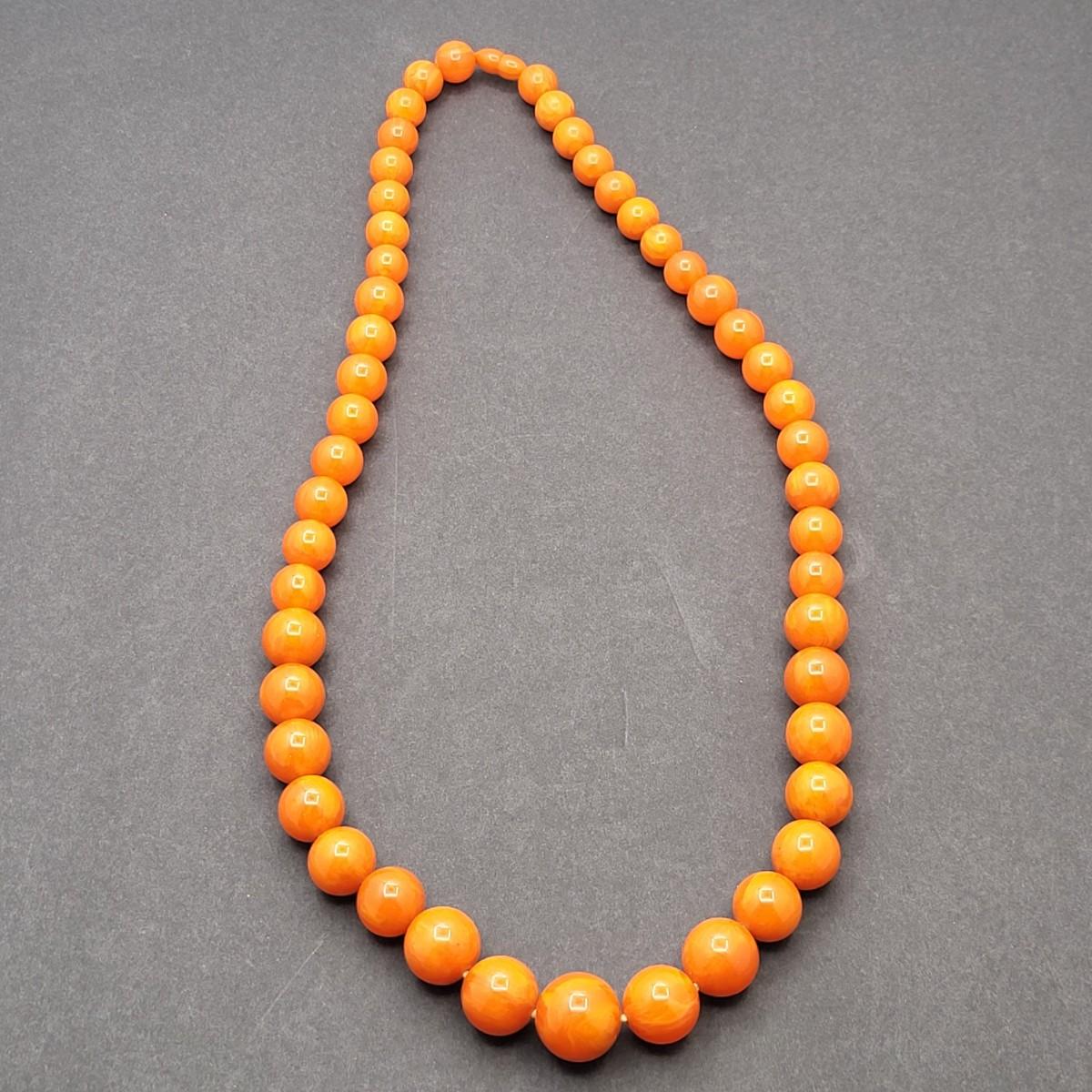 Coral colored bakelite? Graduated beaded necklace with twist clasp, 30". Dainty, real angel skin coral tulip choker style necklace with barrel twist clasp, 16". Vintage silk ballerina scarf, 31", made in Japan.