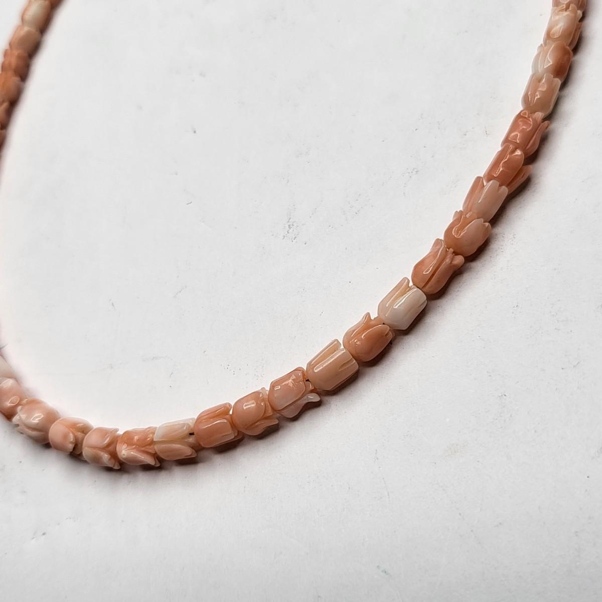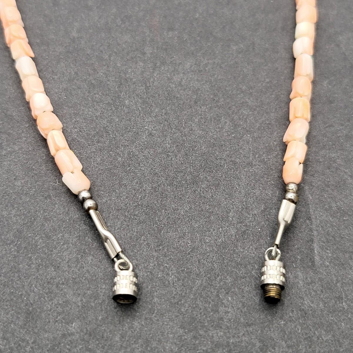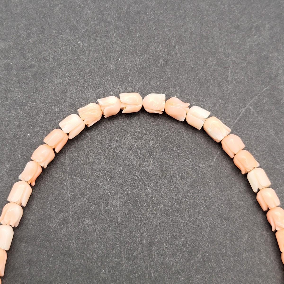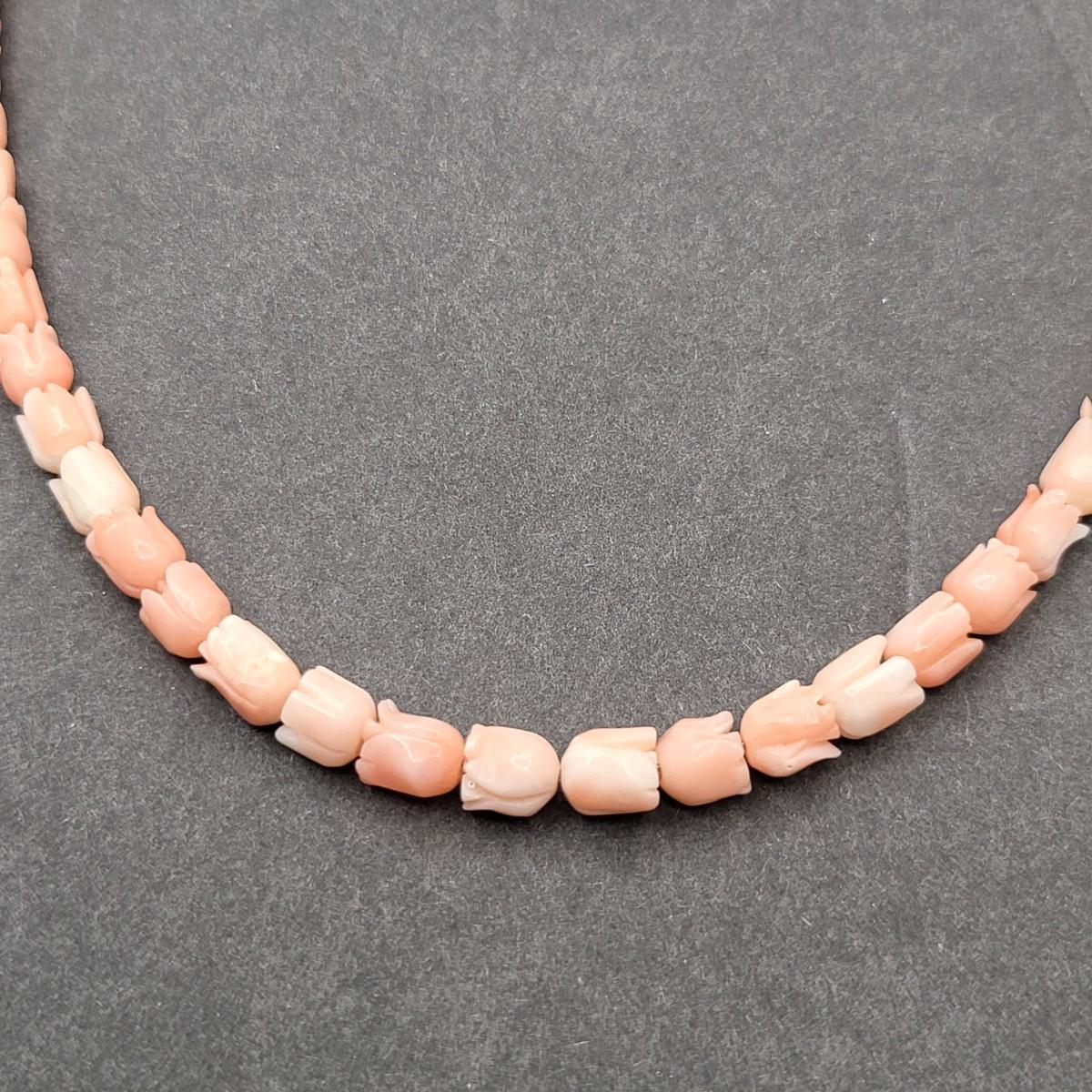 Coral colored bakelite? Graduated beaded necklace with twist clasp, 30". Dainty, real angel skin coral tulip choker style necklace with barrel twist clasp, 16". Vintage silk ballerina scarf, 31", made in Japan.