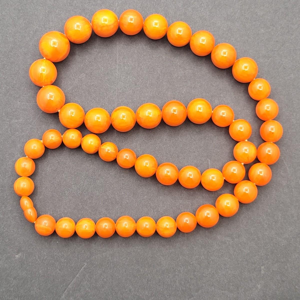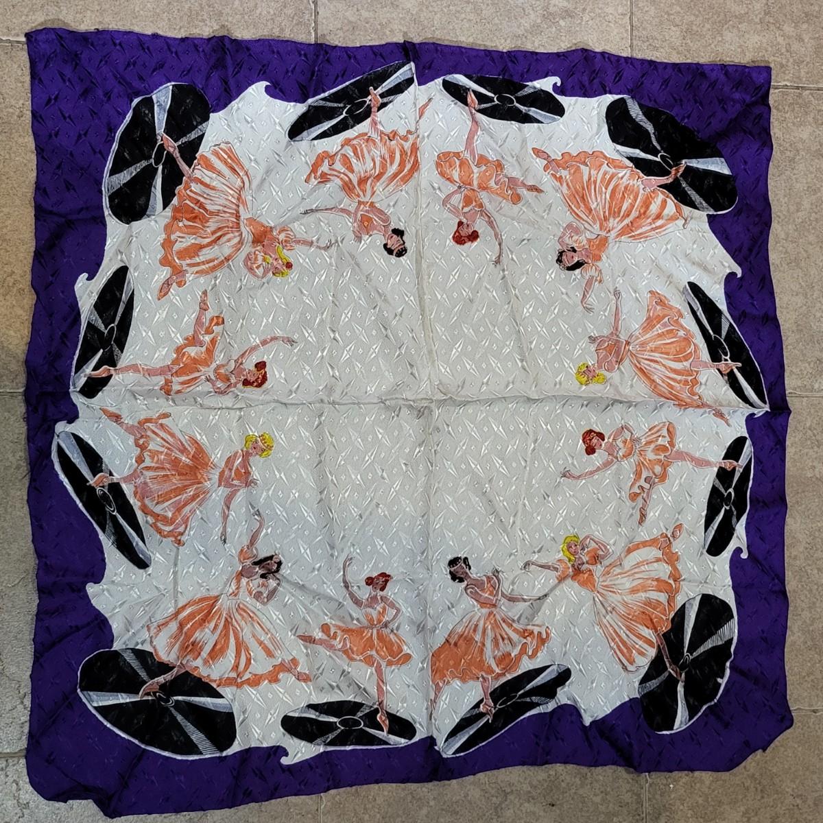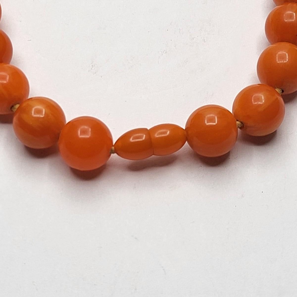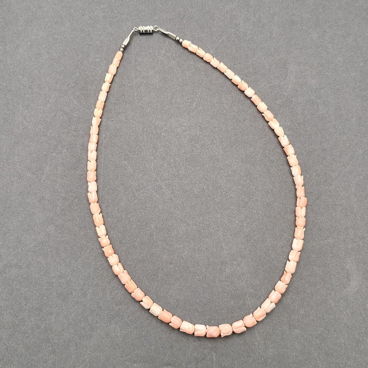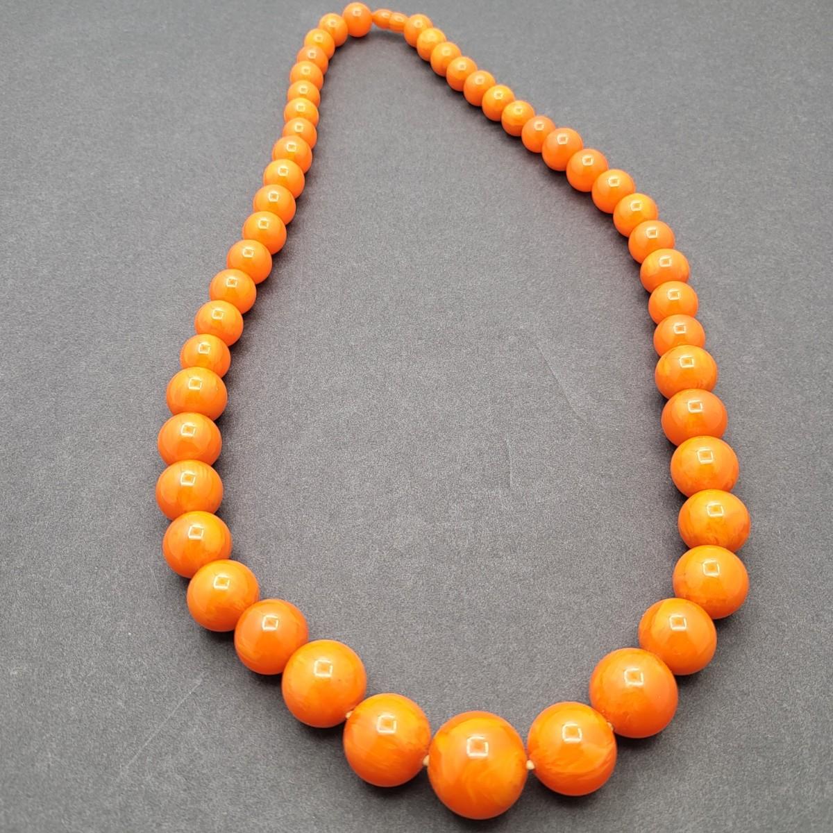 Coral colored bakelite? Graduated beaded necklace with twist clasp, 30". Dainty, real angel skin coral tulip choker style necklace with barrel twist clasp, 16". Vintage silk ballerina scarf, 31", made in Japan.