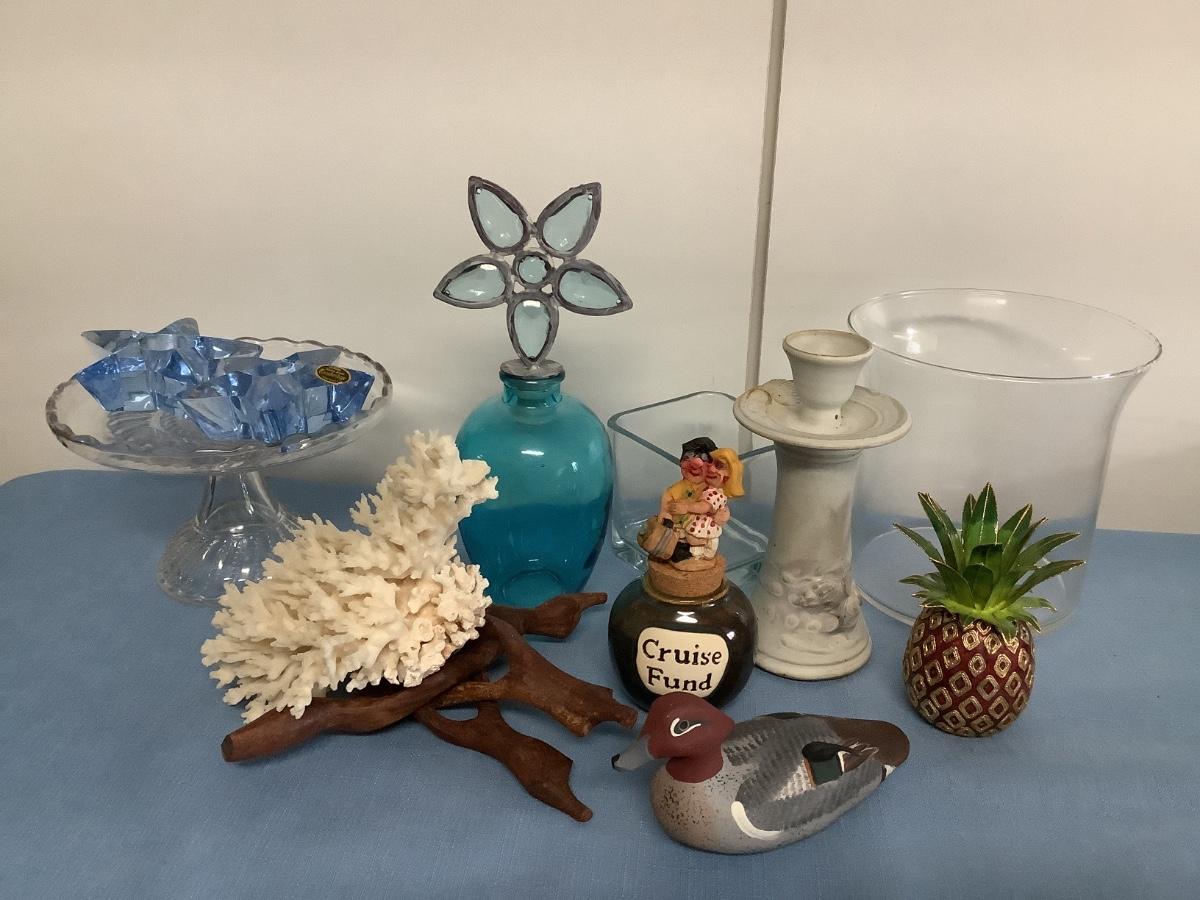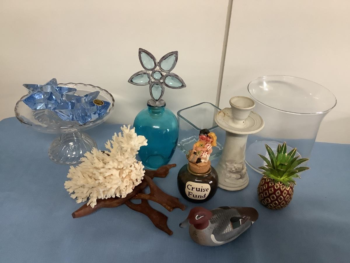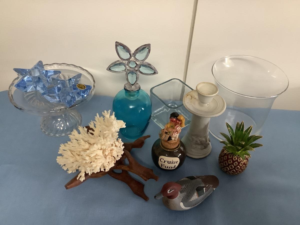 Coral decor lot-blue glass star candlesticks, pineapple, etc
