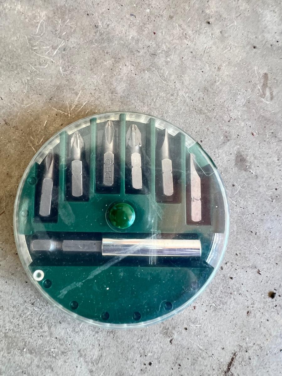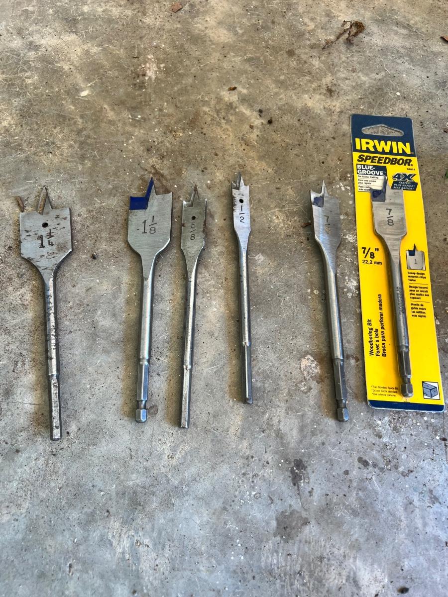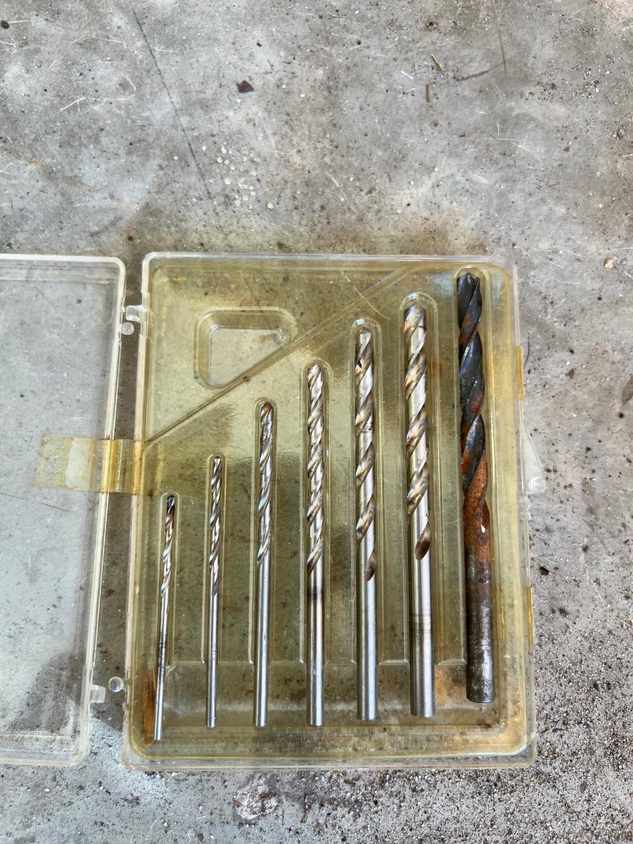 Two Black & Decker drills, one is 1/4 inch and one is 3/8 inch. Assorted drill bits - details shown and sizes in photographs. Both drills powered on when plugged in.