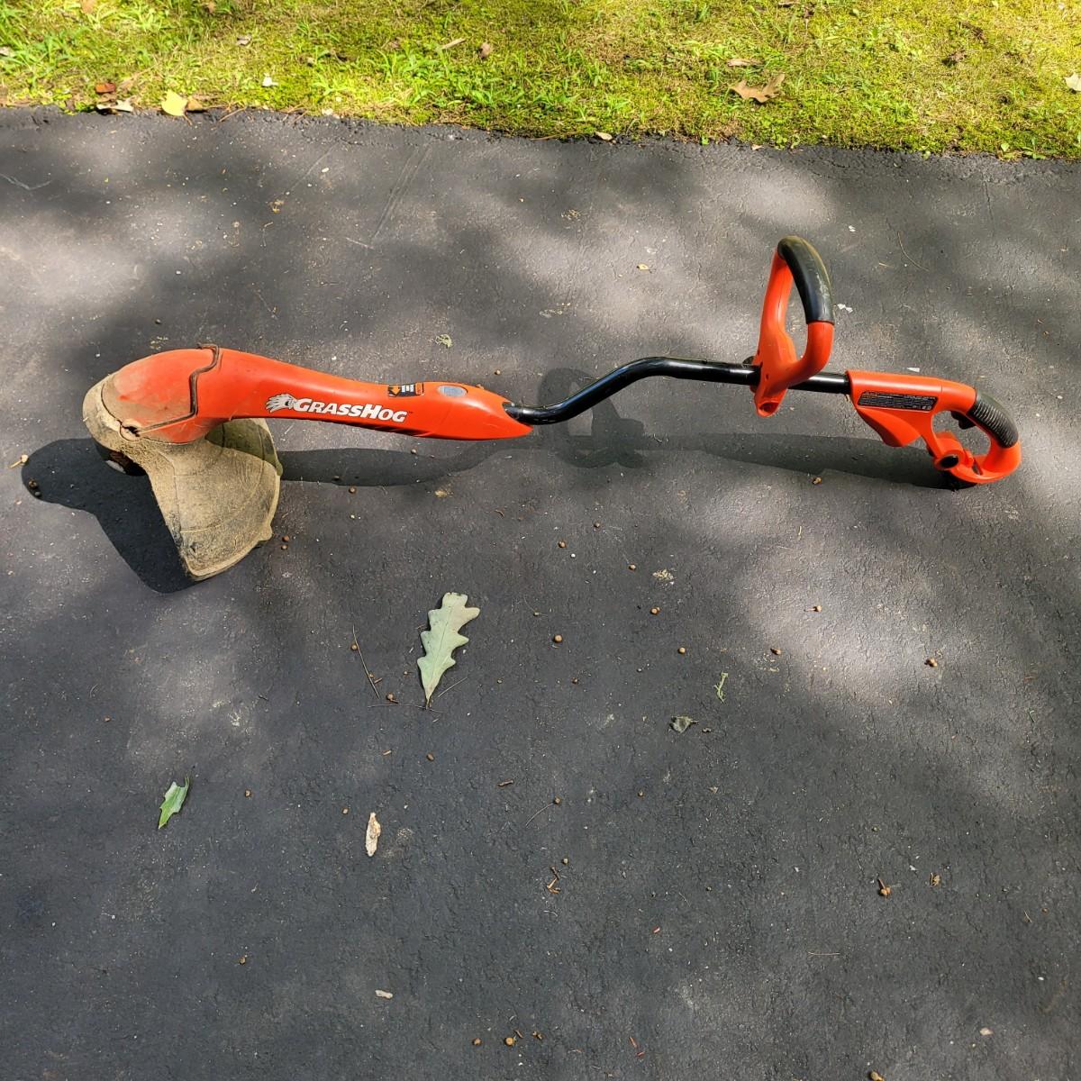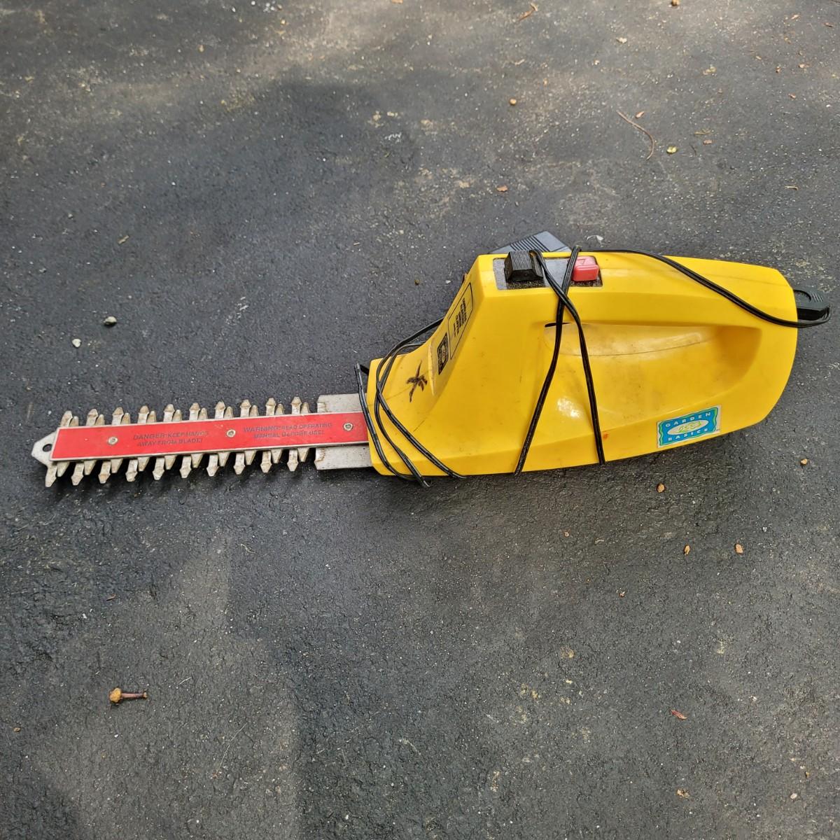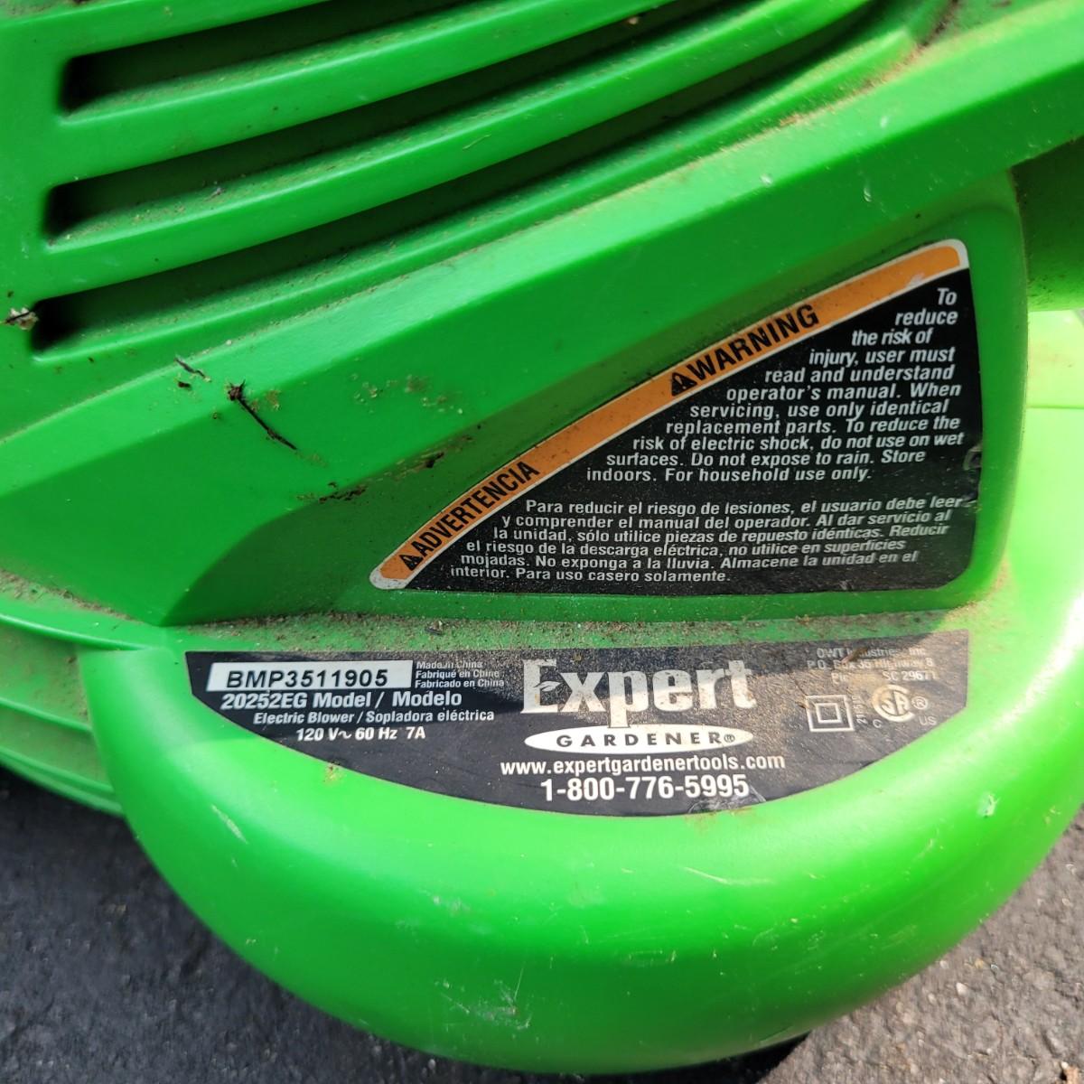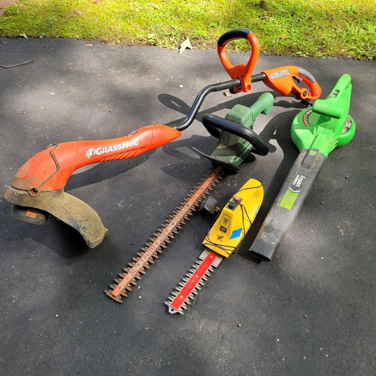 This lot includes four corded power tools for lawncare use. The first item is a grasshog corded weed eater. The second item is an Expert brand corded leaf blower. The last two items are corded hedge trimmers. One is larger (22") and one is a smaller (8") hand held size. All items powered on when plugged in.