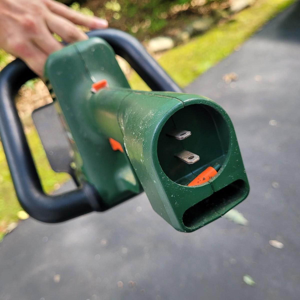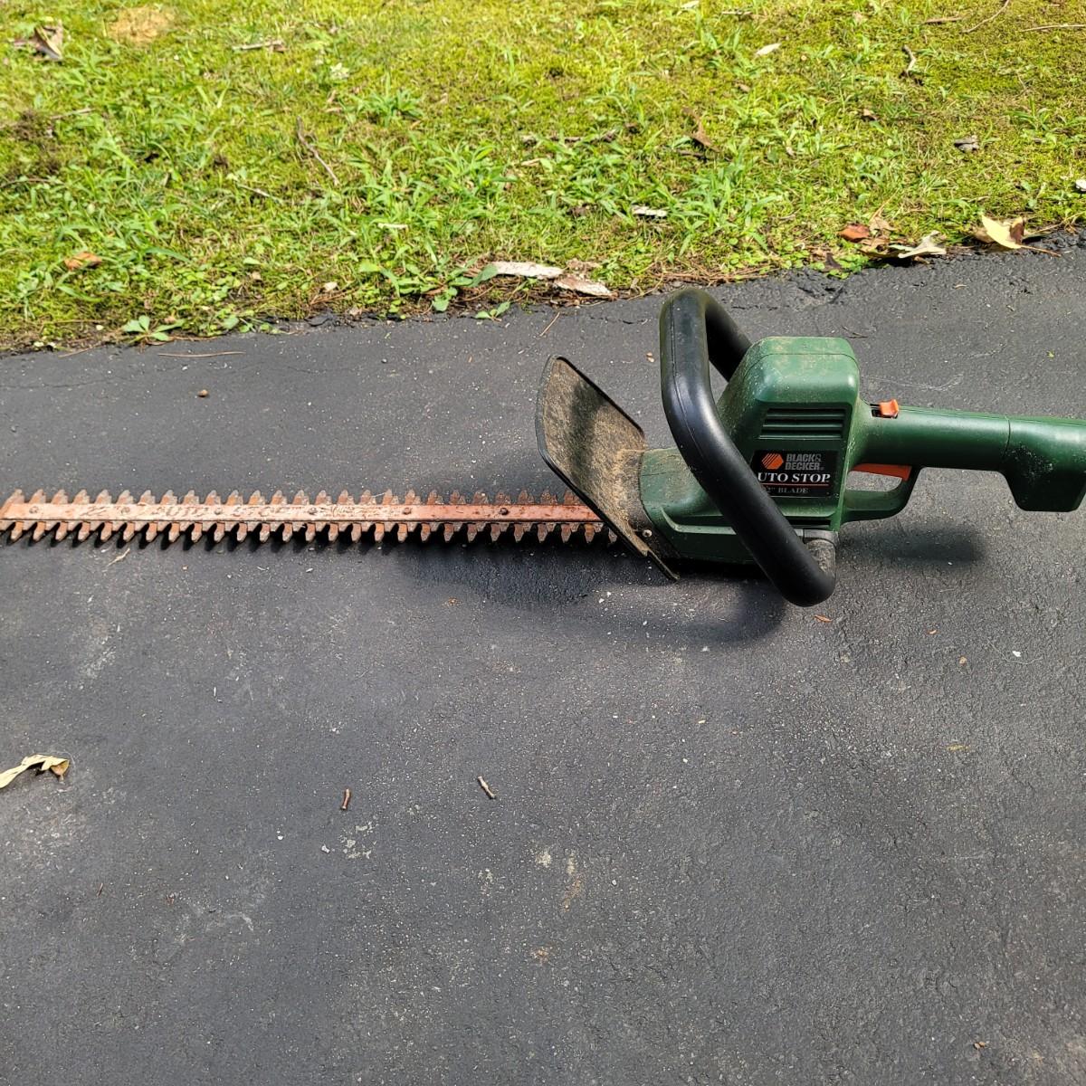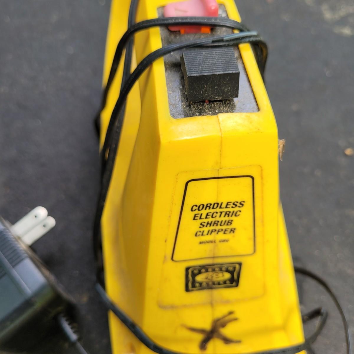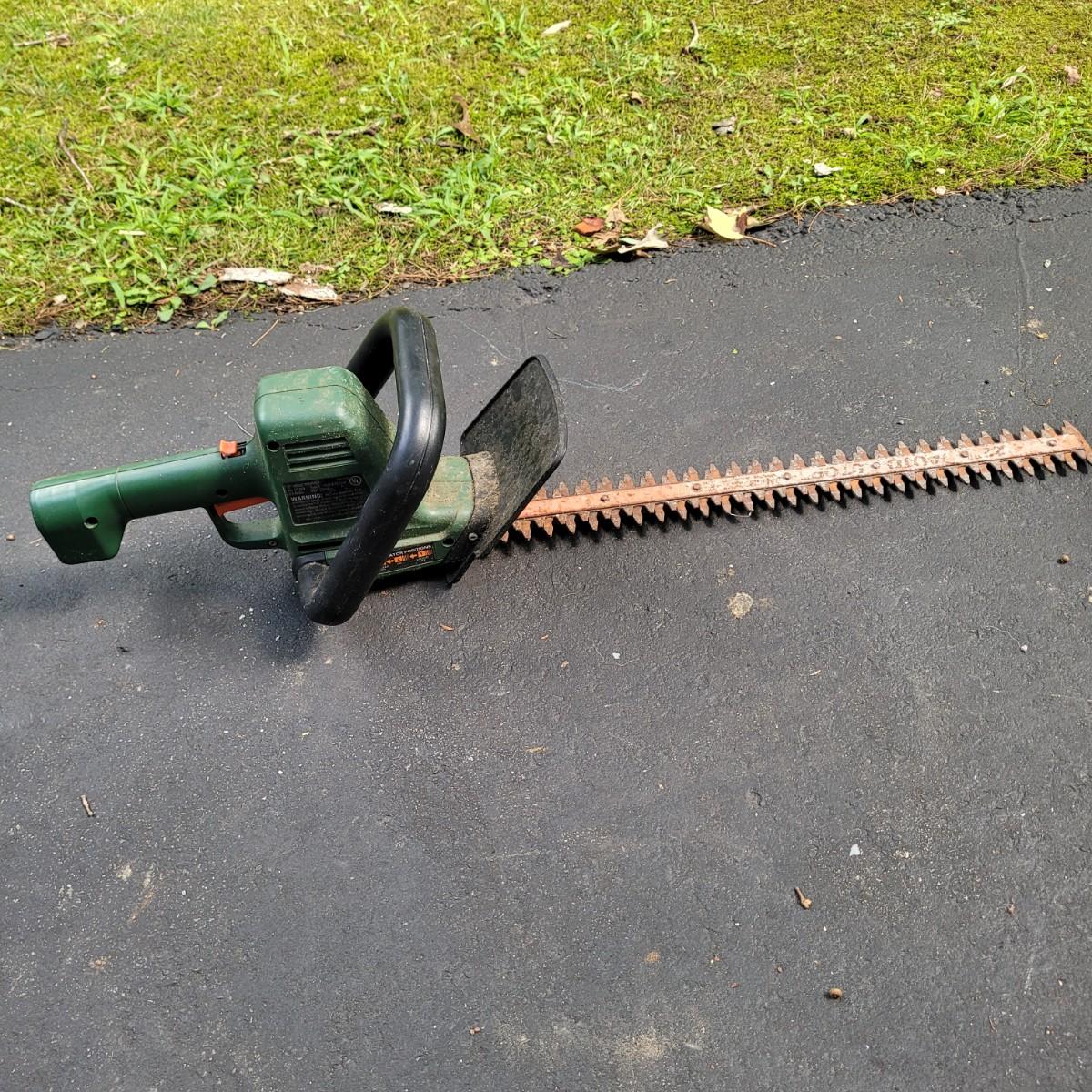 This lot includes four corded power tools for lawncare use. The first item is a grasshog corded weed eater. The second item is an Expert brand corded leaf blower. The last two items are corded hedge trimmers. One is larger (22") and one is a smaller (8") hand held size. All items powered on when plugged in.