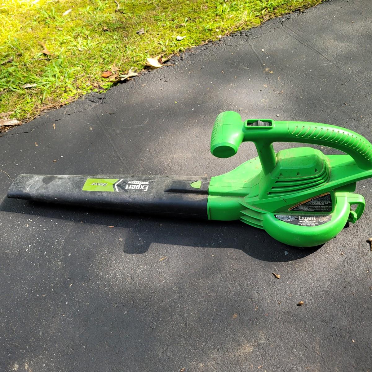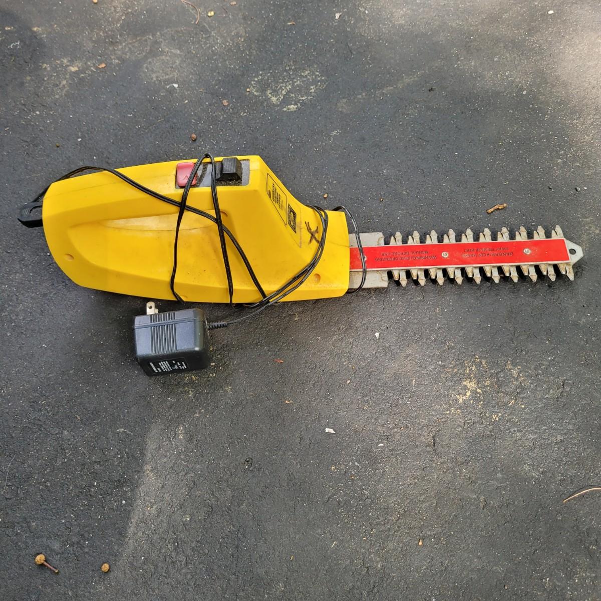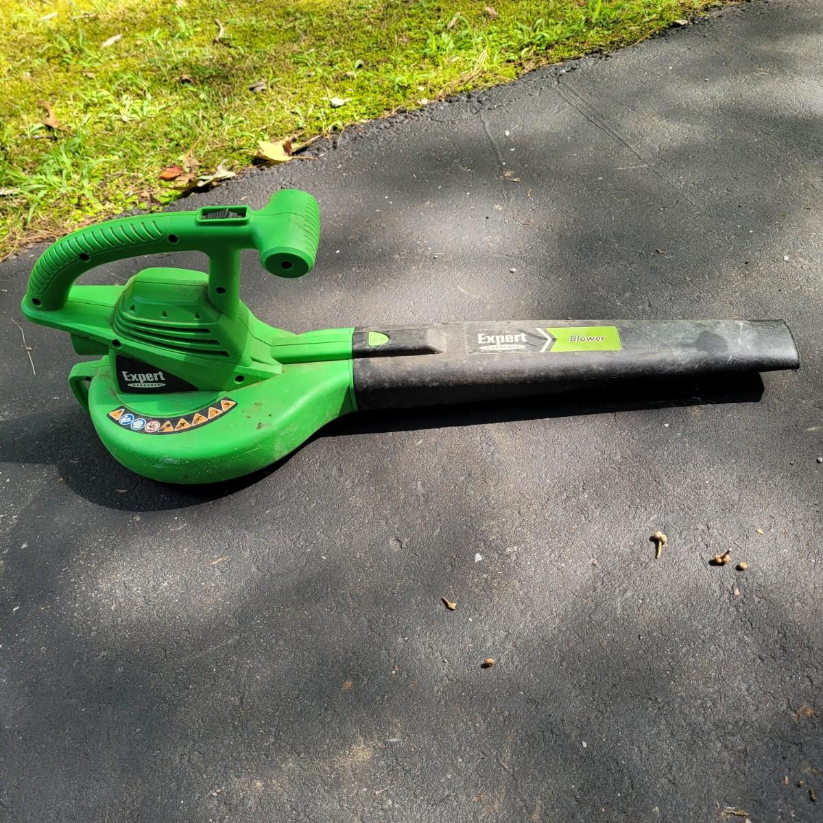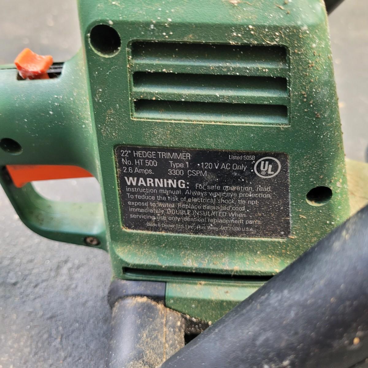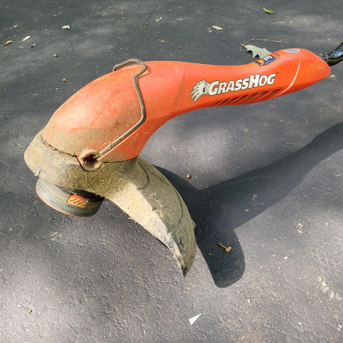 This lot includes four corded power tools for lawncare use. The first item is a grasshog corded weed eater. The second item is an Expert brand corded leaf blower. The last two items are corded hedge trimmers. One is larger (22") and one is a smaller (8") hand held size. All items powered on when plugged in.
