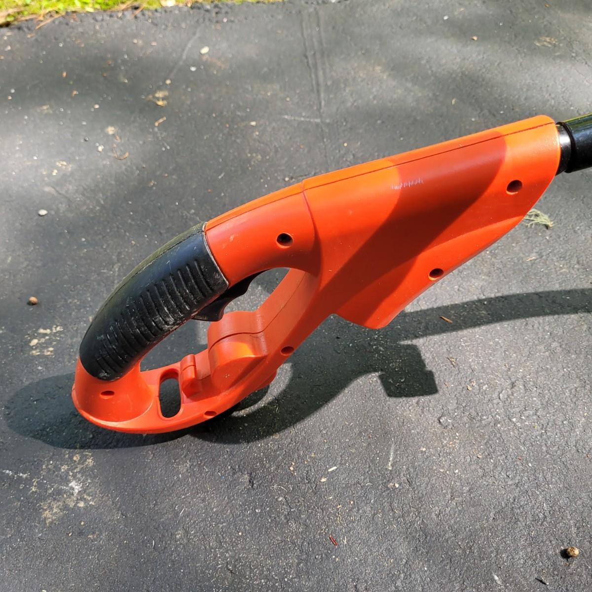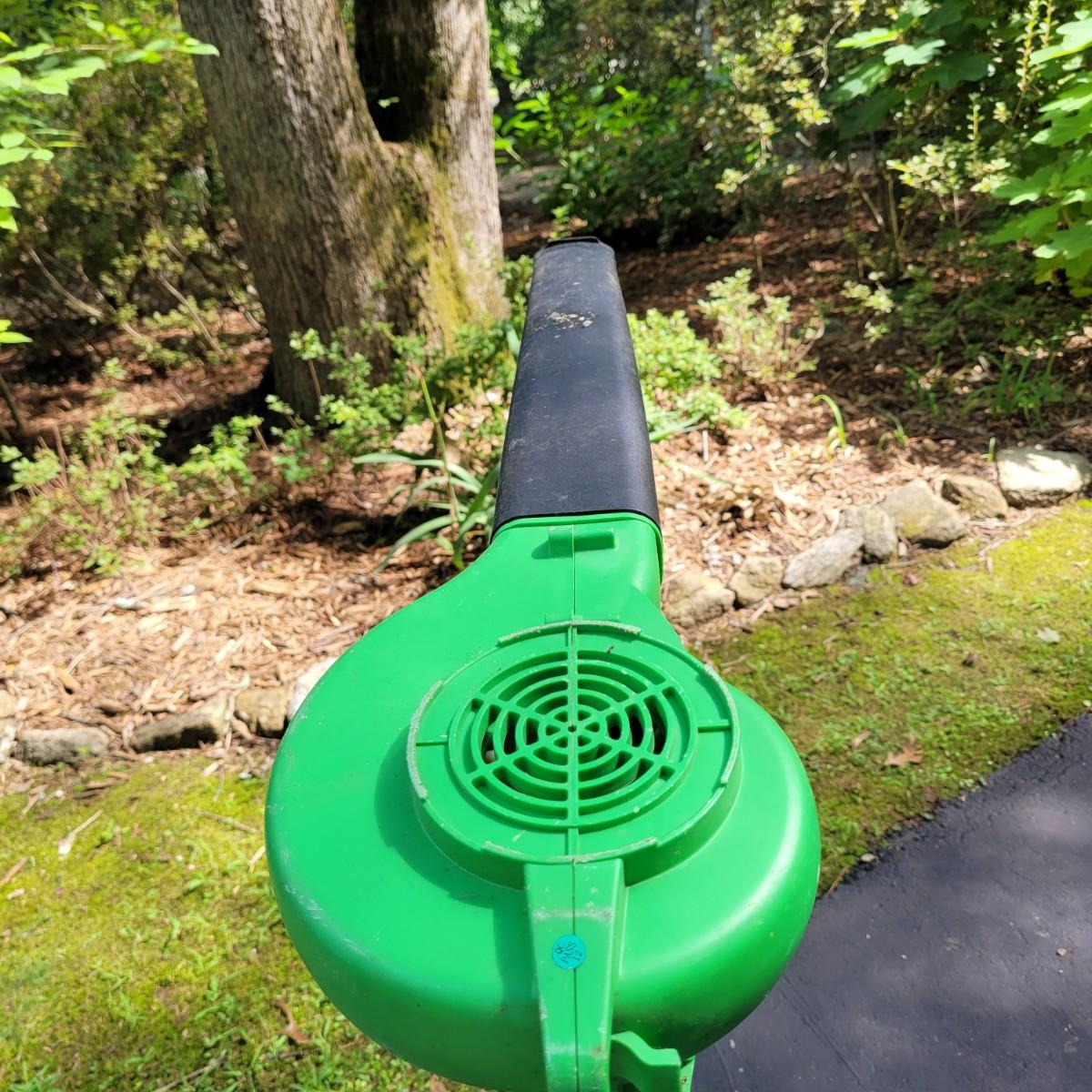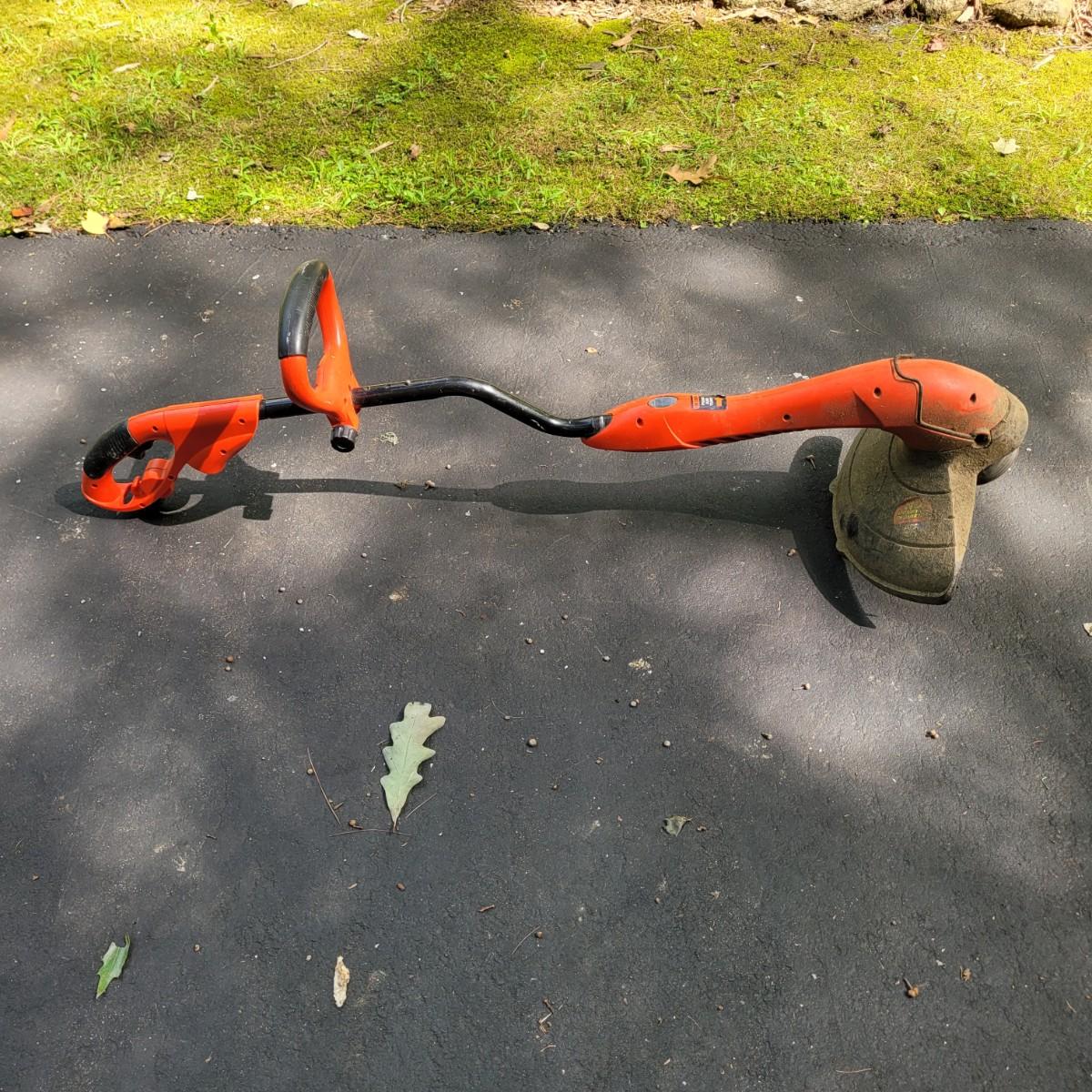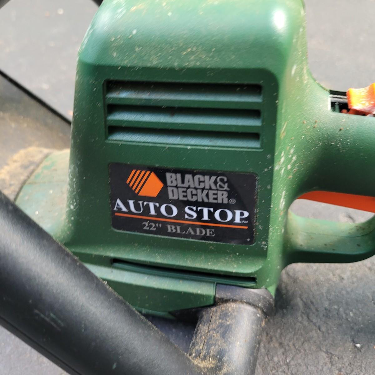 This lot includes four corded power tools for lawncare use. The first item is a grasshog corded weed eater. The second item is an Expert brand corded leaf blower. The last two items are corded hedge trimmers. One is larger (22") and one is a smaller (8") hand held size. All items powered on when plugged in.