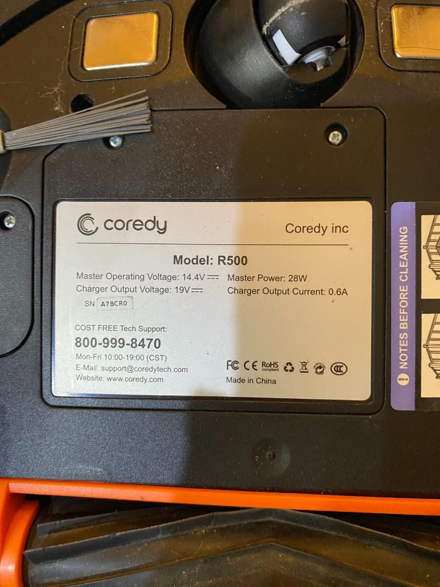 Coredy Robot vacuum cleaner. Model no. R500 with remote and charger. Works great.