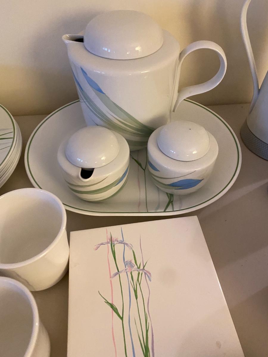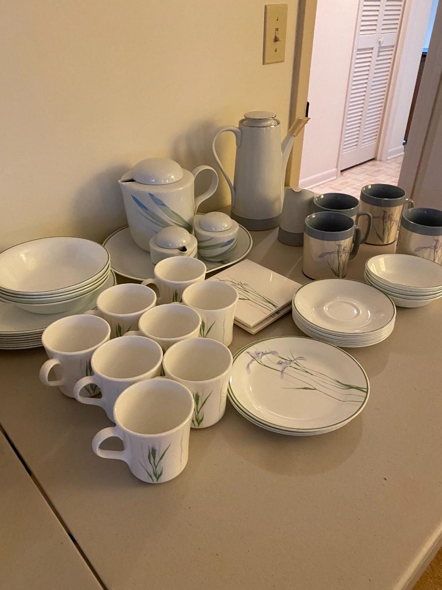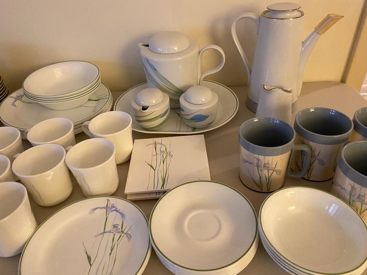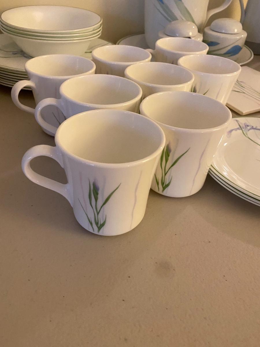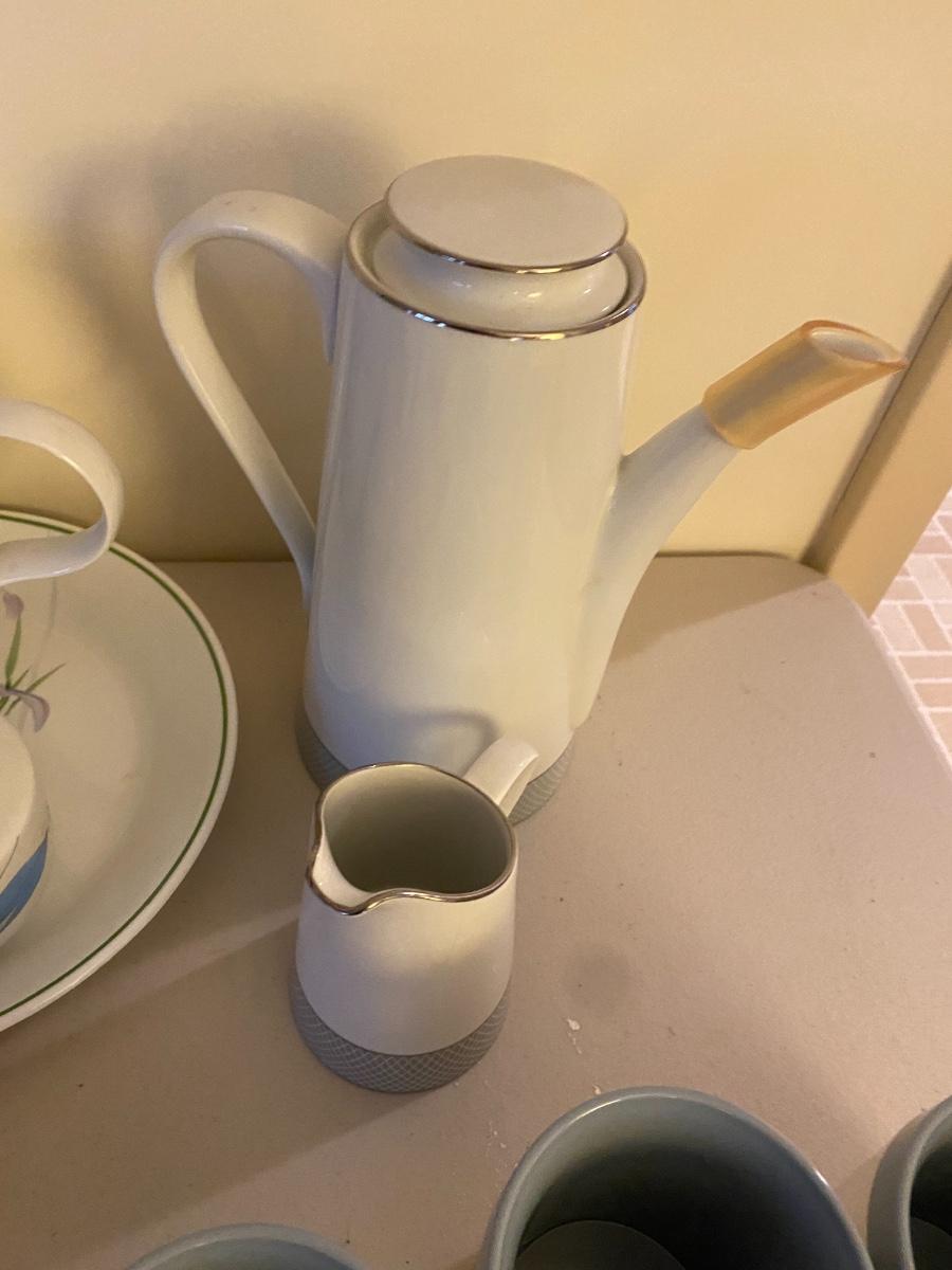Also includes DANSK and Block Spal. Comprises eight dinner plates, four bowls, three bread and butter dishes, four berry bowls, eight coffee cups and saucers, one oval tray and two trivets all by Corelle. Also includes a DANSK coffee pot with creamer and sugar, a Block Spal coffee pot and milk jug, and four Royal Crest plastic coffee cups.