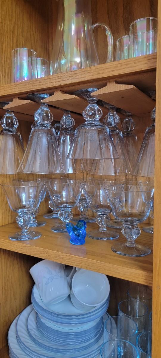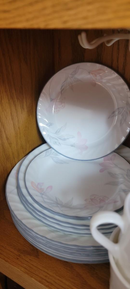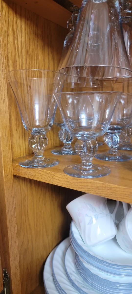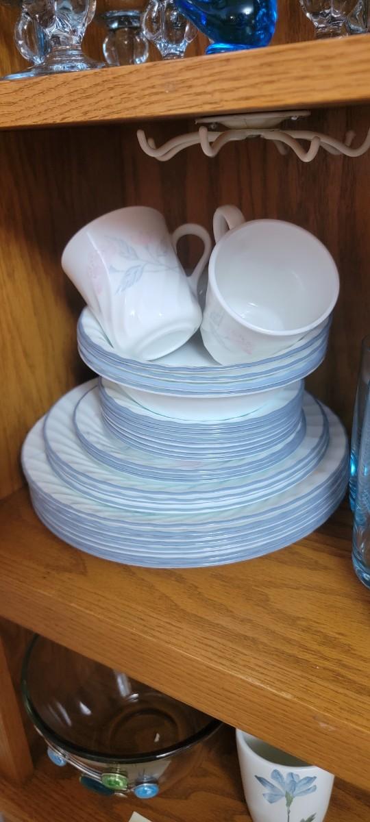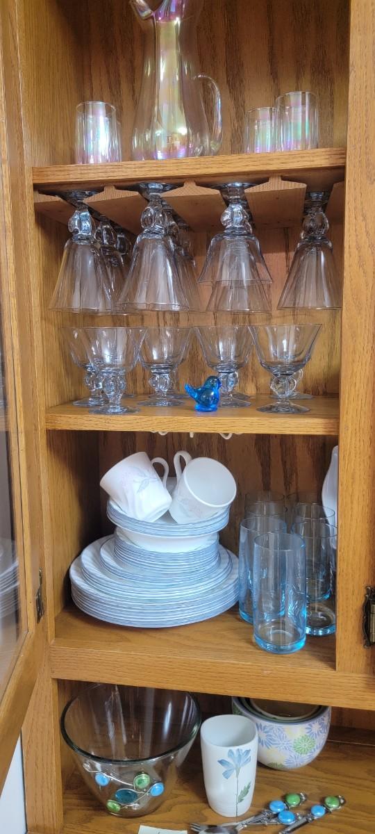 Corelle by Corning, 8 dinner plates plus misc pieces, 6 5.25" beverage glasses, two sizes blue stemware. 10 5.75", 10 4", bluebird.