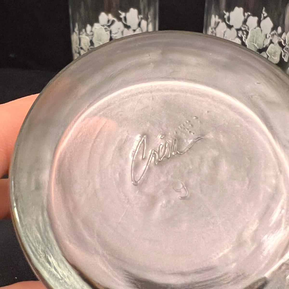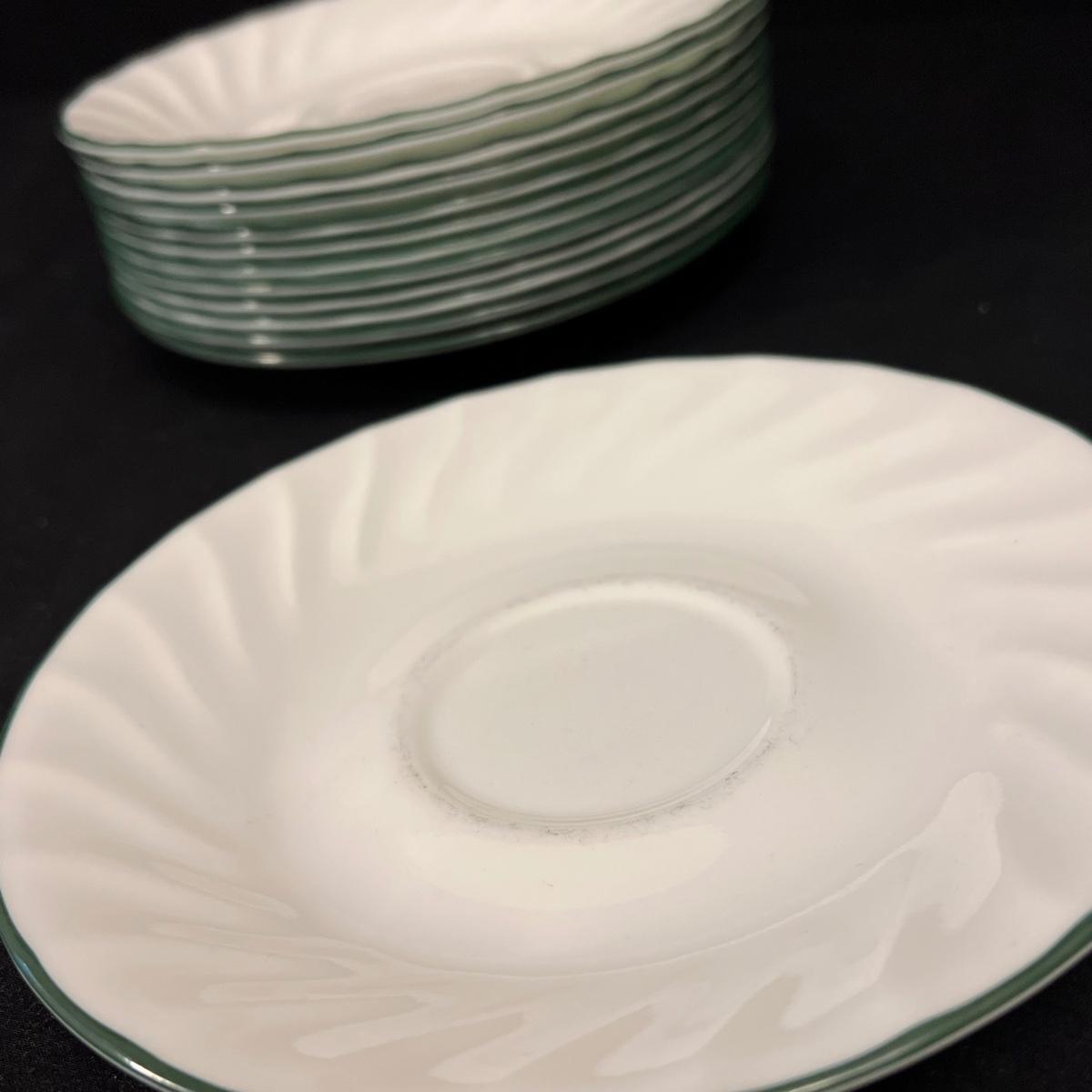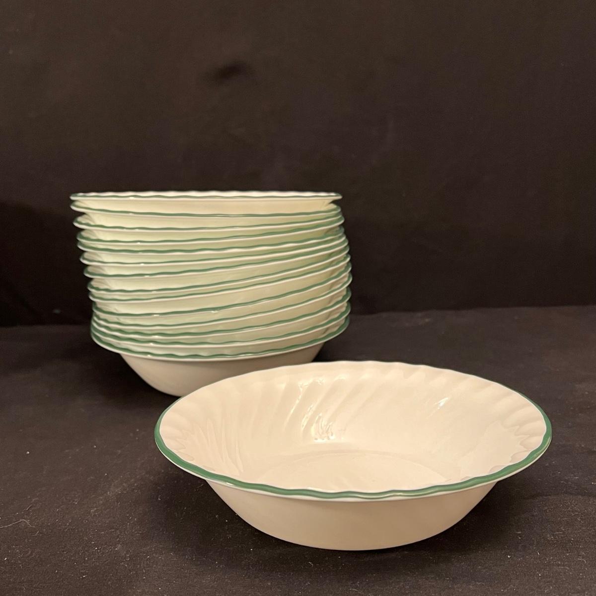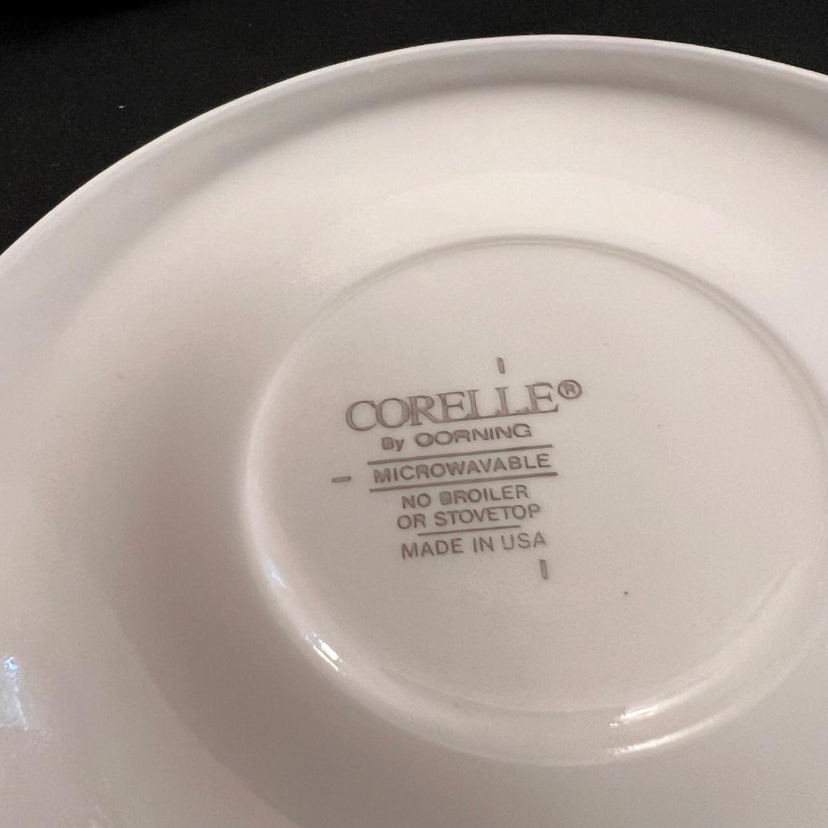 This set of Corelle Callaway dishes includes 14 mugs, 13 saucers, two deep bowls, 34 small plates, 15 bowls, and 33 large plates. Four clear glasses included are 'Crisa' brand and measure 2.5”D x 4”H. One creamer dish and one sugar dish are marked 'Jay Import Company'. The larger Corelle plates measure 10.5”D. The only signs of wear appear to be on the saucers, displaying markings from where the mugs are placed - see picture included. Shipping available. Shipping can be costly. We suggest contacting our preferred local shipping provider, Postage Express, with dimensions and getting an estimate before bidding: (828) 255-9250 or shipping@postageexpressnc.com.