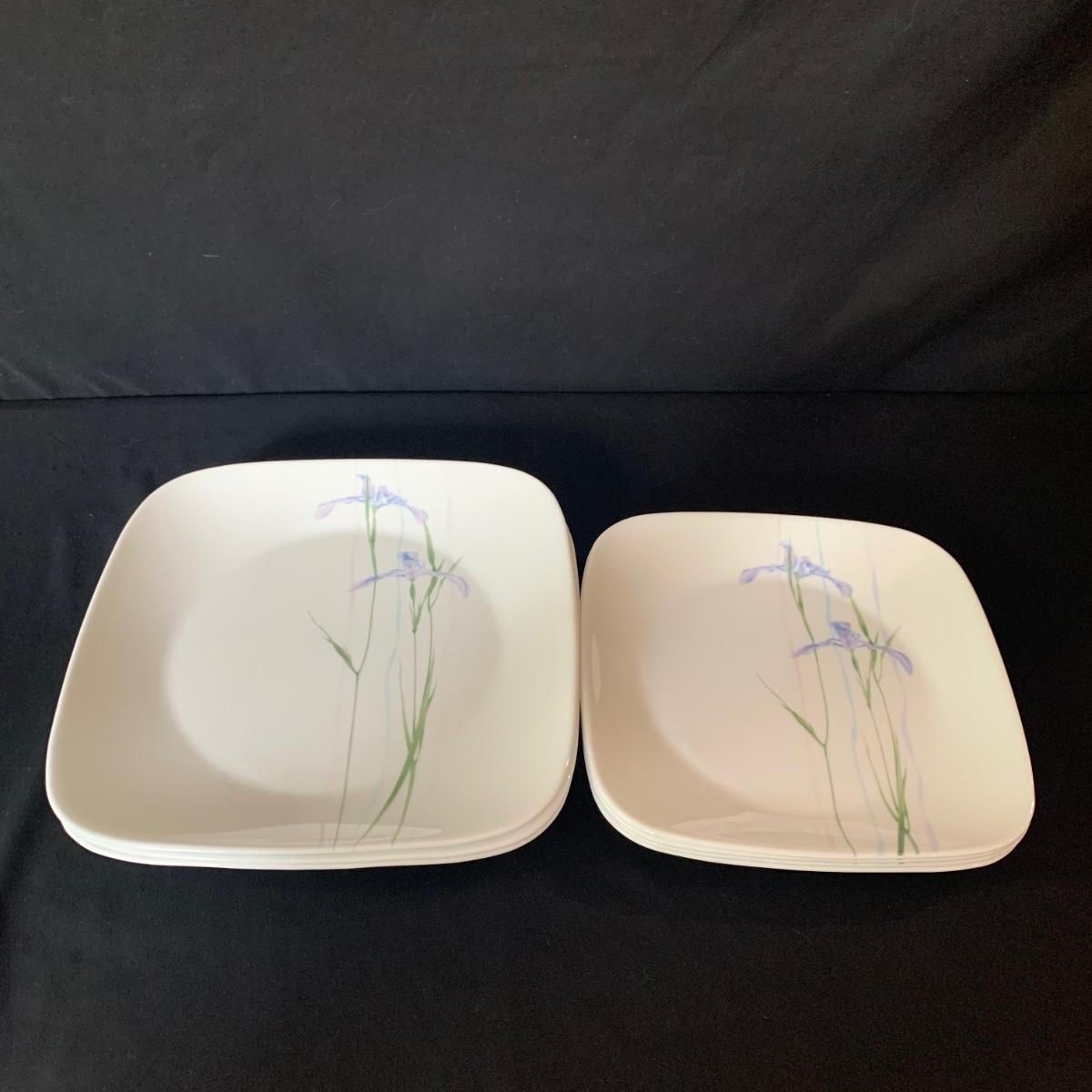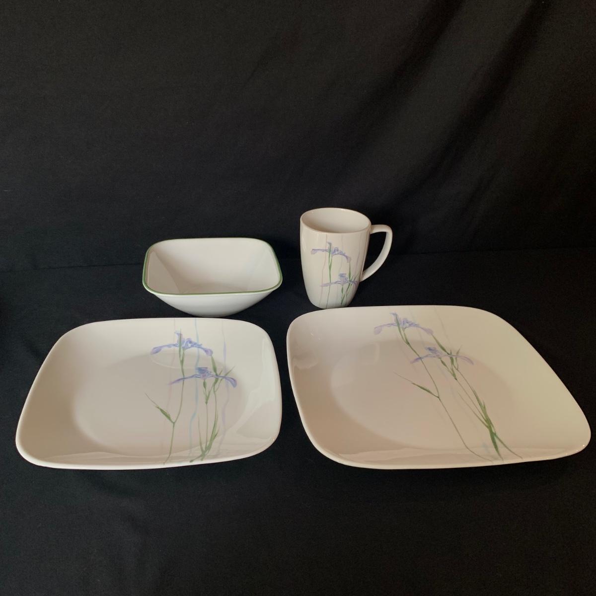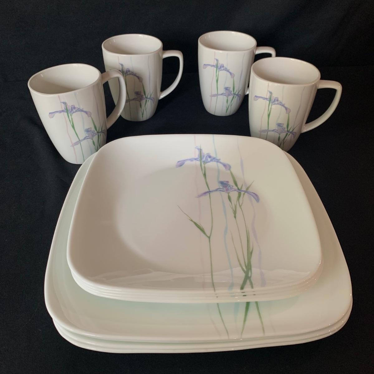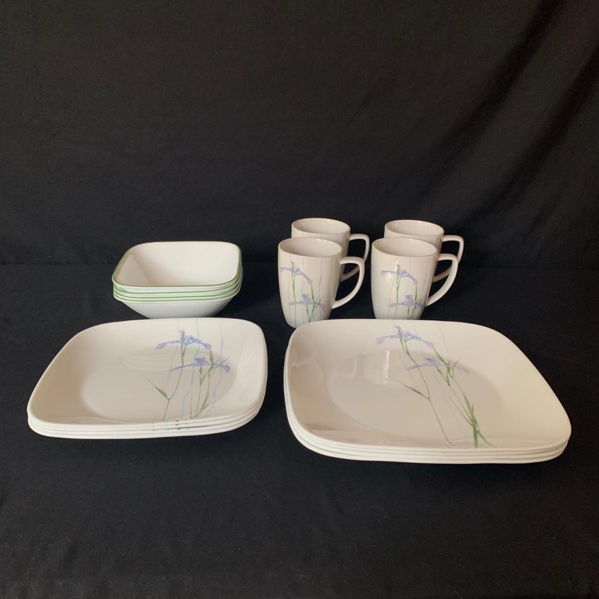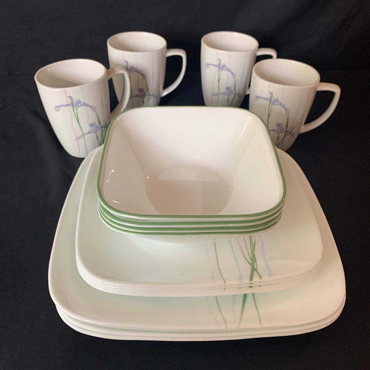 Corelle Coordinates 16-piece dish set in their Shadow Iris design. Set features four mugs, four square 10.5” plates, four square 9” plates, and four square bowls. The bowls have a green rim and no iris design. The plates and bowls are marked “Vitrelle” and the mugs are marked “Porcelain”. No chips, cracks, or scratches are noted in the set.