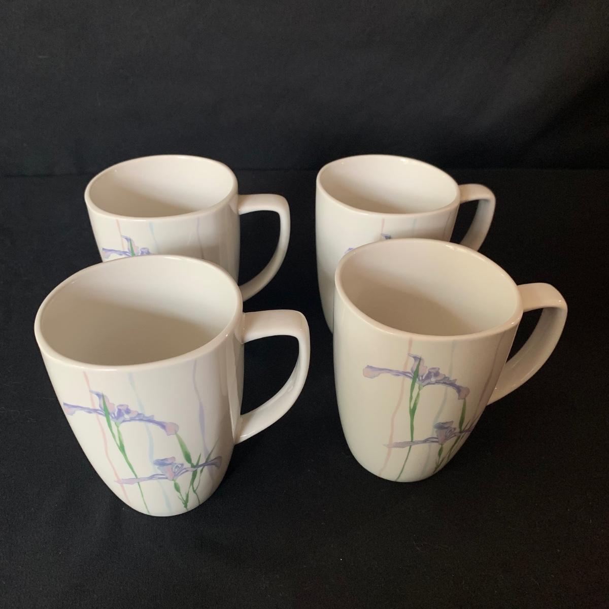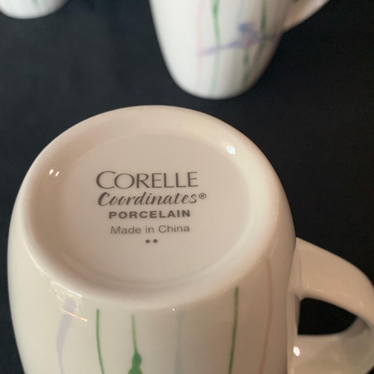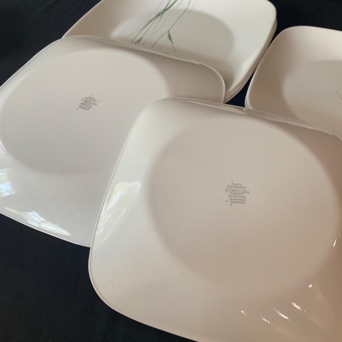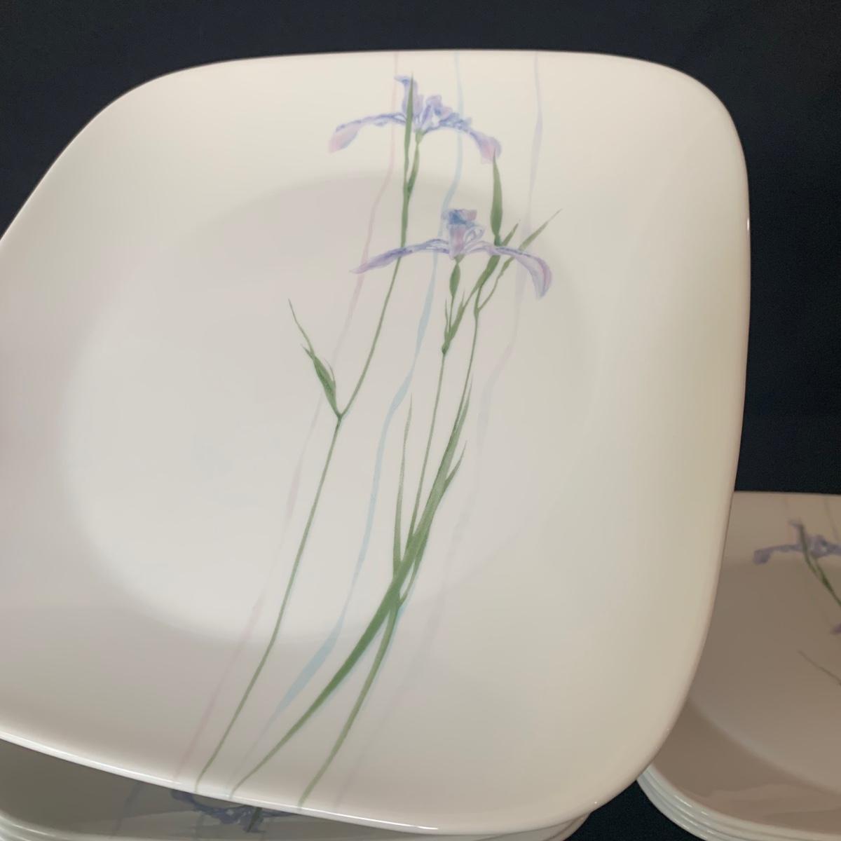 Corelle Coordinates 16-piece dish set in their Shadow Iris design. Set features four mugs, four square 10.5” plates, four square 9” plates, and four square bowls. The bowls have a green rim and no iris design. The plates and bowls are marked “Vitrelle” and the mugs are marked “Porcelain”. No chips, cracks, or scratches are noted in the set.