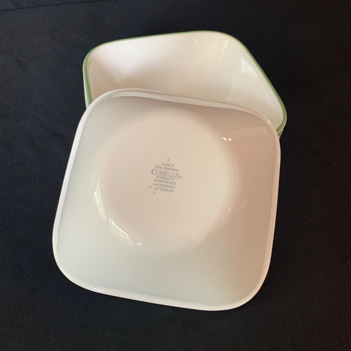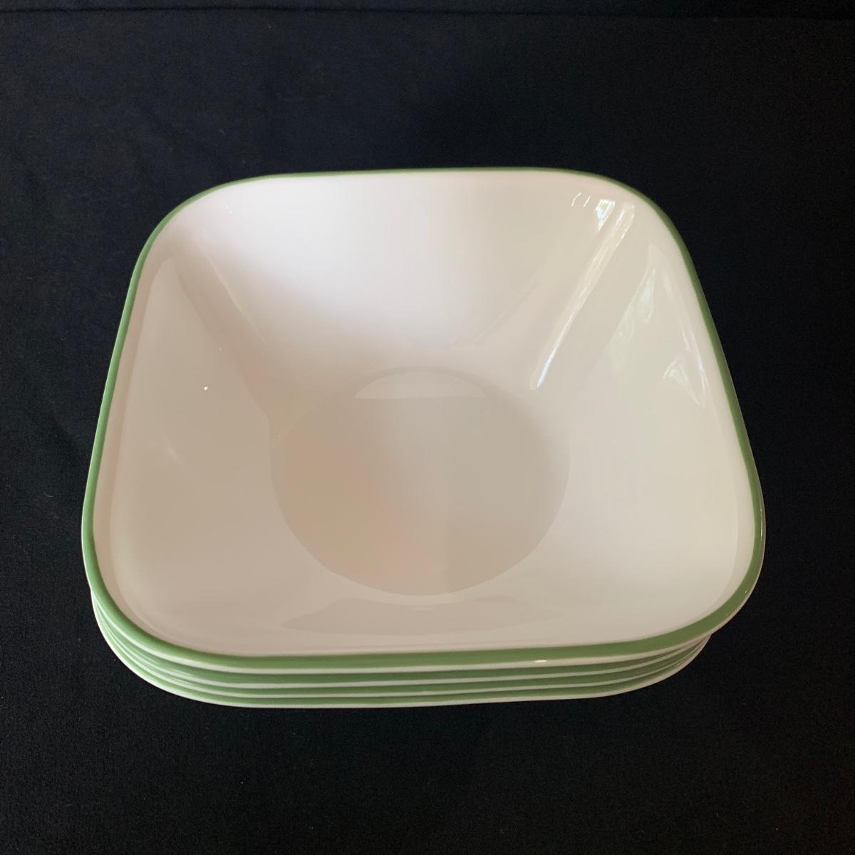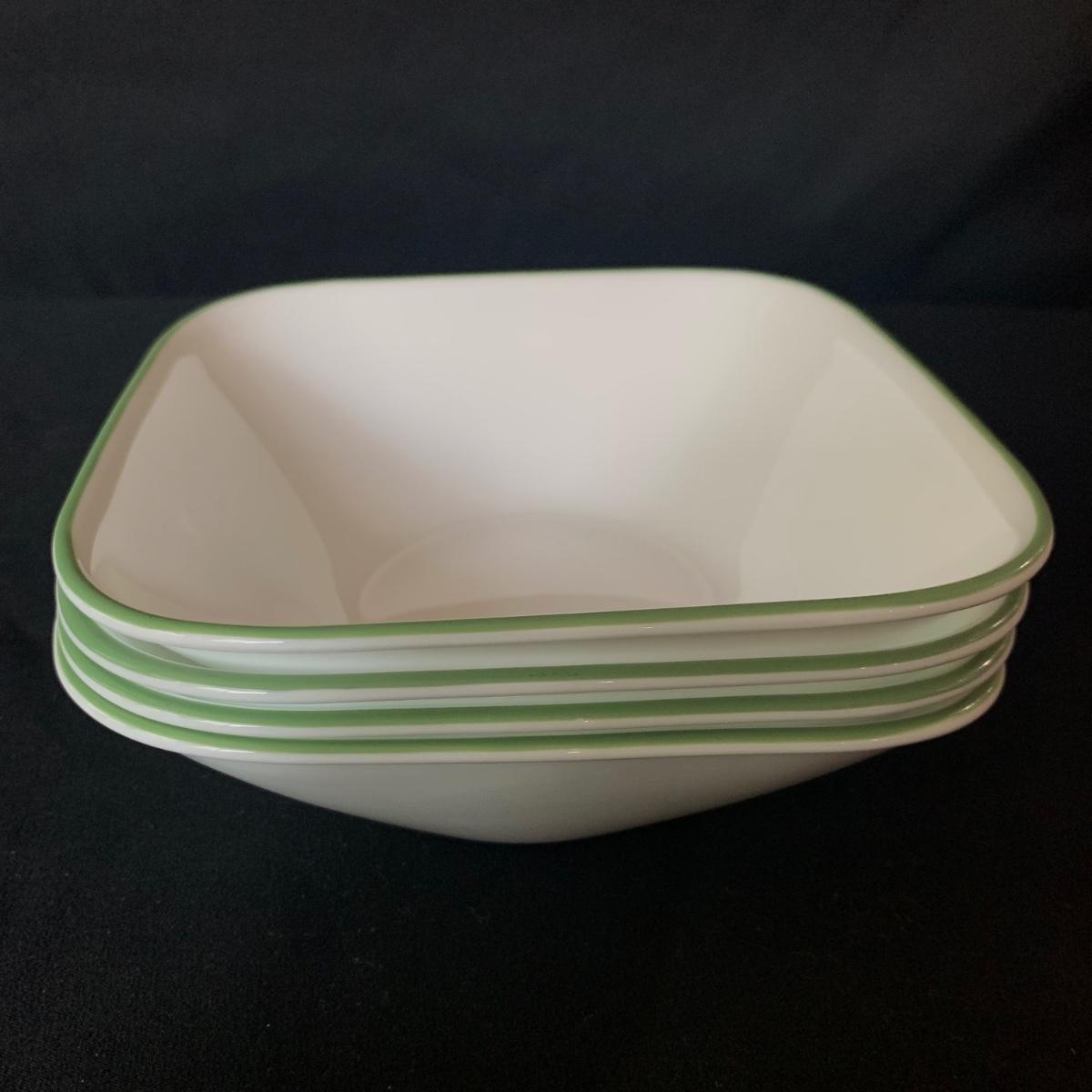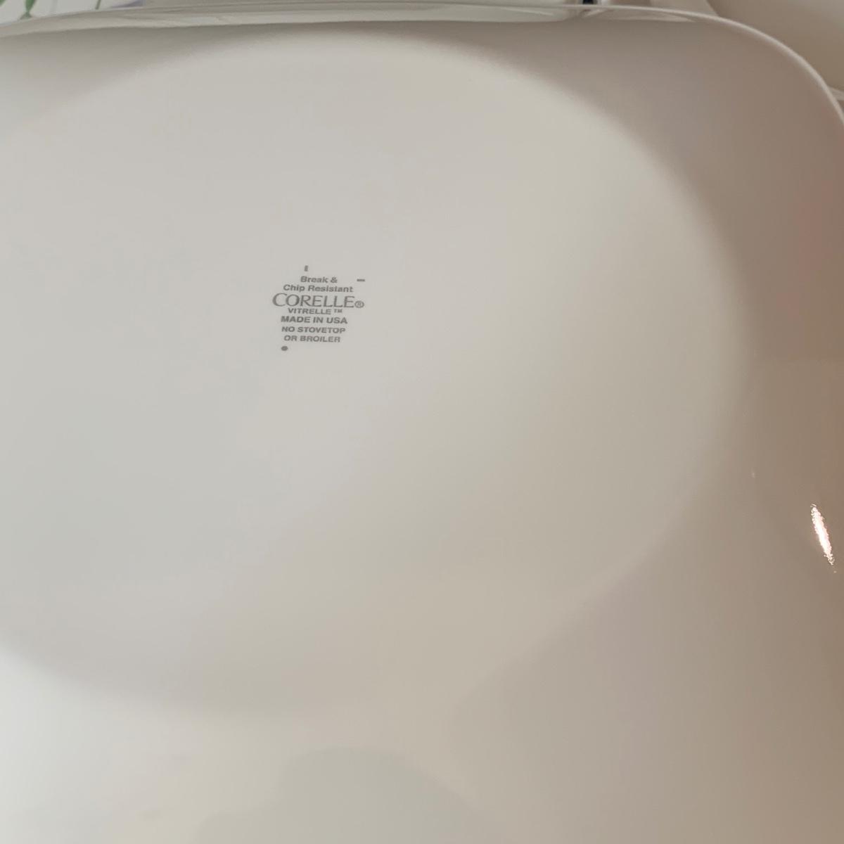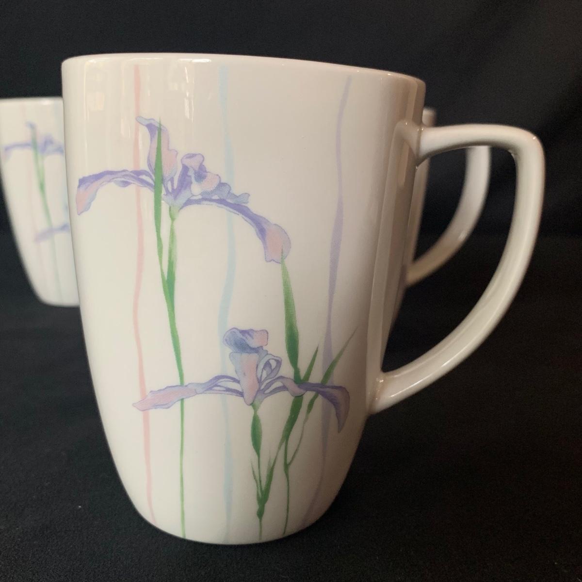 Corelle Coordinates 16-piece dish set in their Shadow Iris design. Set features four mugs, four square 10.5” plates, four square 9” plates, and four square bowls. The bowls have a green rim and no iris design. The plates and bowls are marked “Vitrelle” and the mugs are marked “Porcelain”. No chips, cracks, or scratches are noted in the set.