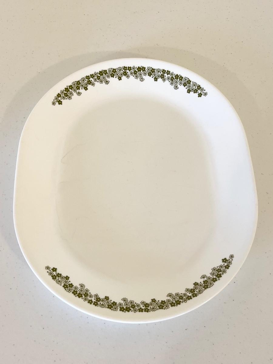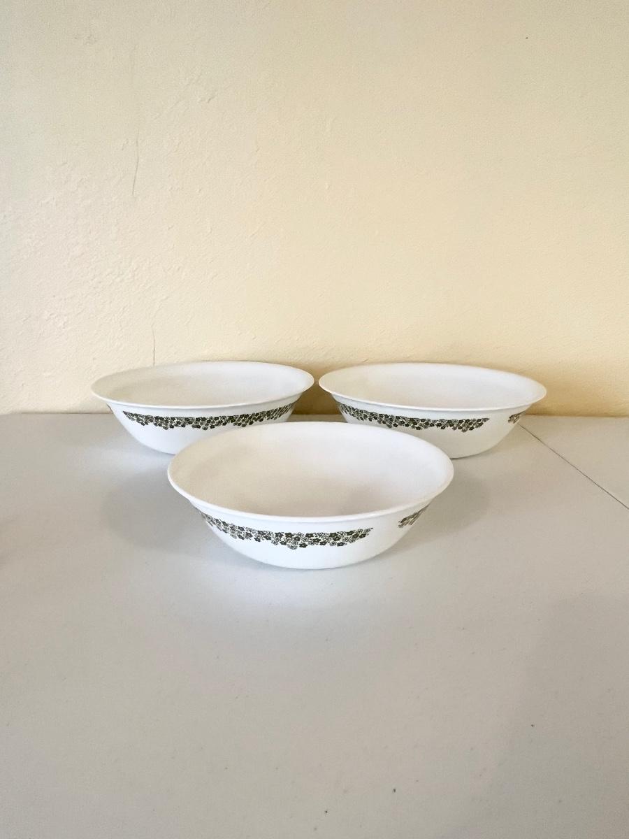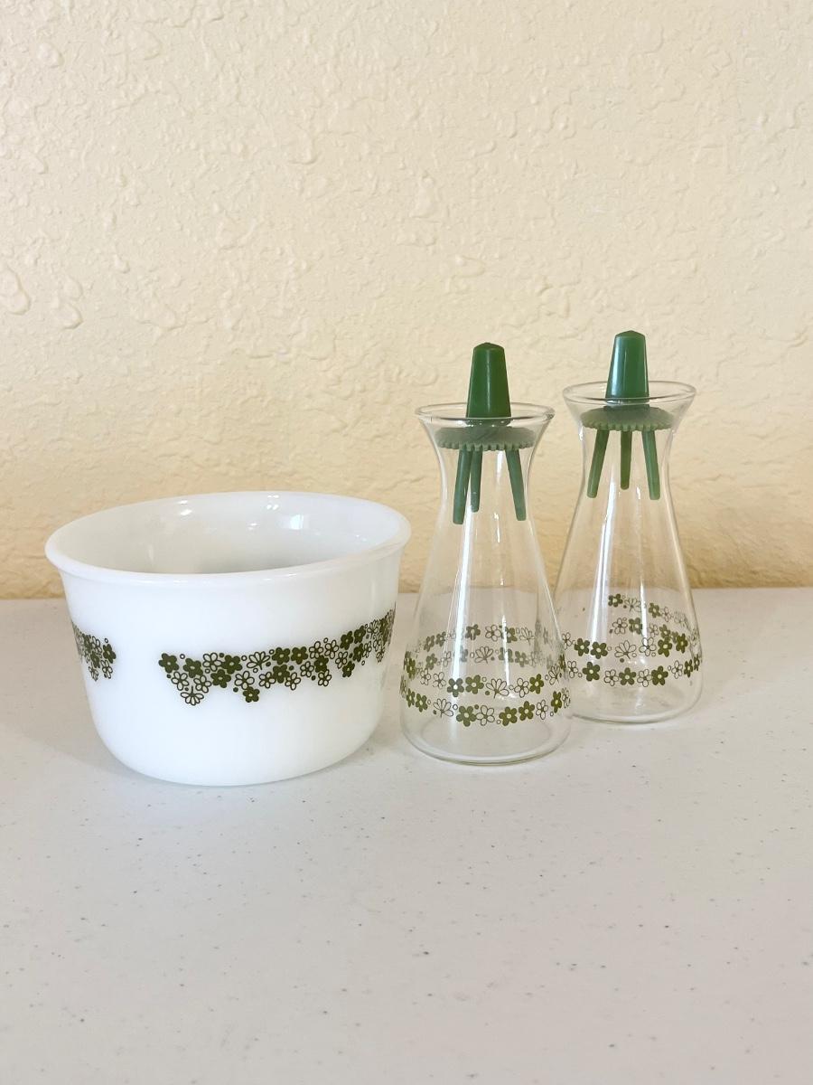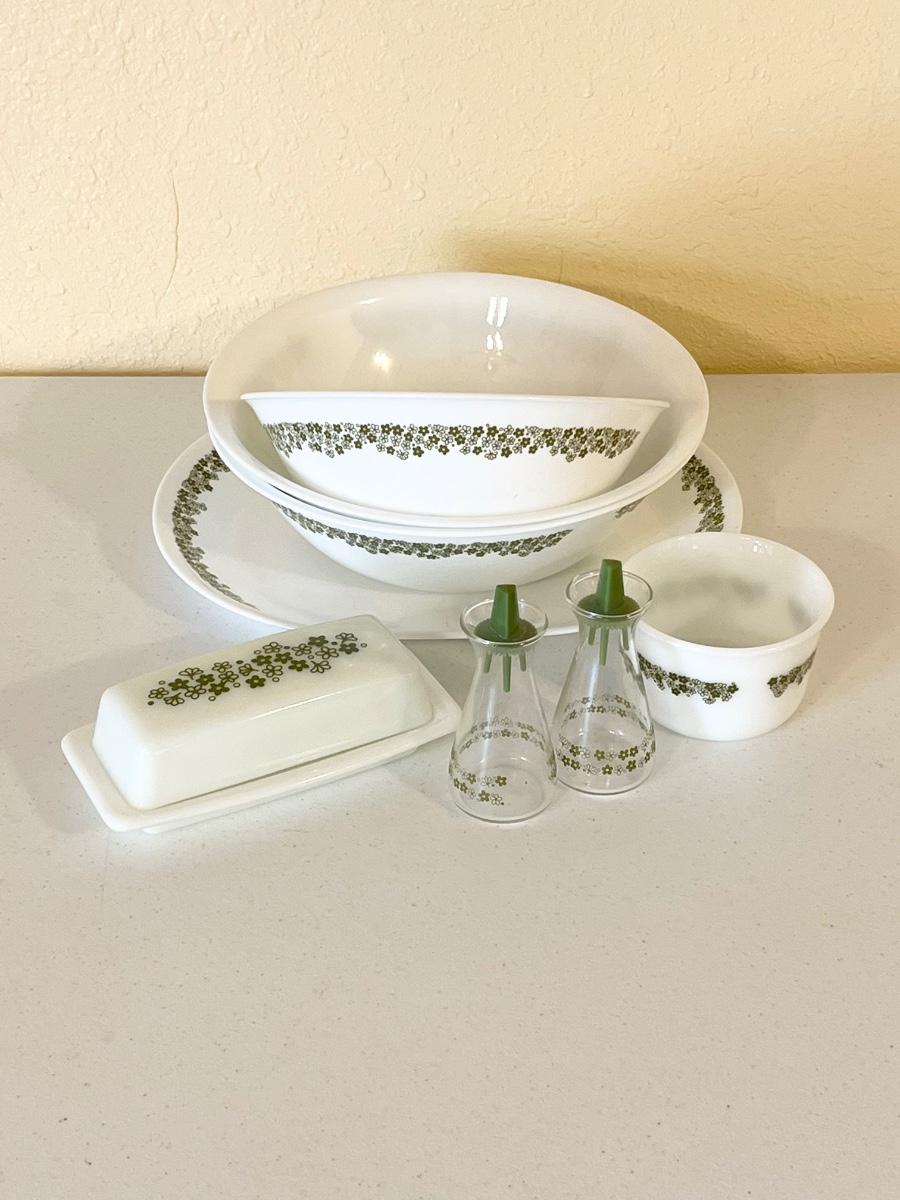 Two large bowls = 3” x 10 ~ one medium bowl = 2.5” H x 8.5” ~ one small bowl = 2.5” x 3.5” ~ 1 butter dish ~ one oval platter = 10” x 12” ~ salt & pepper shakers = 3.5” H x 2” round