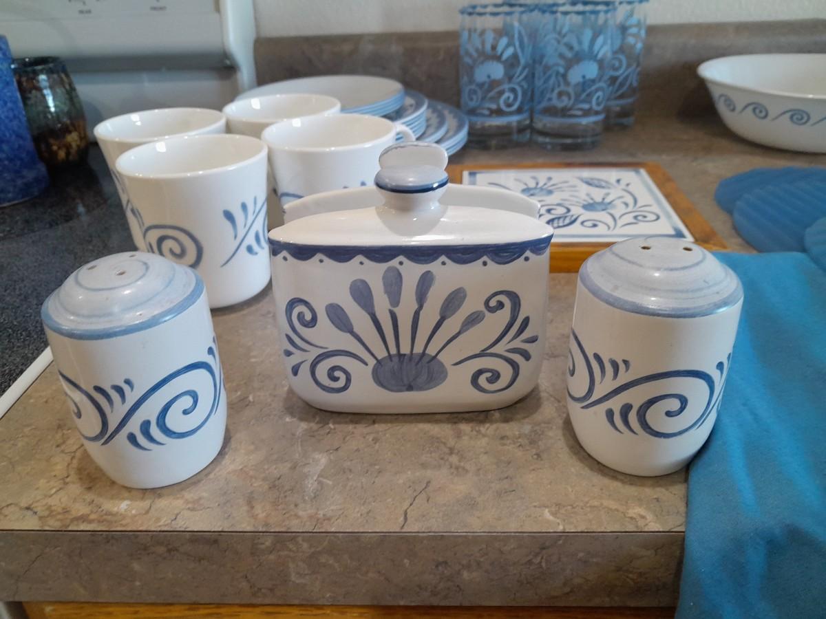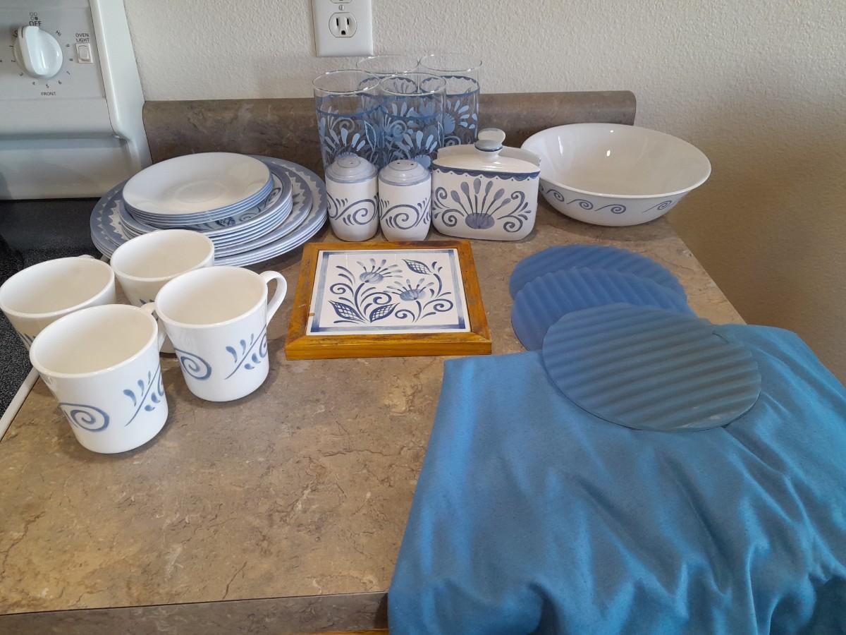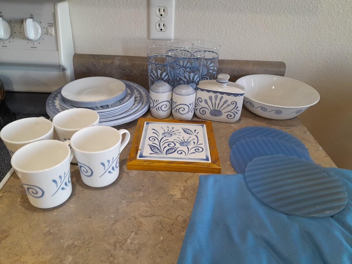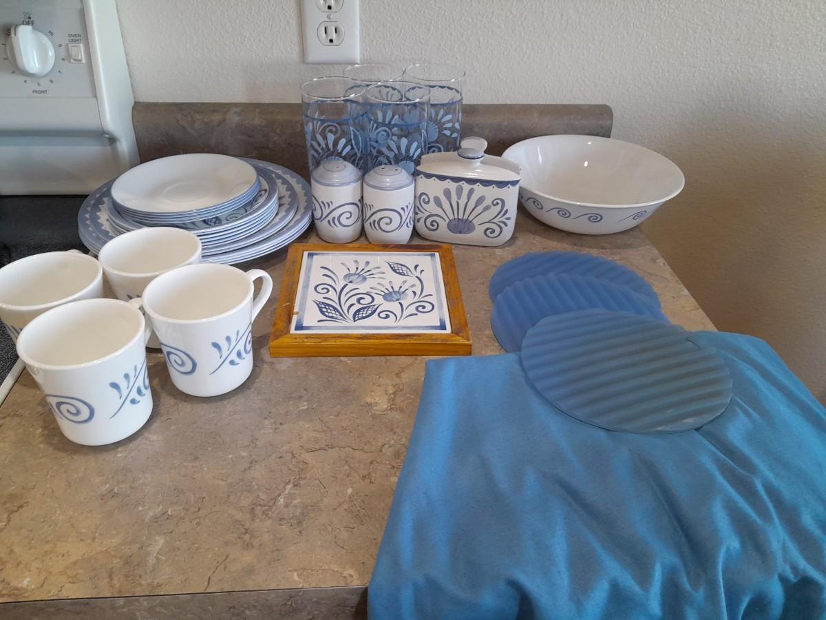 4 DRINKING GLASSES, NAPKIN HOLDER, SERVING BOWL, 4 COFFEE MUGS, SALT/PEPPER SHAKERS, HOT PLATE, 4 DINNER PLATES, 2 SALAD AND 6 BREAD PLATES, 4 SAUCERS, ROUND TABLECLOTH