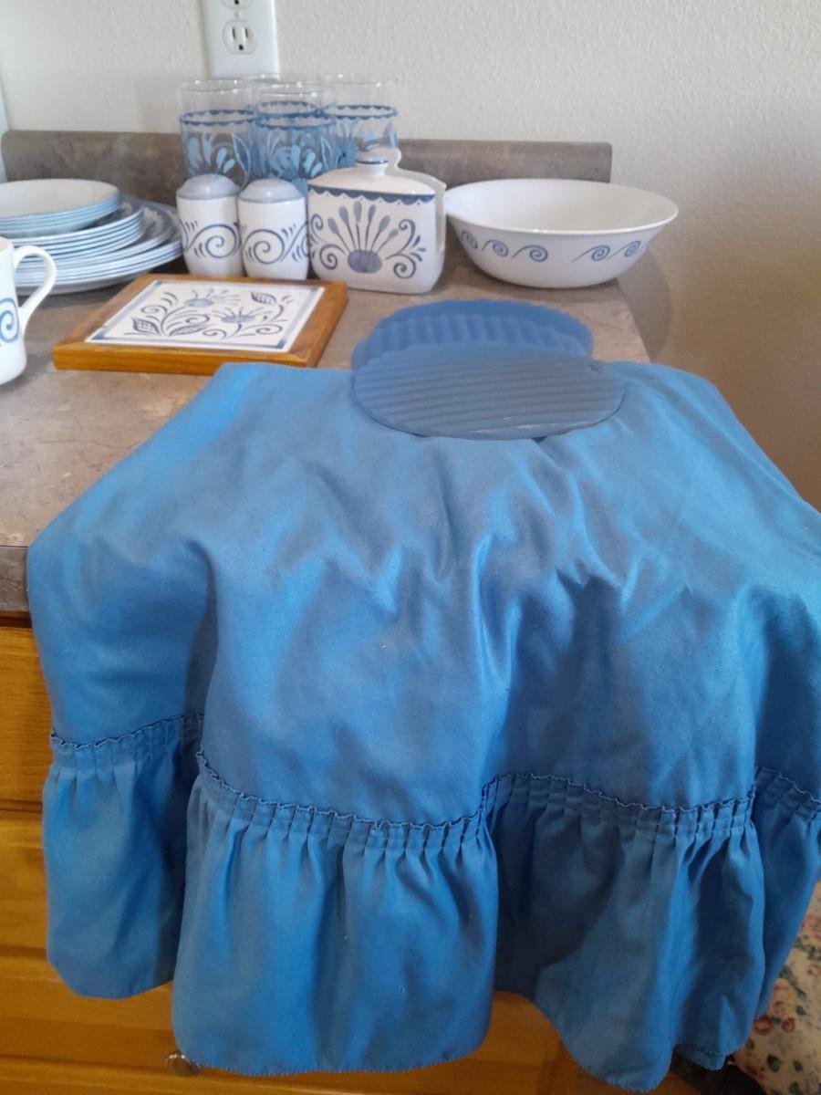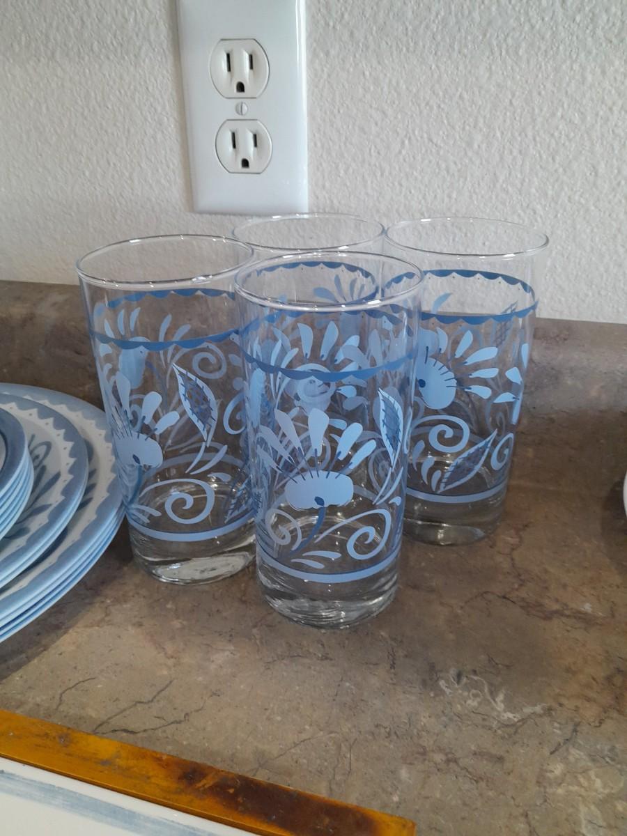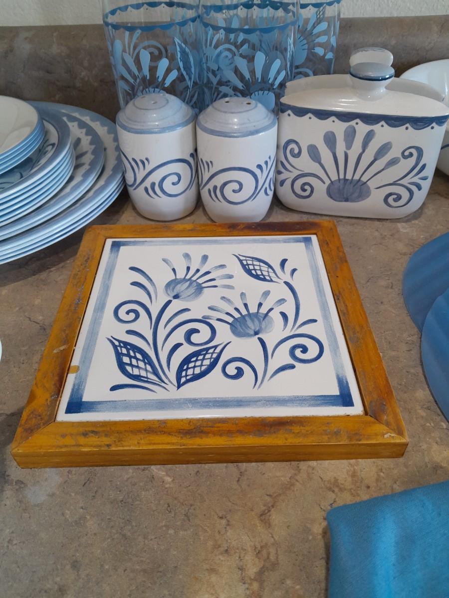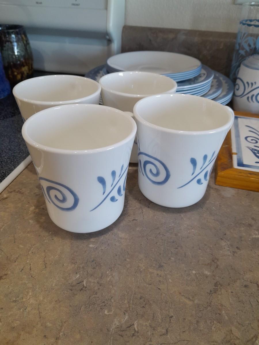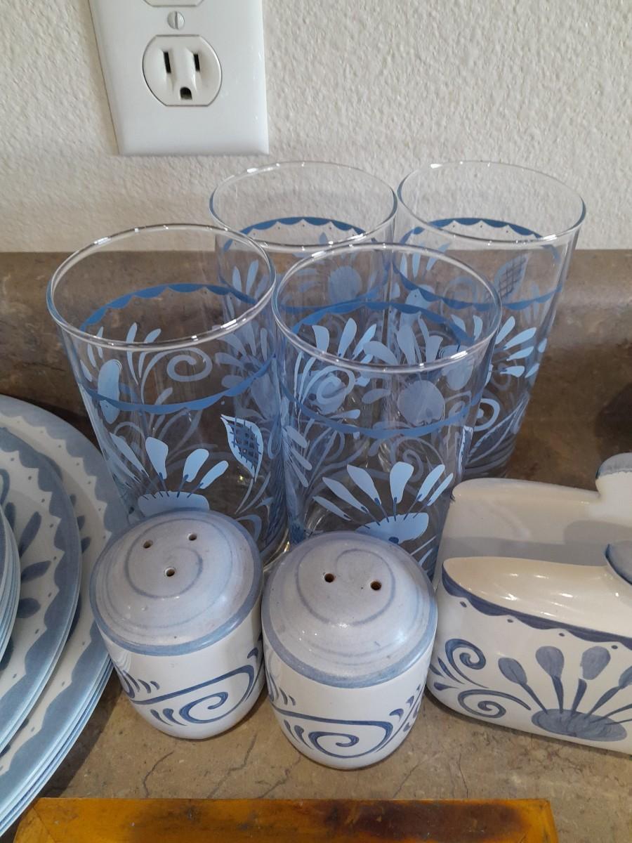 4 DRINKING GLASSES, NAPKIN HOLDER, SERVING BOWL, 4 COFFEE MUGS, SALT/PEPPER SHAKERS, HOT PLATE, 4 DINNER PLATES, 2 SALAD AND 6 BREAD PLATES, 4 SAUCERS, ROUND TABLECLOTH