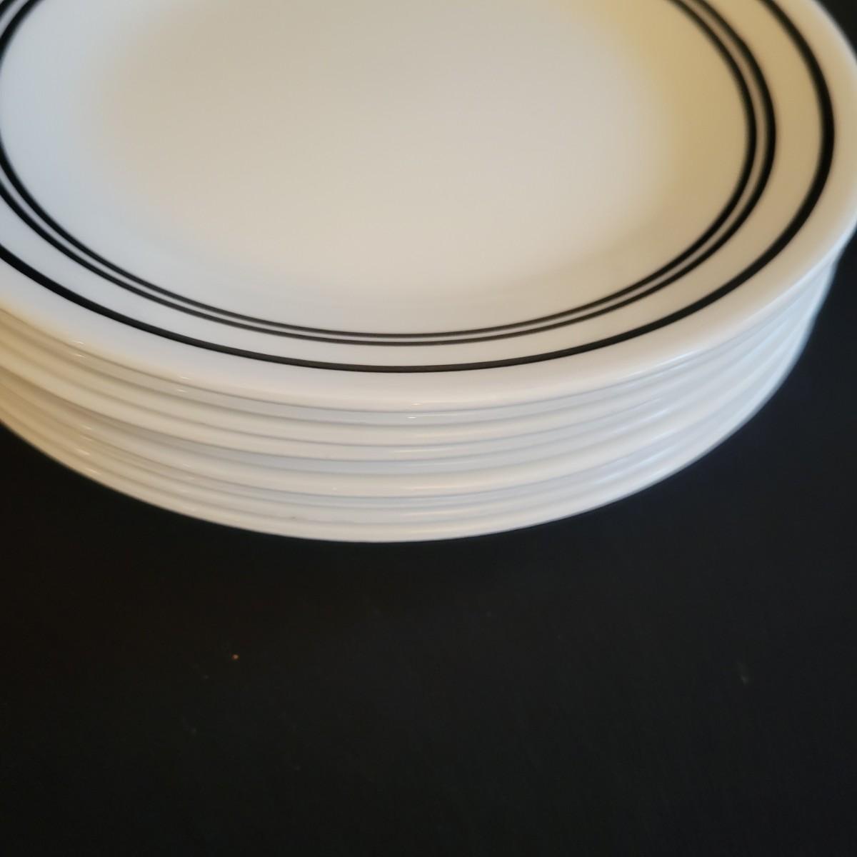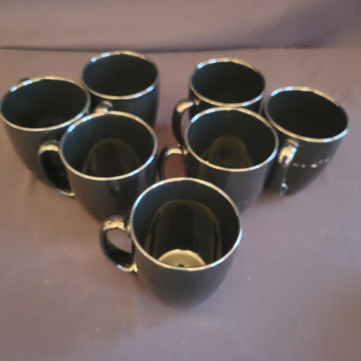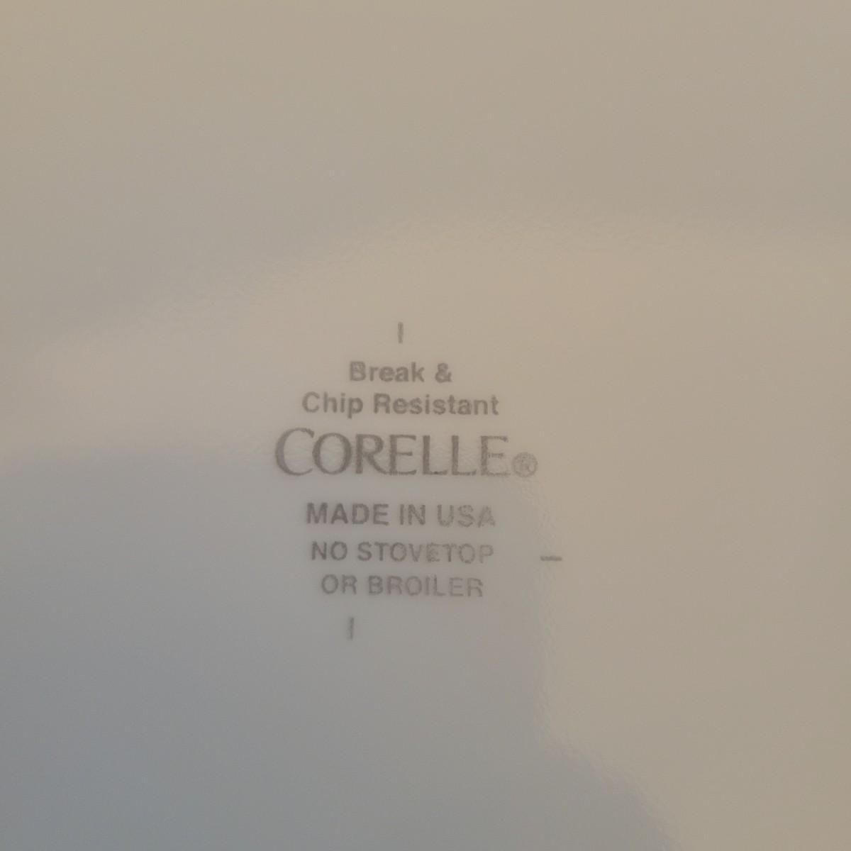 A collection of Corelle dinnerware and mugs with no chips. Included is nine dinner plates and salad plates, six bowls and seven mugs. Lot also includes a large salad bowl that measures approximately 9.5"D x 4"H. Local pickup only