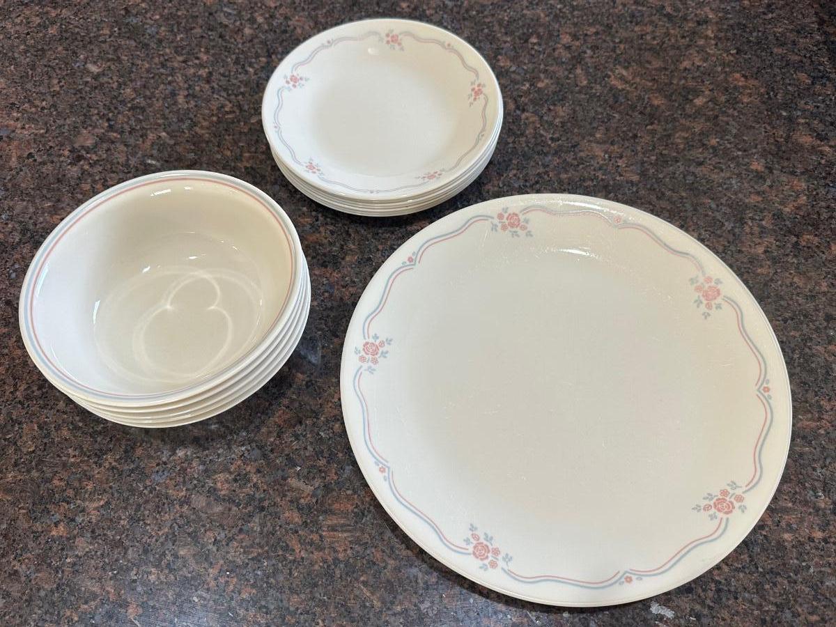 Corelle English breakfast pattern. 4 plates, 7 saucers, 6 bowls