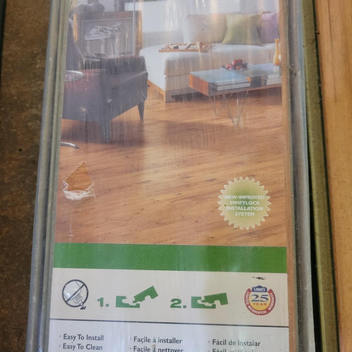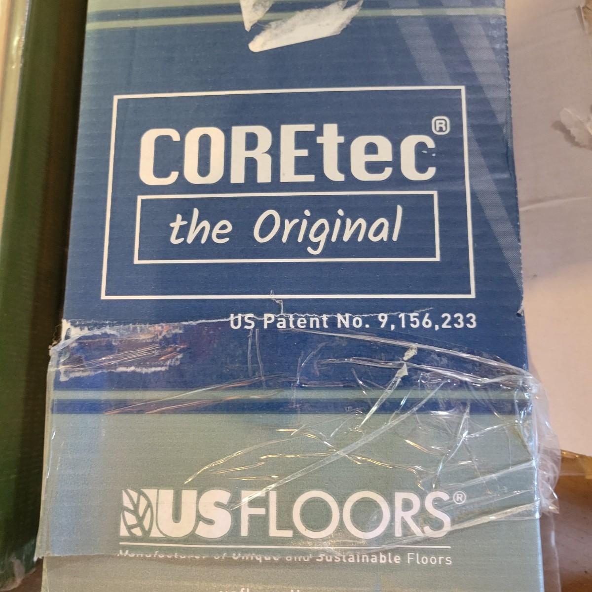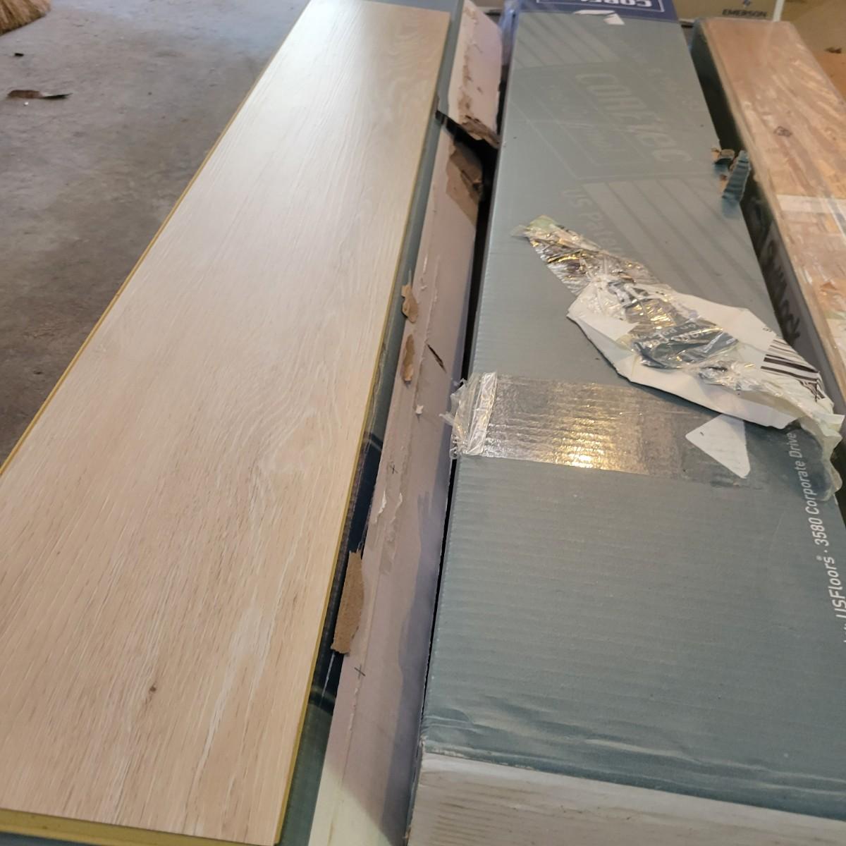 Two boxes of cortec flooring, eleven pieces of Armstrong flooring in good condition. Also includes a ClosetMaid corner shelf kit NIB. The coretec flooring has one unopened box and a box with thirteen pieces. A light pickled stain with wood grain and has cork bottoms. Pieces measure 7.5" x 43". The Armstrong Swiftlock flooring also has one unopened box. Heirloom hickory finish with a slight wood texture. Each piece measures approximately 5" x 51". Also includes the ClosetMaid corner shelf kit with a mahogany coloring and is in unopened packaging. Local pickup only