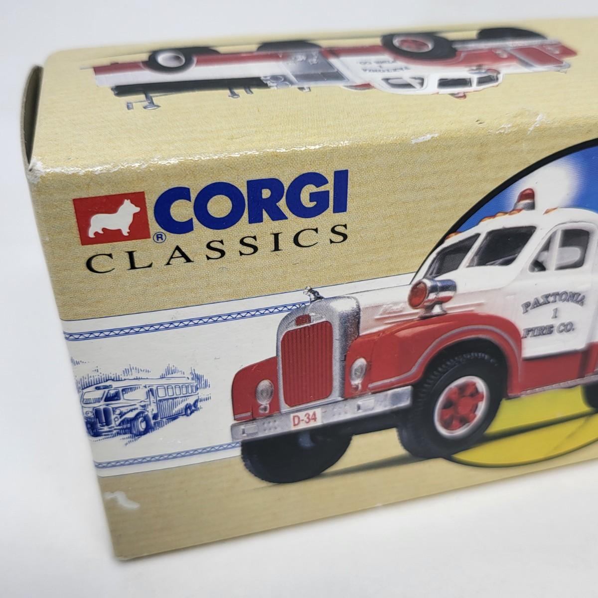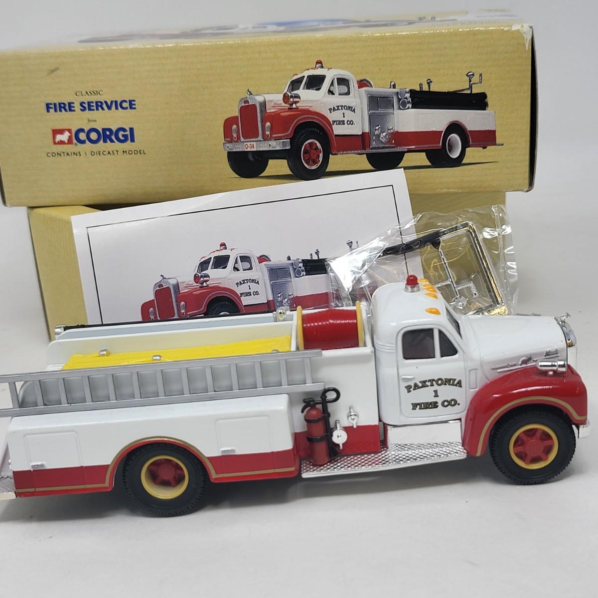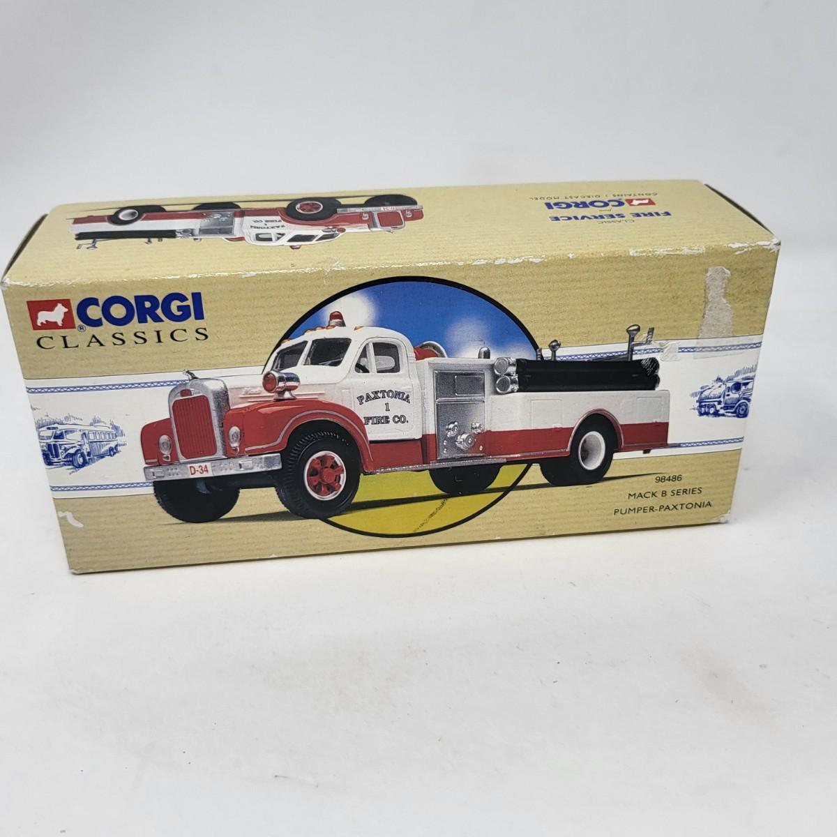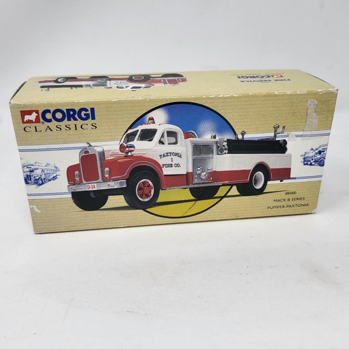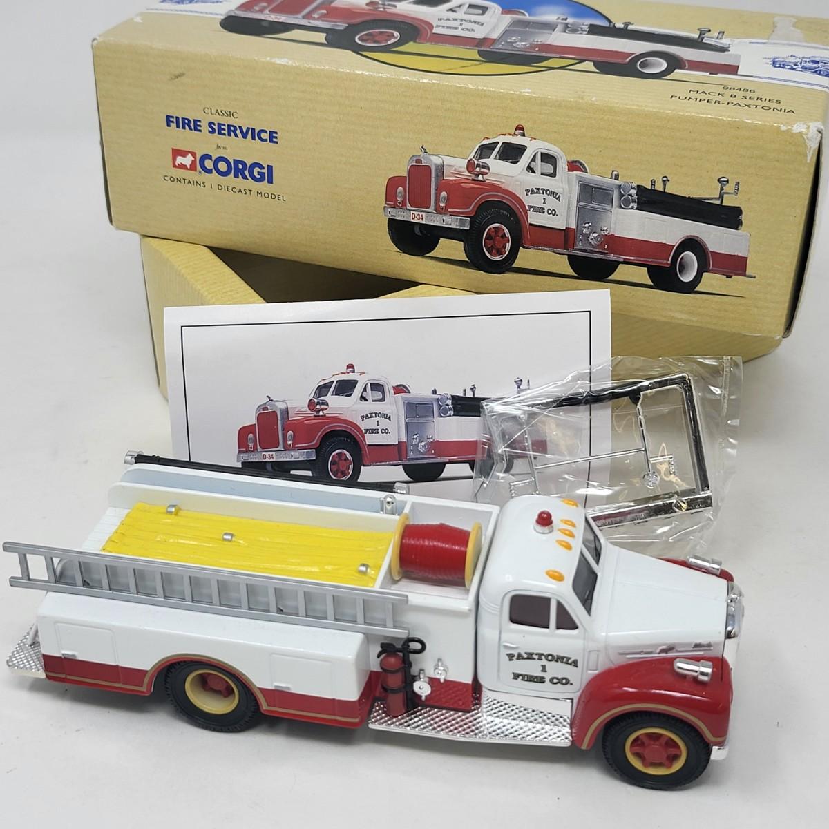 Corgi, collectible Mack B Series Pumper-Paxtonia Fire Truck, in original box, measures 6.25" long x 2" wide.