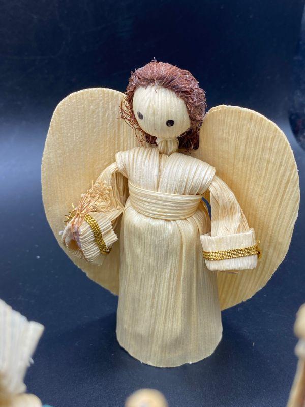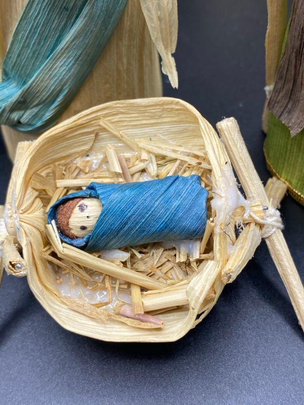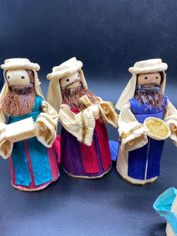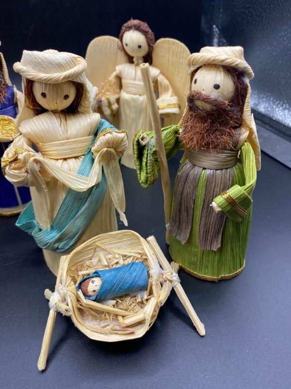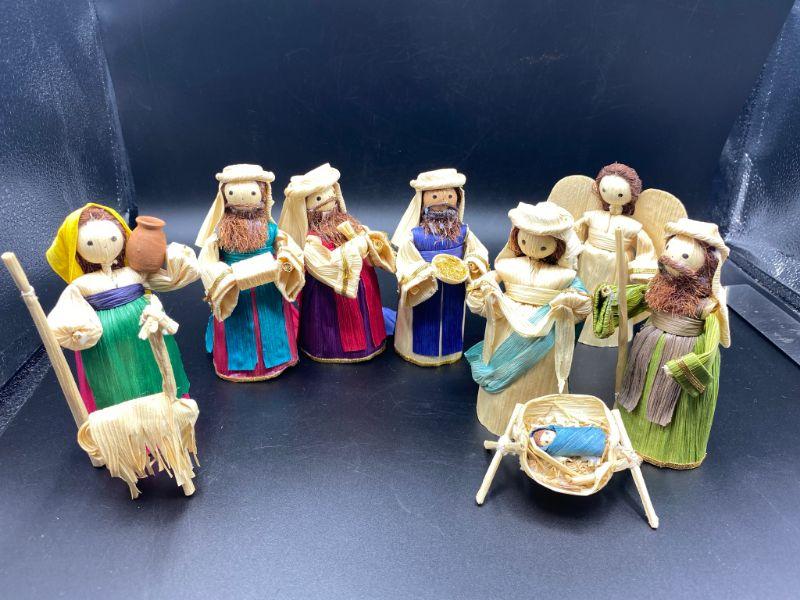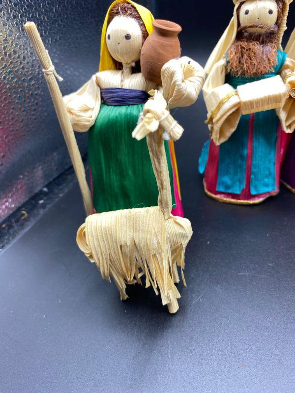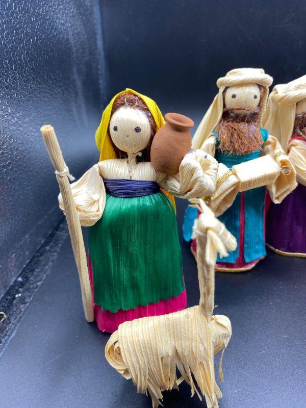Corn husk and palm Nativity scene. Colorfully painted. Unmarked.