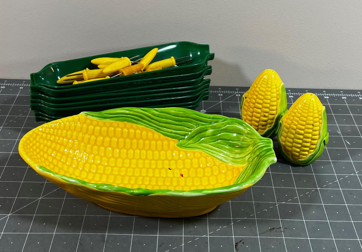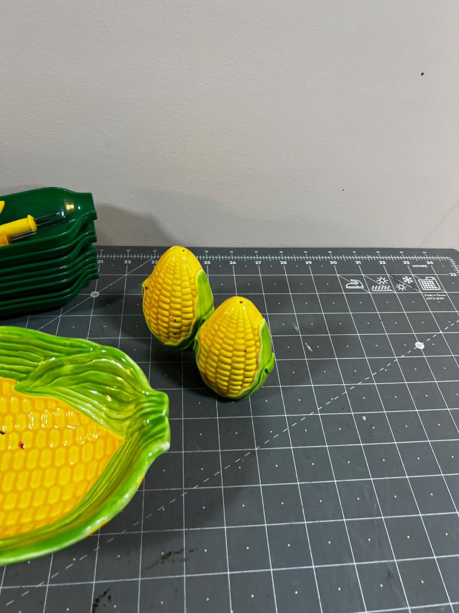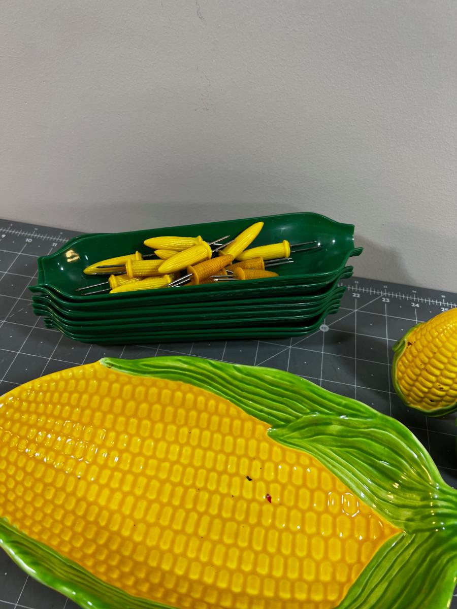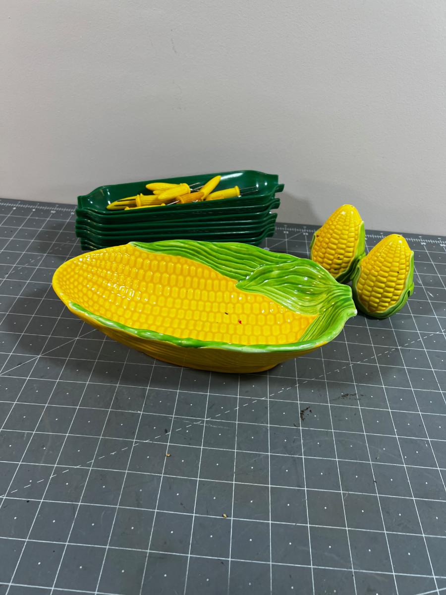 CORN Lot: Corn Holders, Corn Dishes and Dish Plus Salt & Pepper Corns